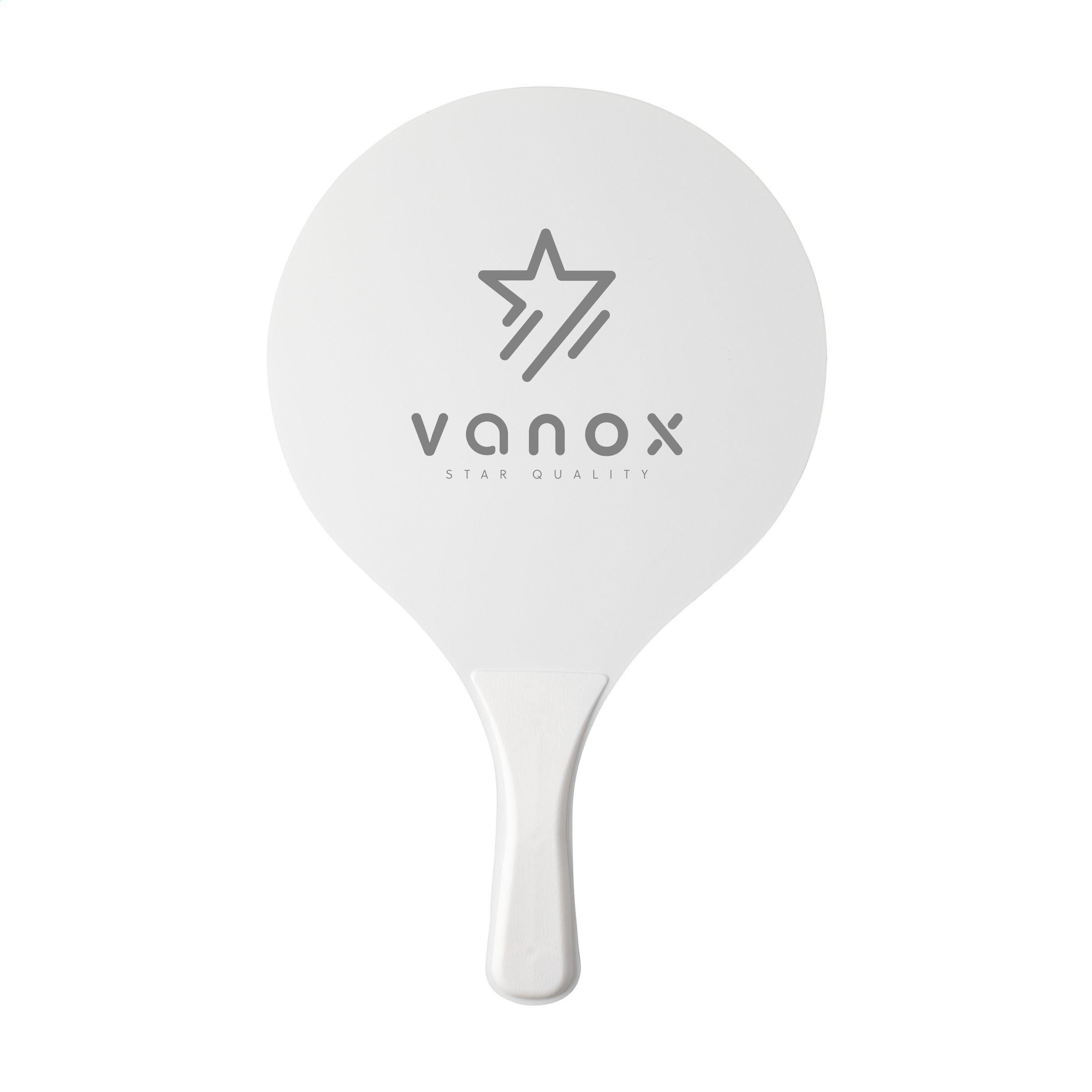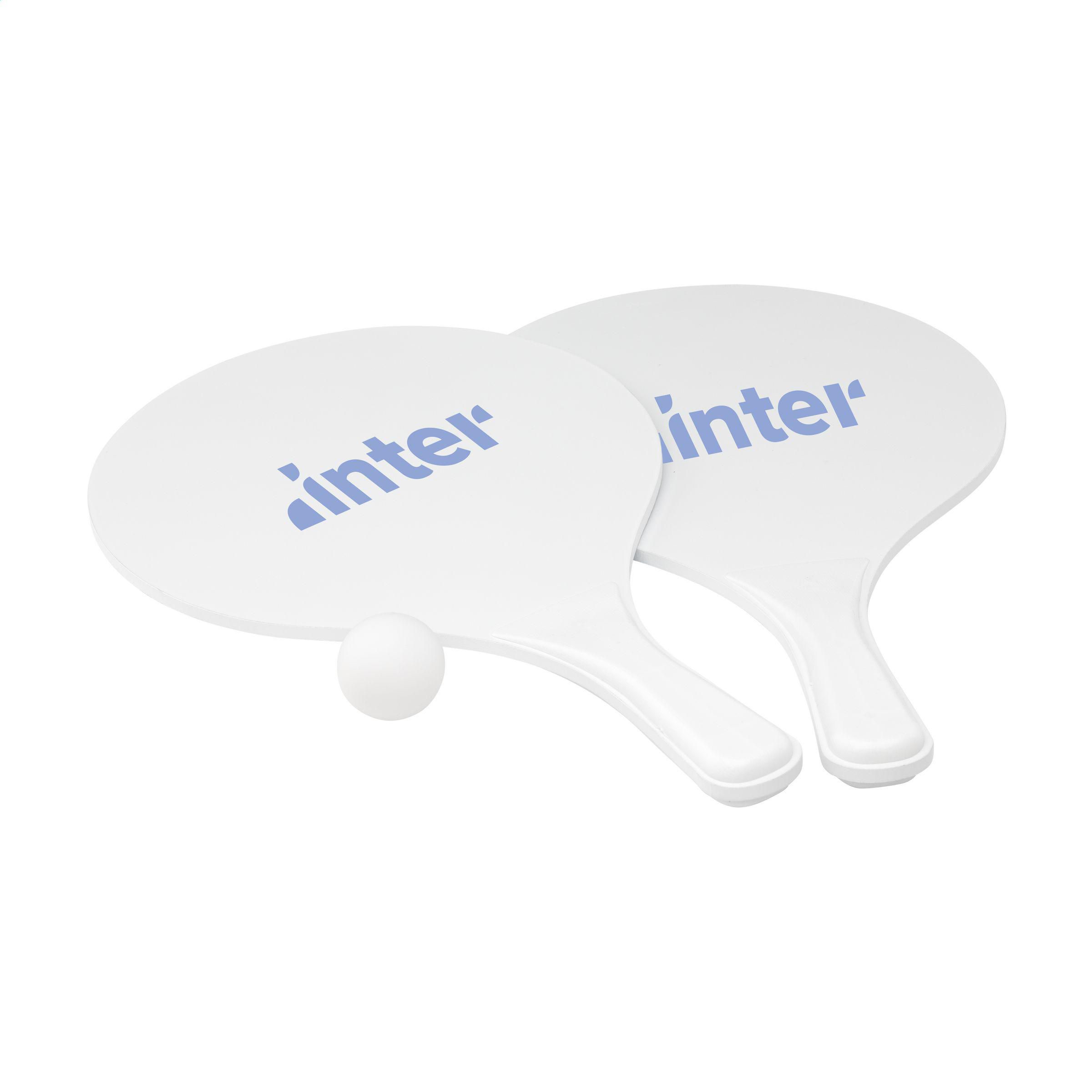 Sportliches Strandset: 2 Schläger aus MDF-Holz mit PP-Kunststoffgriffen und Gummiball. Pro Set in einem Netz zur Aufbewahrung.ACHTUNG: Bei einem 2-Farbendruck auf den Schlägern ist keine perfekte Passgenauigkeit möglich - dies ist nur gewährleistet, wenn sich die Farben nicht berühren.