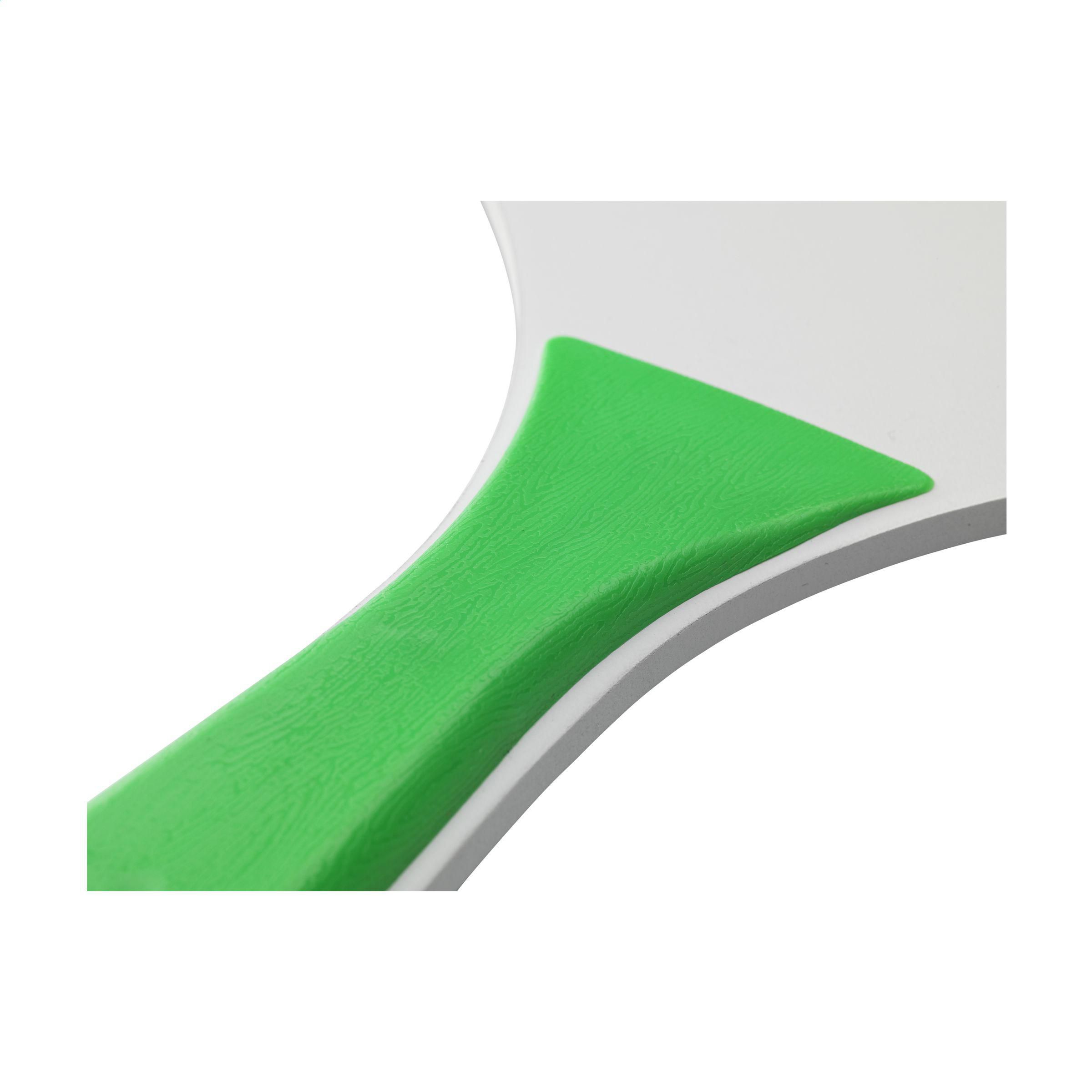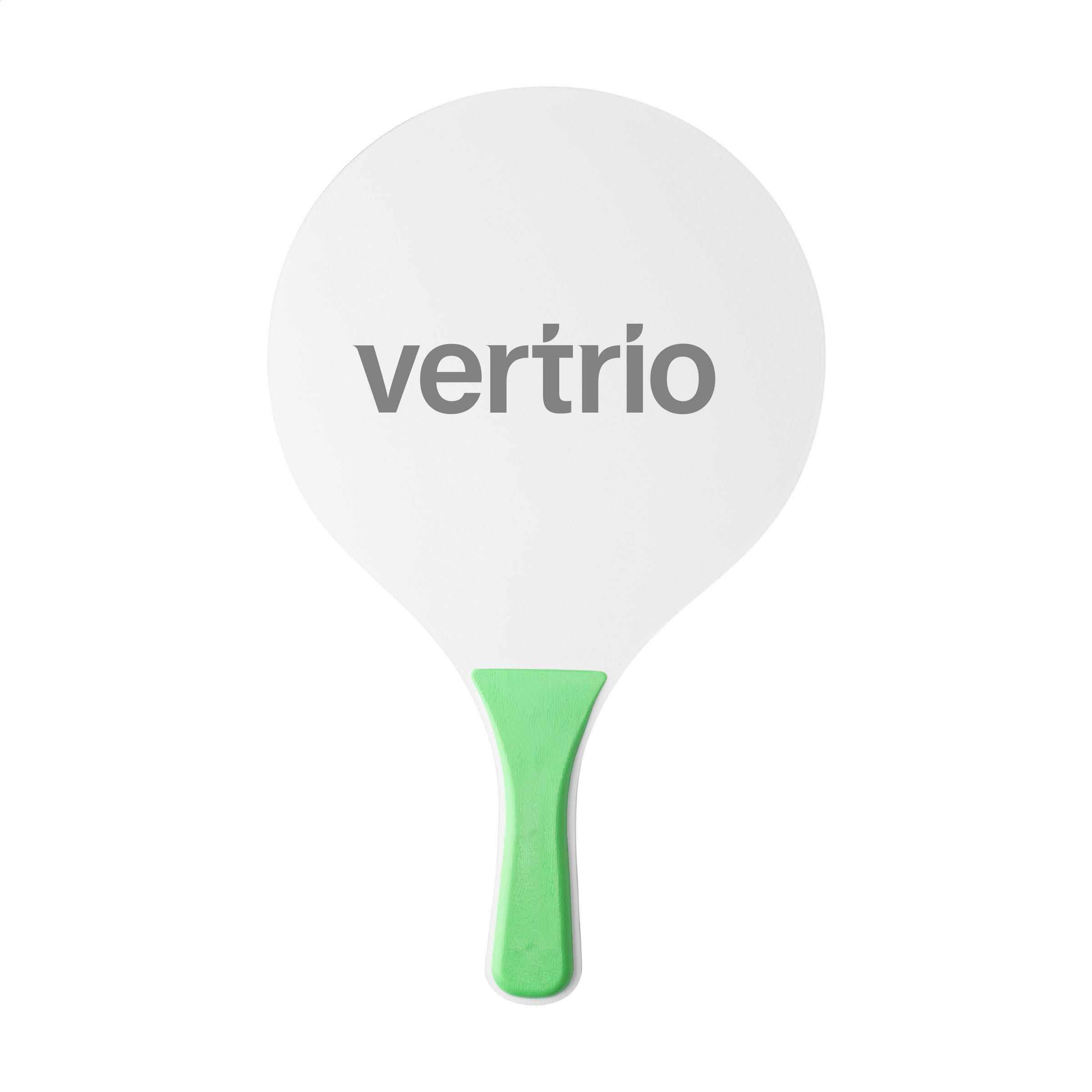Sportliches Strandset: 2 Schläger aus MDF-Holz mit PP-Kunststoffgriffen und Gummiball. Pro Set in einem Netz zur Aufbewahrung.ACHTUNG: Bei einem 2-Farbendruck auf den Schlägern ist keine perfekte Passgenauigkeit möglich - dies ist nur gewährleistet, wenn sich die Farben nicht berühren.