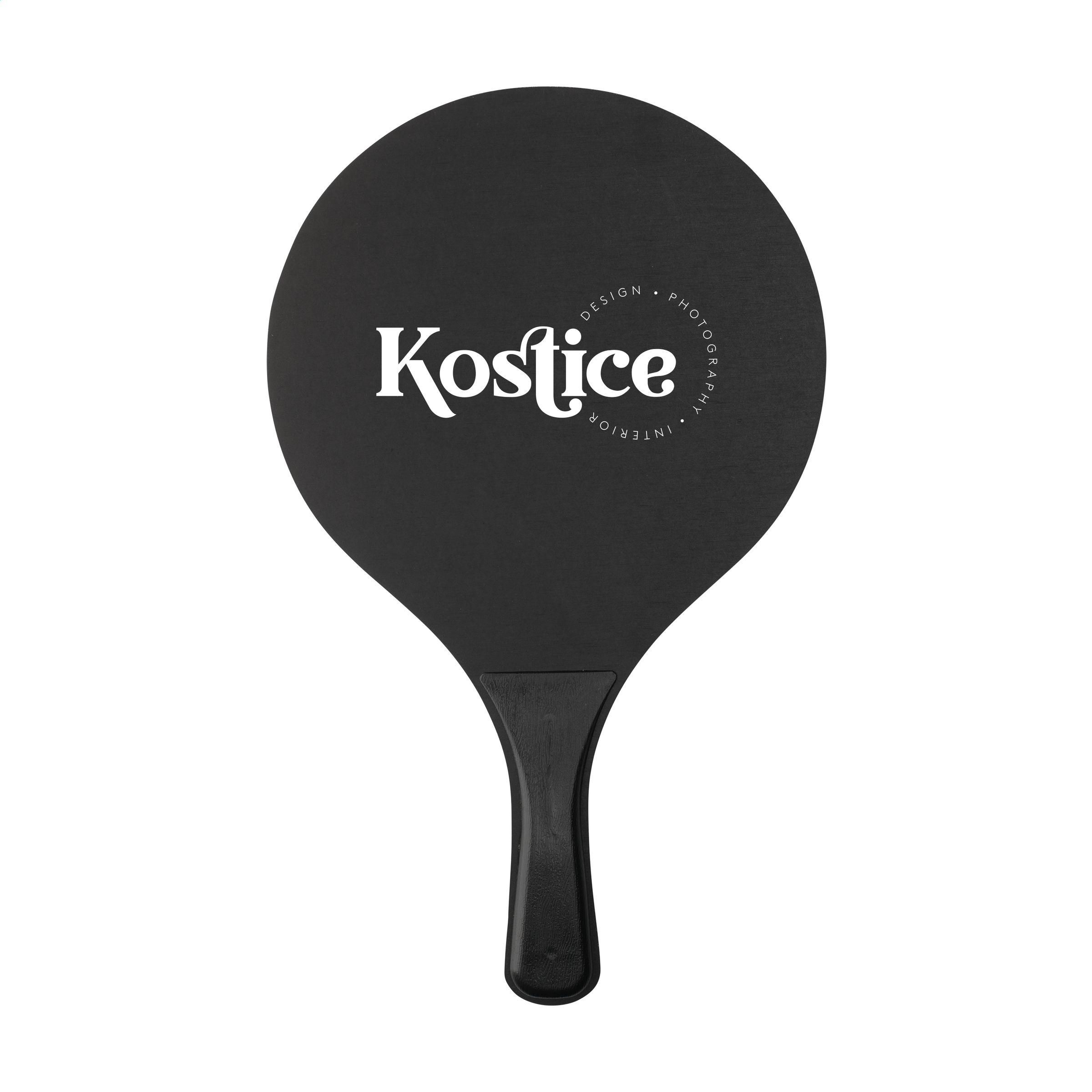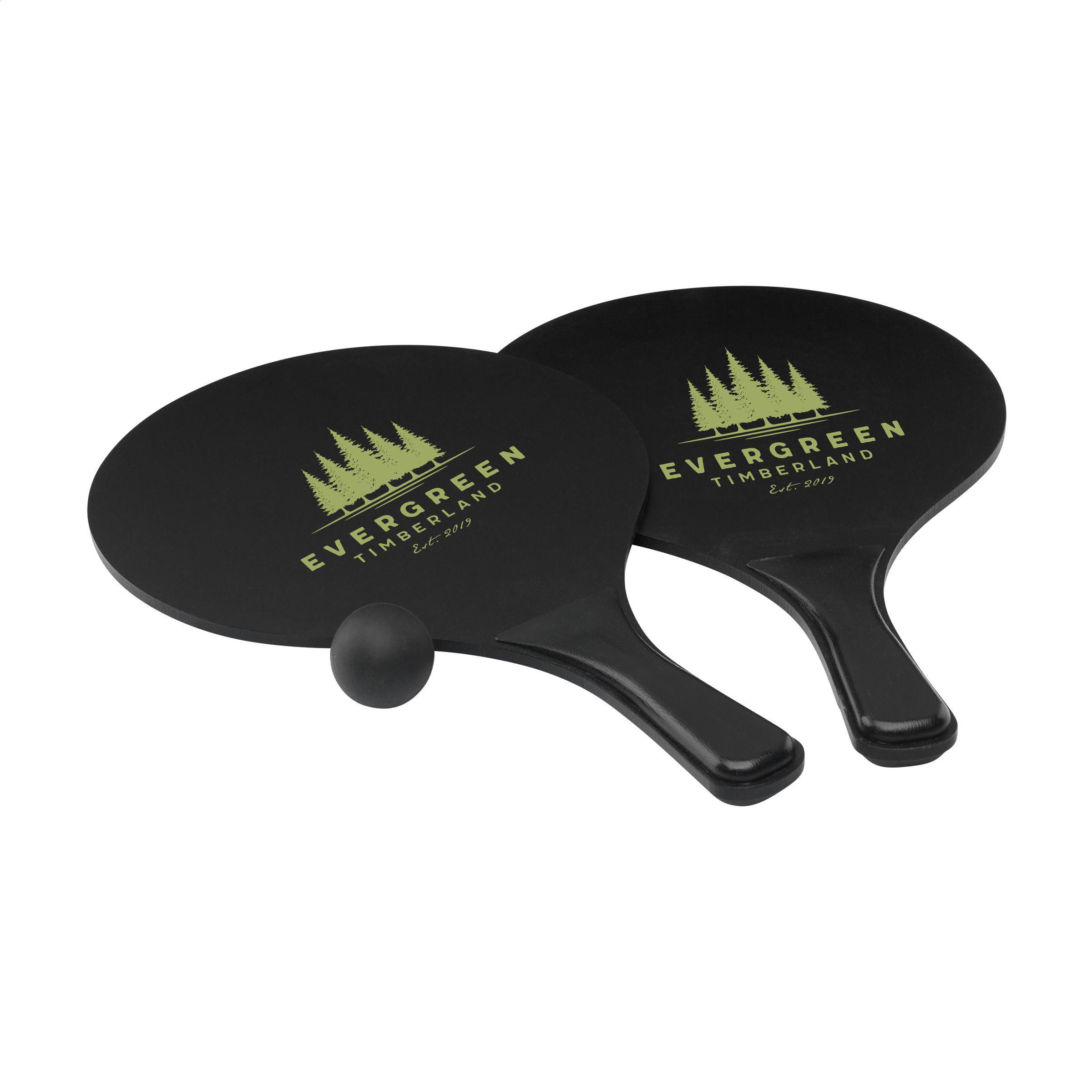Sportliches Strandset: 2 Schläger aus MDF-Holz mit PP-Kunststoffgriffen und Gummiball. Pro Set in einem Netz zur Aufbewahrung.ACHTUNG: Bei einem 2-Farbendruck auf den Schlägern ist keine perfekte Passgenauigkeit möglich - dies ist nur gewährleistet, wenn sich die Farben nicht berühren.