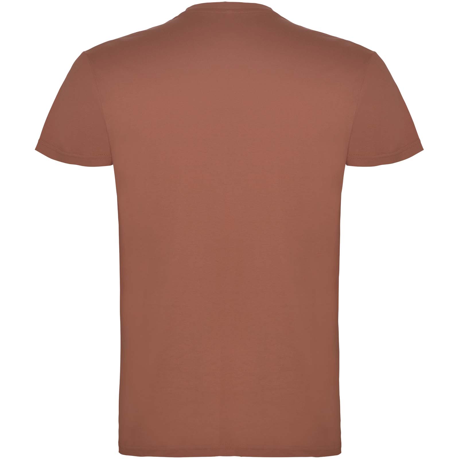 Kurzärmeliges T-Shirt mit doppellagigem Rundhalsausschnitt aus Elasthan, hergestellt aus schlauchförmigem Material für Erwachsene. Verstärkte und verdeckte Nähte am Kragen. Herausnehmbares Etikett. Das Modell ist 190 cm groß und trägt Größe L.