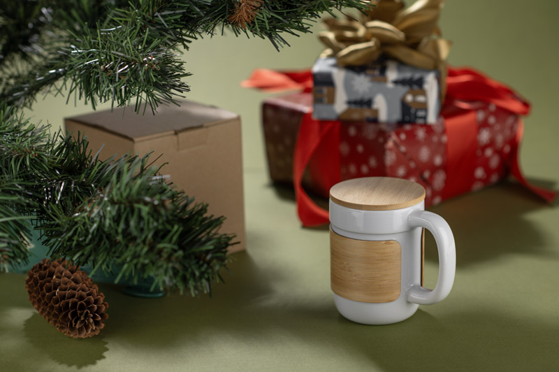Der 350-ml-Becher von MUGGI kombiniert eine klassische Form mit modernen Details. Er ist aus hochwertiger Keramik gefertigt und wird mit einem Deckel aus Bambus und einem passenden Thermoband geliefert, das Ihre Hände vor der Hitze des Getränks schützt. Der Deckel kann auch als Untertasse verwendet werden, was den Komfort erhöht. Die natürlichen Bambusakzente verleihen der Tasse ein einzigartiges, ansprechendes Aussehen, und der robuste Griff sorgt für einen bequemen Halt. Ideal für das Büro oder als Teil eines Geschenksets.
