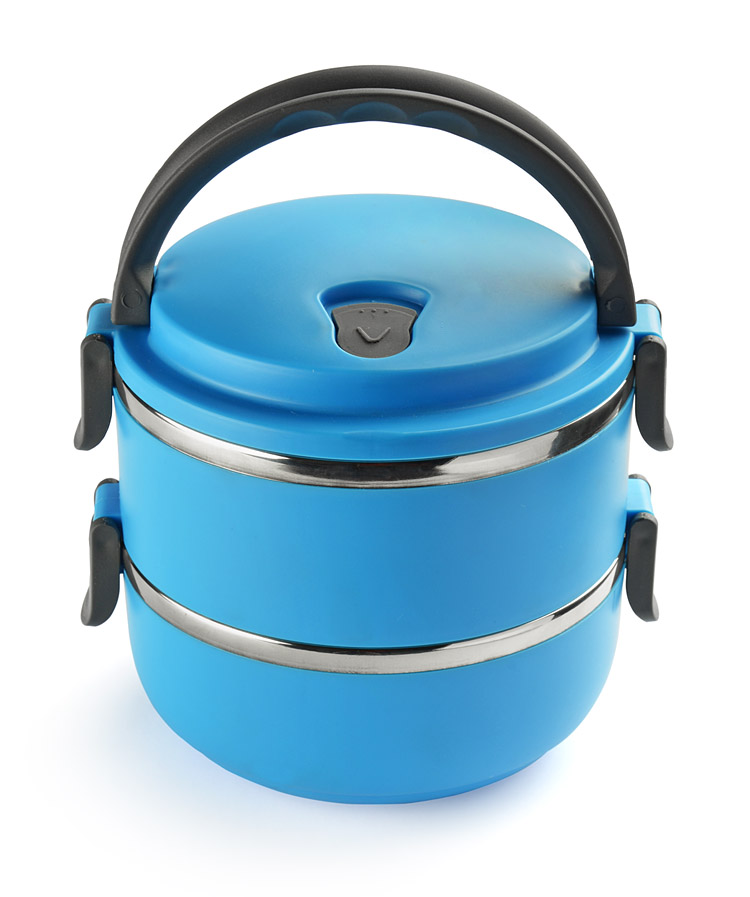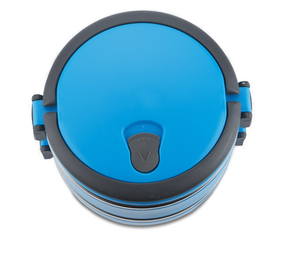 Ein Behälter mit Innenraum aus Edelstahl, der in zwei Kammern unterteilt ist, die eine auf die andere gelegt wird, was wiederum eine handliche und bequeme Verlagerung von 2-Gänge-Gerichten ermöglicht. Die obere Kammer ist mit einer Dichtung ausgestattet. Einklappbare Kunststoffgriffe. Gesamtfassungsvermögen: 1400 ml.