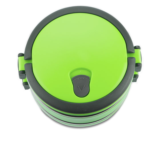 Ein Behälter mit Innenraum aus Edelstahl, der in zwei Kammern unterteilt ist, die eine auf die andere gelegt wird, was wiederum eine handliche und bequeme Verlagerung von 2-Gänge-Gerichten ermöglicht. Die obere Kammer ist mit einer Dichtung ausgestattet. Einklappbare Kunststoffgriffe. Gesamtfassungsvermögen: 1400 ml.