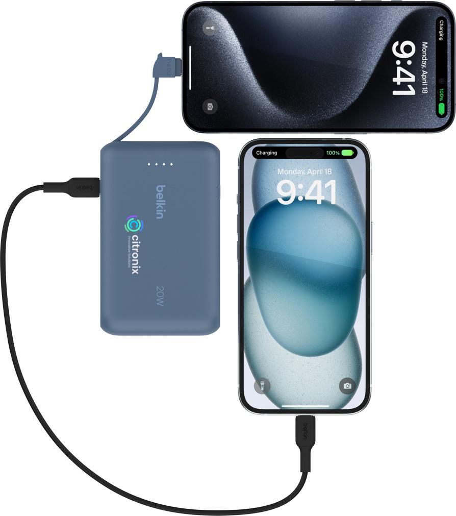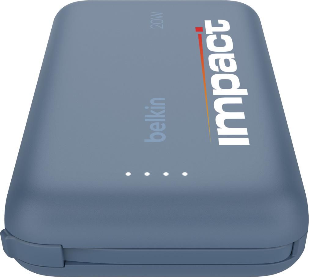 Powerbank 10.000 mAh mit integriertem Kabel, von der Marke Belkin. Das Gehäuse (ohne Kabel) besteht zu 72% aus recycelten Materialien. Mit Pass-Through-Ladefunktion: Geräte können aufgeladen werden, während die Powerbank selbst aufgeladen wird. Laden Sie zwei Geräte gleichzeitig mit einer Leistung von bis zu 20 W über das integrierte USB-C-Kabel und den zusätzlichen Anschluss. Diese Powerbank bietet bis zu 43 Stunden zusätzliche Akkulaufzeit in einem kompakten und leichten Gehäuse. Mit LED-Anzeigeleuchte. Mit LED-Anzeigeleuchte. 100% kunststofffreie Verpackung. Hergestellt aus recyceltem Kunststoff. Inklusive Gebrauchsanweisung.