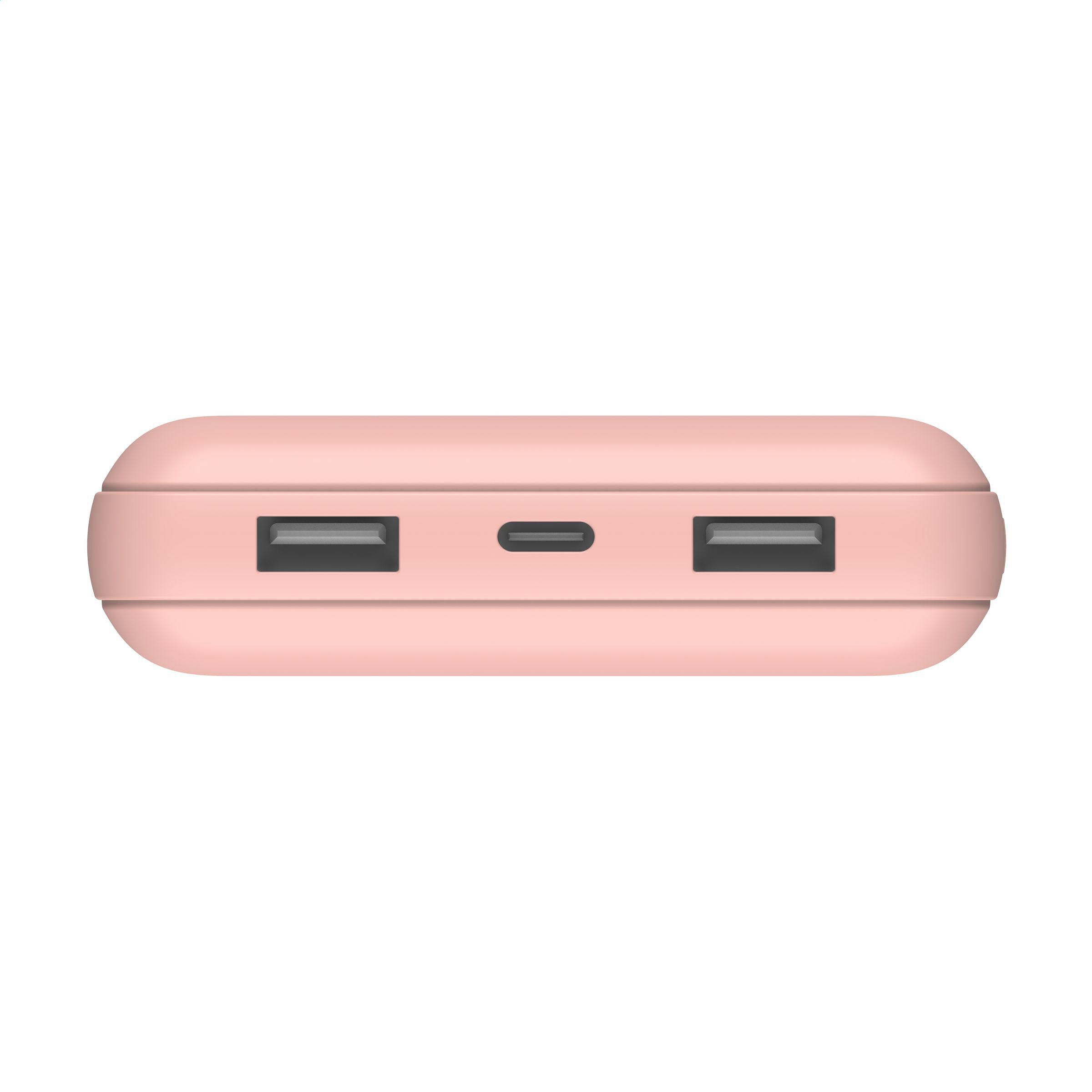 Powerbank 20.000 mAh der Marke Belkin. Ausgestattet mit einem Gehäuse aus recyceltem Kunststoff. Schnelles Aufladen von Smartphones und anderen Geräten mit bis zu 15W Leistung über zwei USB-A-Anschlüsse und einen USB-C-Anschluss. Diese Powerbank bietet eine zusätzliche Akkulaufzeit von bis zu 78 Stunden. Genug, um Filme zu schauen, FaceTime-Anrufe zu tätigen und Navigations-Apps zu nutzen. Mit LED-Kontrollleuchte. Die Powerbank erfüllt die Sicherheitsstandards von Fluggesellschaften, sodass Sie sie im Handgepäck mitnehmen können. Inklusive USB-A/USB-C-Kabel und Gebrauchsanweisung. 100% plastikfreie Verpackung. Hergestellt aus Kunststoff, der nach Gebrauch recycelt wurde.