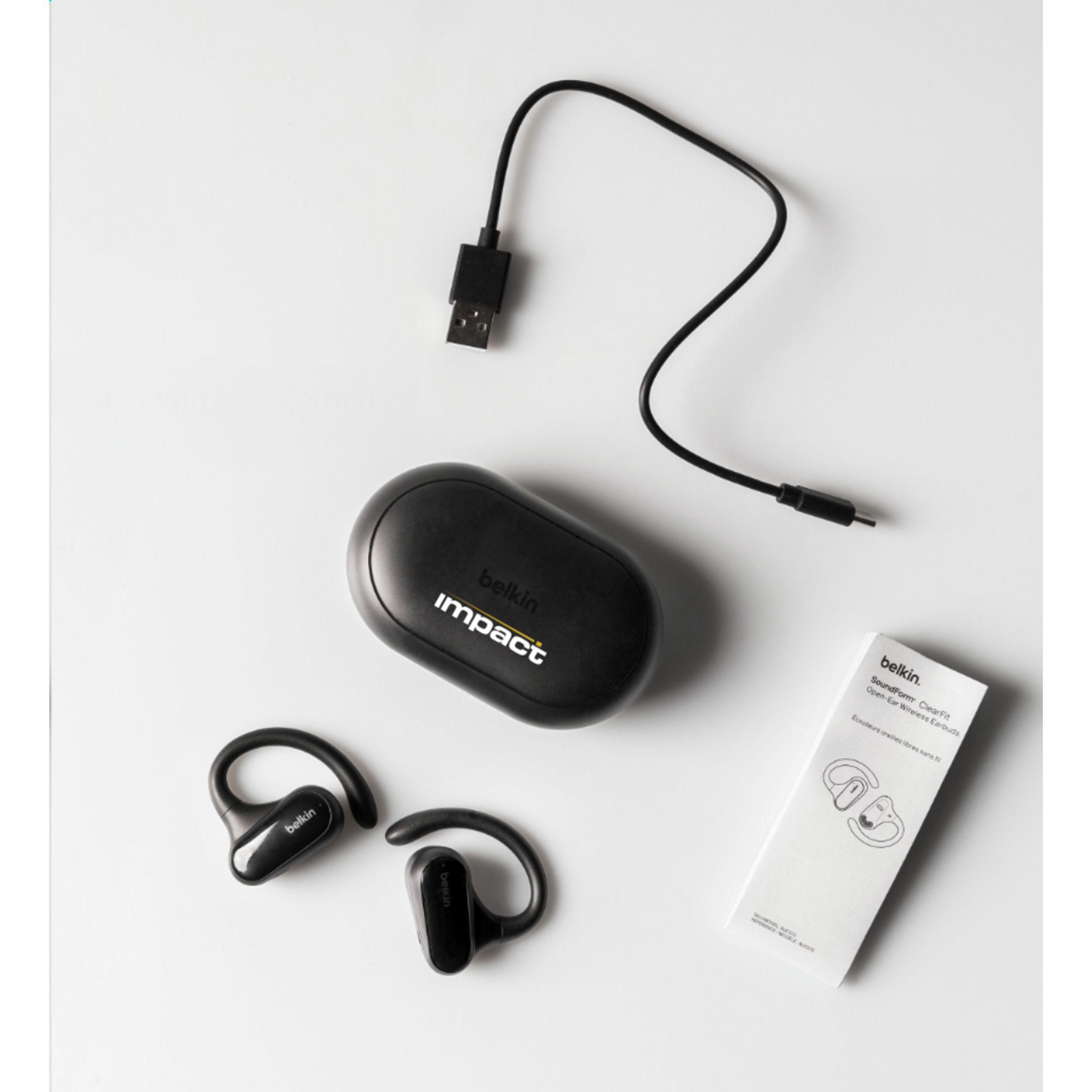 Open-Ear-Ohrhörer der Marke Belkin. Diese Ohrhörer sind ideal für Sport, Outdoor-Aktivitäten und Workouts und sitzen gut, ohne dass Sie sie in die Ohren stecken müssen. Die Clear Call Quality-Technologie reduziert Hintergrundgeräusche beim Telefonieren und die Bluetooth Multipoint-Technologie ermöglicht die einfache Kopplung der Ohrhörer mit zwei Geräten, sodass Sie bequem zwischen beiden Geräten wechseln können. Lassen Sie sie problemlos mit einem Laptop, iPad oder anderen mobilen Geräten koppeln. IPX5-zertifiziert: schweißresistent und spritzwassergeschützt. 14,2-mm-Treiber für guten, klaren Klang, jeden Tag. Belkin Signature Sound für vollen, ausgewogenen HiFi-Klang. Lange Akkulaufzeit von bis zu 8 Stunden für ununterbrochenen Gebrauch: 18 Stunden zusätzliche Nutzungszeit in Kombination mit dem Ladecase. Unterstützt schnelles Aufladen über USB-C: 10 Minuten Aufladen entsprechen 90 Minuten Hörzeit.Dank Bluetooth 5.3-Technologie kannst du diese SoundForm ClearFit-Ohrhörer kabellos mit allen Bluetooth-Geräten in einer Entfernung von bis zu 10 Metern verbinden. Die Ohrhörer sind aus recyceltem Kunststoff gefertigt. Inklusive USB-C-Ladecase, USB-C/USB-A-Ladekabel und Gebrauchsanweisung.