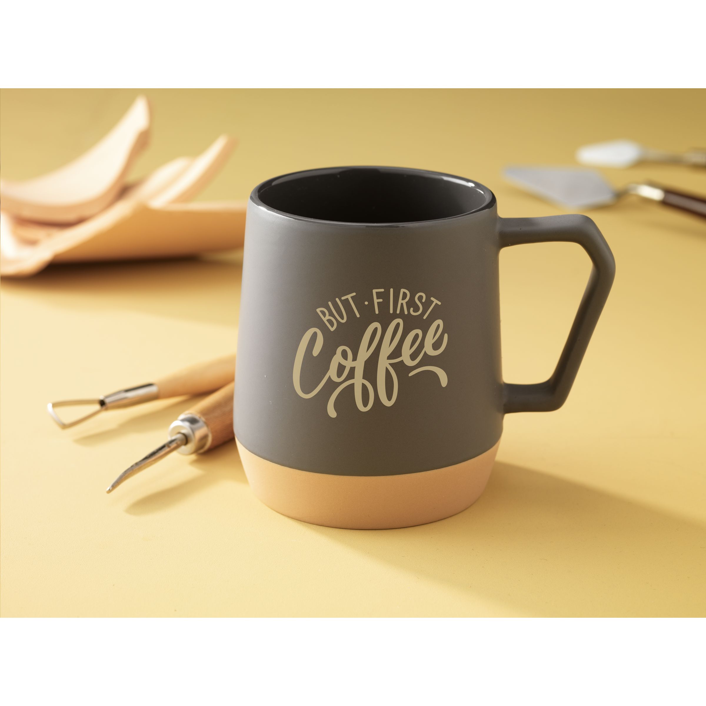 Becher mit Henkel aus hochwertiger Keramik und 5% recycelter Keramik. Die Innenseite ist hochglänzend ausgeführt. Der untere Teil des Bechers ist unglasiert und zeigt die natürliche, unbearbeitete Keramik. Natürliche Tonvariationen verleihen diesem Becher seinen einzigartigen Charakter. Spülmaschinengeeignet. Fassungsvermögen 330 ml. NOTIZ: Der weiße Becher kann nicht mit einer Lasergravur versehen werden, da diese nicht ausreichend sichtbar ist. Recycelte Keramikbecher werden hergestellt, indem Rohstoffe mit Bruchstücken von zerbrochenen oder unbrauchbaren Bechern, die in derselben Fabrik gesammelt wurden, vermischt werden. Die ausgemusterten Komponenten werden zu Pulver zermahlen und dann mit wichtigen Substanzen wie Kaolin und Quarz vermischt, bevor sie zu neuen Keramikprodukten verarbeitet werden. Um eine optimale Qualität zu gewährleisten, besteht das Endprodukt in der Regel zu 5 bis 10% aus recycelter Keramik. Die Verwendung von recycelter Keramik fördert die Kreislaufwirtschaft und reduziert den Bedarf an neuen Rohstoffen.