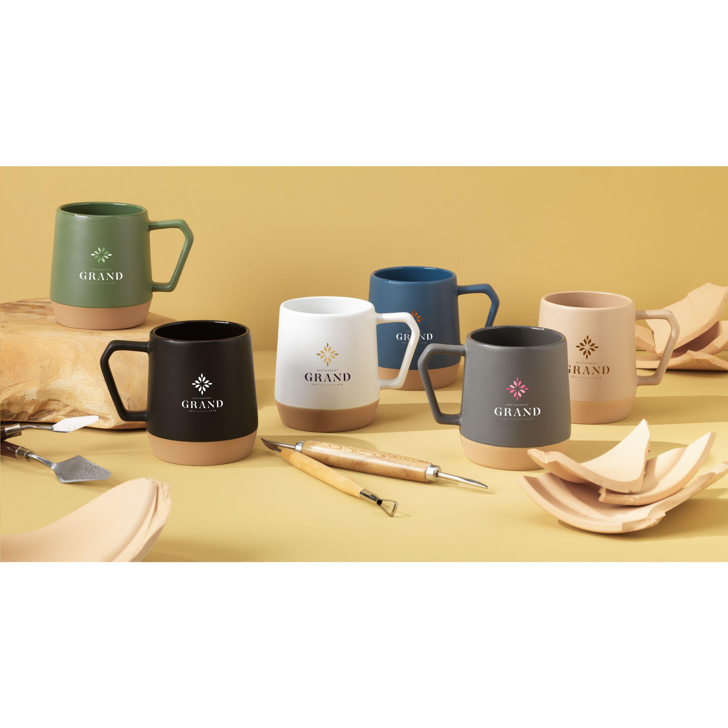 Becher mit Henkel aus hochwertiger Keramik und 5% recycelter Keramik. Die Innenseite ist hochglänzend ausgeführt. Der untere Teil des Bechers ist unglasiert und zeigt die natürliche, unbearbeitete Keramik. Natürliche Tonvariationen verleihen diesem Becher seinen einzigartigen Charakter. Spülmaschinengeeignet. Fassungsvermögen 330 ml. NOTIZ: Der weiße Becher kann nicht mit einer Lasergravur versehen werden, da diese nicht ausreichend sichtbar ist.Recycelte Keramikbecher werden hergestellt, indem Rohstoffe mit Bruchstücken von zerbrochenen oder unbrauchbaren Bechern, die in derselben Fabrik gesammelt wurden, vermischt werden. Die ausgemusterten Komponenten werden zu Pulver zermahlen und dann mit wichtigen Substanzen wie Kaolin und Quarz vermischt, bevor sie zu neuen Keramikprodukten verarbeitet werden. Um eine optimale Qualität zu gewährleisten, besteht das Endprodukt in der Regel zu 5 bis 10% aus recycelter Keramik. Die Verwendung von recycelter Keramik fördert die Kreislaufwirtschaft und reduziert den Bedarf an neuen Rohstoffen.