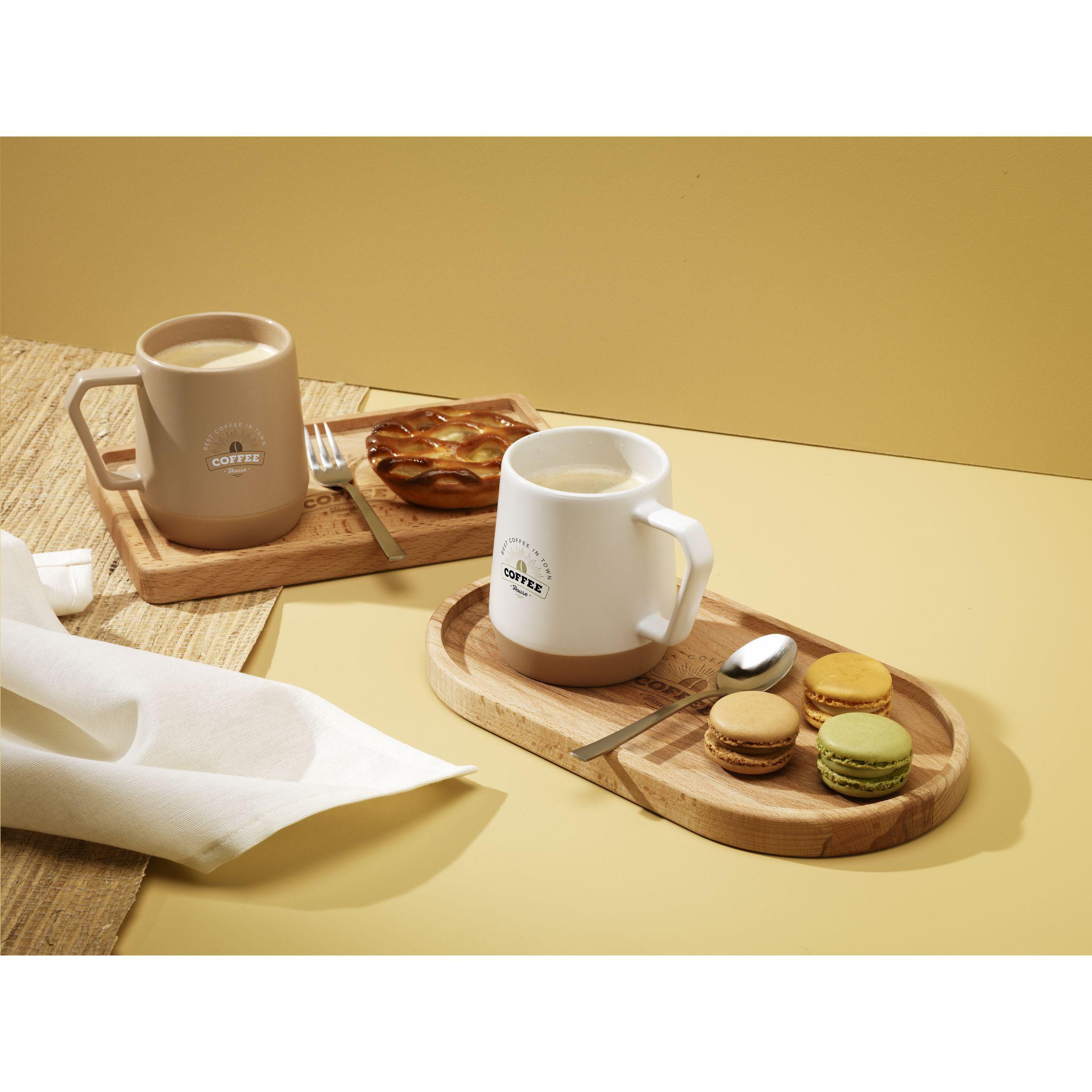 Becher mit Henkel aus hochwertiger Keramik und 5% recycelter Keramik. Die Innenseite ist hochglänzend ausgeführt. Der untere Teil des Bechers ist unglasiert und zeigt die natürliche, unbearbeitete Keramik. Natürliche Tonvariationen verleihen diesem Becher seinen einzigartigen Charakter. Spülmaschinengeeignet. Fassungsvermögen 330 ml. NOTIZ: Der weiße Becher kann nicht mit einer Lasergravur versehen werden, da diese nicht ausreichend sichtbar ist.Recycelte Keramikbecher werden hergestellt, indem Rohstoffe mit Bruchstücken von zerbrochenen oder unbrauchbaren Bechern, die in derselben Fabrik gesammelt wurden, vermischt werden. Die ausgemusterten Komponenten werden zu Pulver zermahlen und dann mit wichtigen Substanzen wie Kaolin und Quarz vermischt, bevor sie zu neuen Keramikprodukten verarbeitet werden. Um eine optimale Qualität zu gewährleisten, besteht das Endprodukt in der Regel zu 5 bis 10% aus recycelter Keramik. Die Verwendung von recycelter Keramik fördert die Kreislaufwirtschaft und reduziert den Bedarf an neuen Rohstoffen.