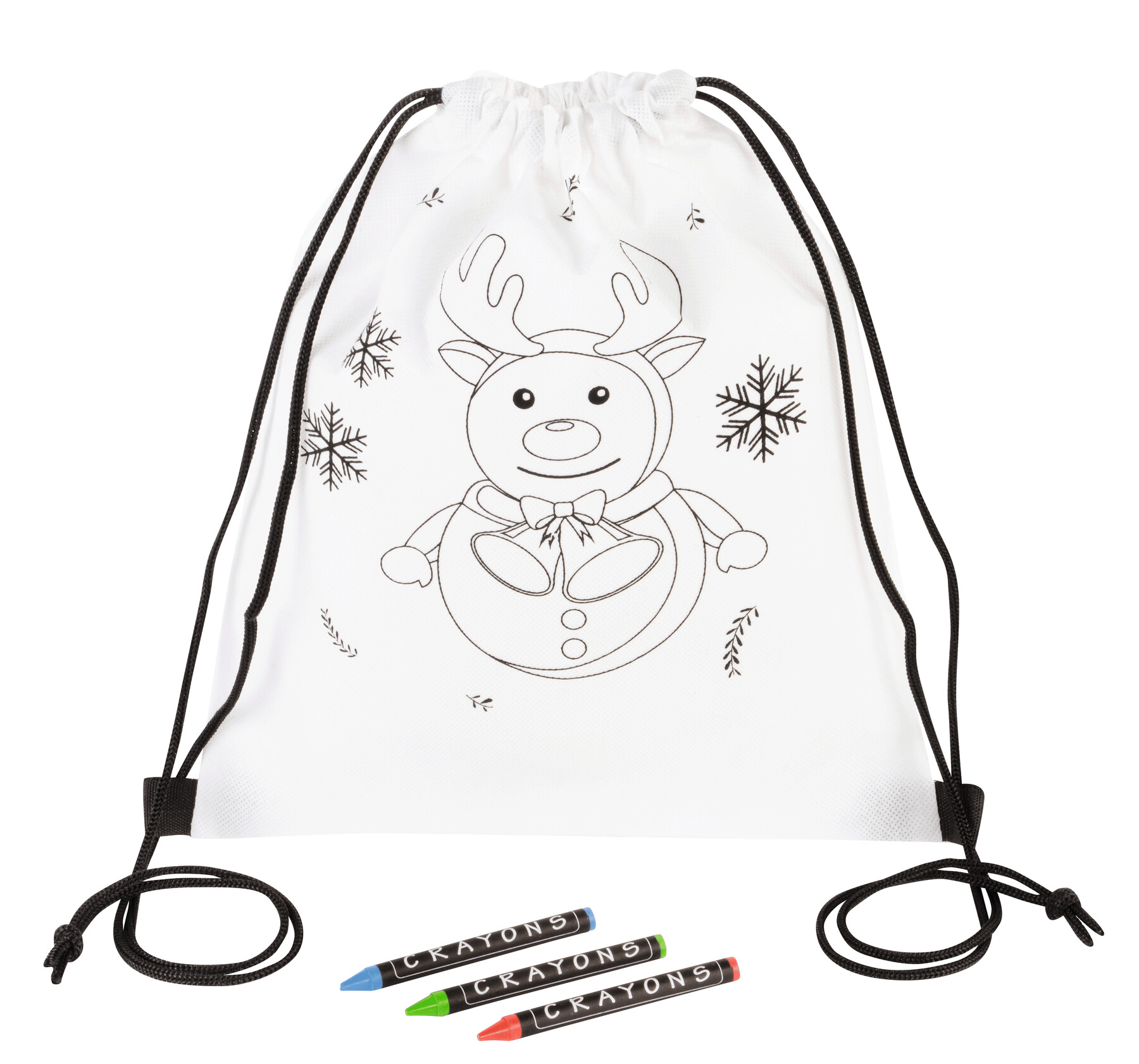 Bemalbarer Turnbeutel COLOURFUL ELK: mit Kordelzug und Weihnachtsmotiv zum Ausmalen auf der Vorderseite, inkl. 3 verschiedenfarbigen Wachsmalstiften (rot, grün, blau)