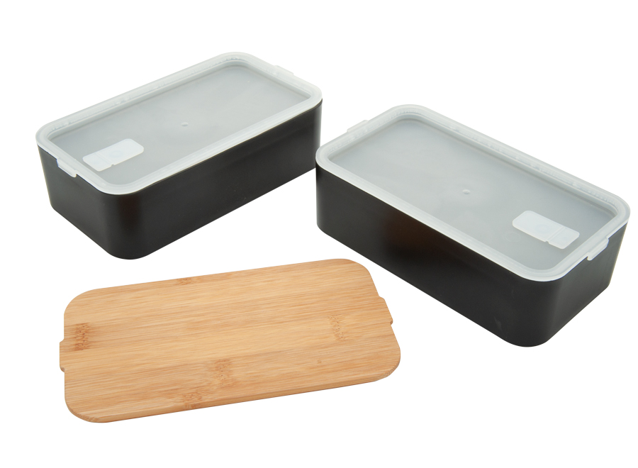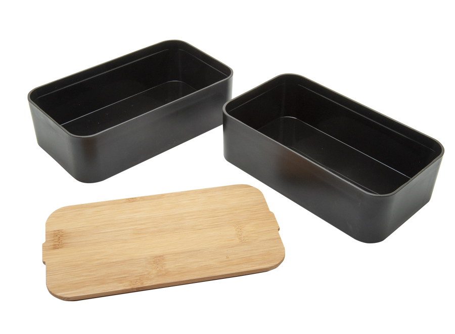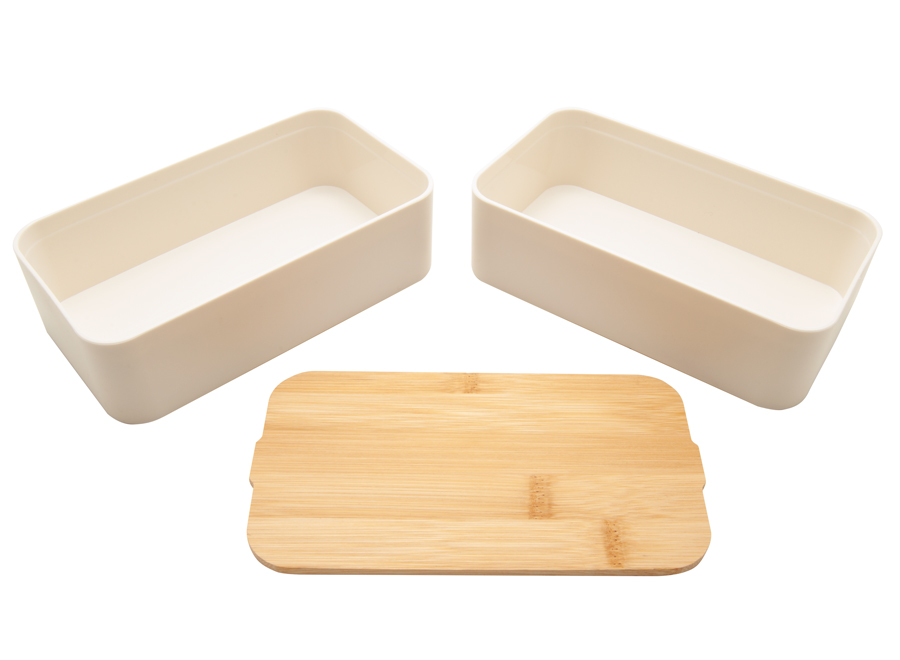 Lunchbox mit doppeltem Fach. Zwei Behälter aus Polypropylen und zwei Trennwände aus Polyethylen mit Silikondichtungen und Vakuumverschlusssystem für perfekte Abdichtung. Deckel aus Bambus. Kompatibel (ohne Deckel) mit Spülmaschine (max. 50 °C), Gefrierschrank und Mikrowelle (max. 100 °C und 2 Minuten). Fassungsvermögen: 1,4 Liter. Die Vorteile in Kürze: - Materialien entsprechen den neuesten Lebensmittelstandards. - Perfekte Abdichtung durch Zugabe von zwei Trennwänden mit Silikondichtung und Vakuumverschlusssystem. - Eleganter Bambusdeckel, der auch als Schneidebrett verwendet werden kann. - Spülmaschinen-, Gefrierschrank- und Mikrowellengeeignet. - Großes Fassungsvermögen, aufgeteilt in 2 Fächer.