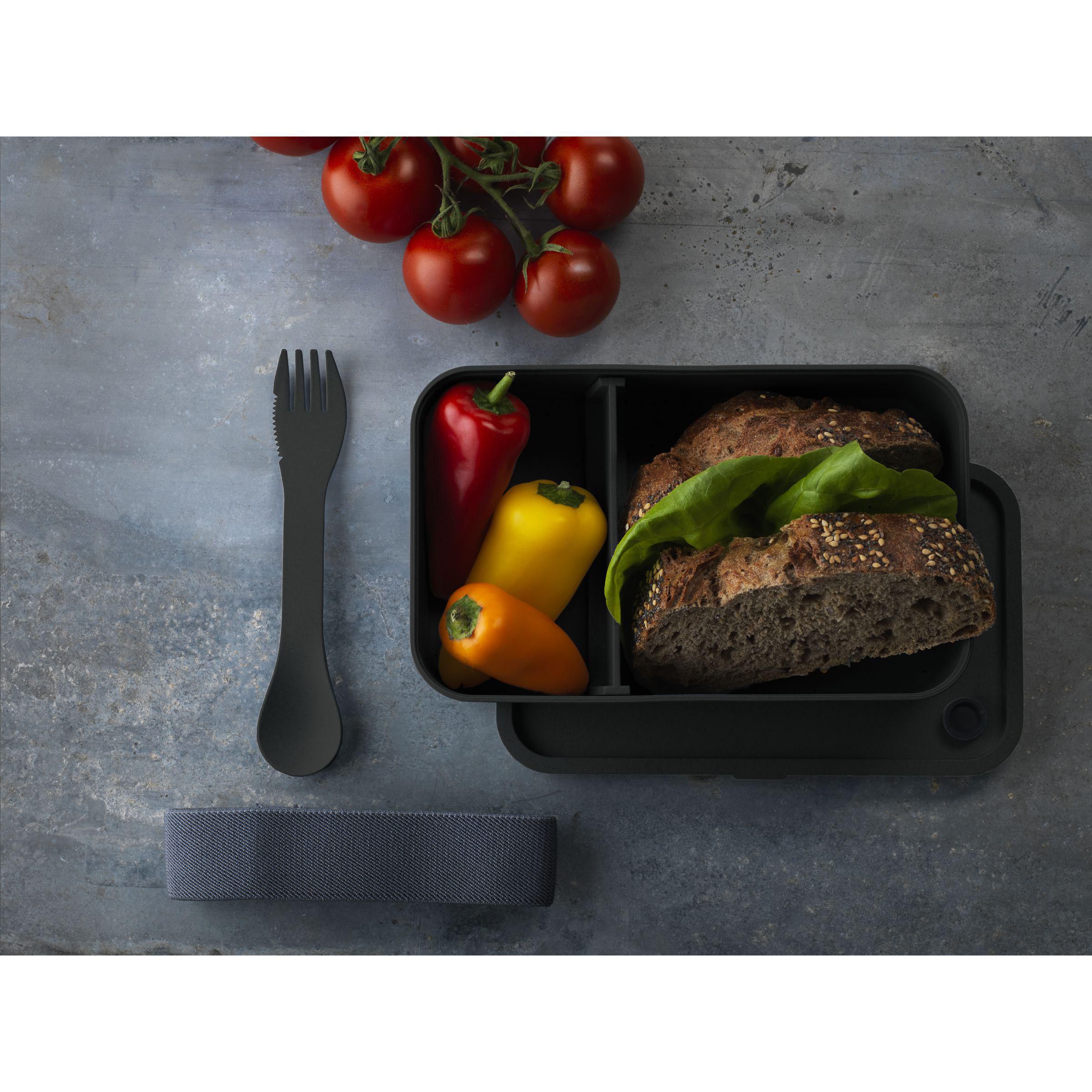 Lunchbox aus PP-Kunststoff. Der perfekt schließende Deckel hat einen Silikondichtring und eine Belüftungsöffnung mit Silikonkappe. Inklusive 3-in-1-Gabel, -Löffel und -Messer. Mit herausnehmbarer Trennwand und Verschlussgummi. Diese Box kann in den Kühlschrank gestellt werden und ist somit auch als luftdichte Frischhaltebox verwendbar. Geeignet für den Einsatz in der Mikrowelle und im Gefrierschrank. Nicht spülmaschinengeeignet.