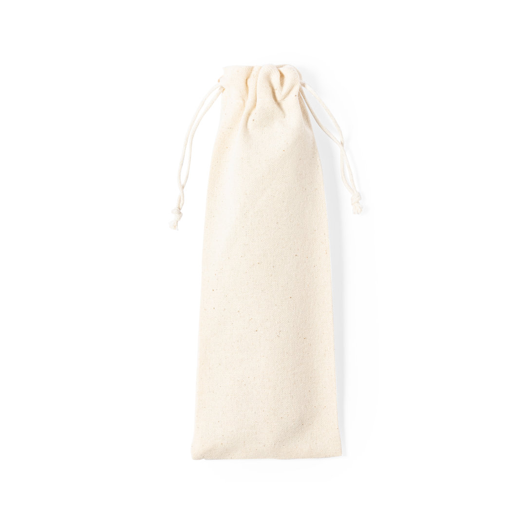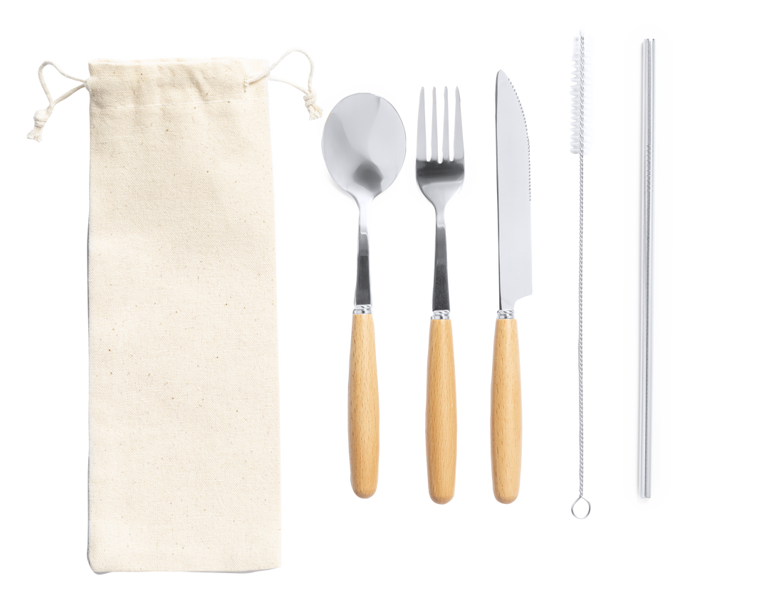 5-teiliges Besteckset aus rostfreiem Stahl, mit Naturholzgriff. Inklusive Löffel, Gabel, Messer, wiederverwendbarem Strohhalm und Reinigungsbürste für den Strohhalm. Präsentiert in einem Beutel aus natürlicher Baumwolle mit Kordelzugverschluss.