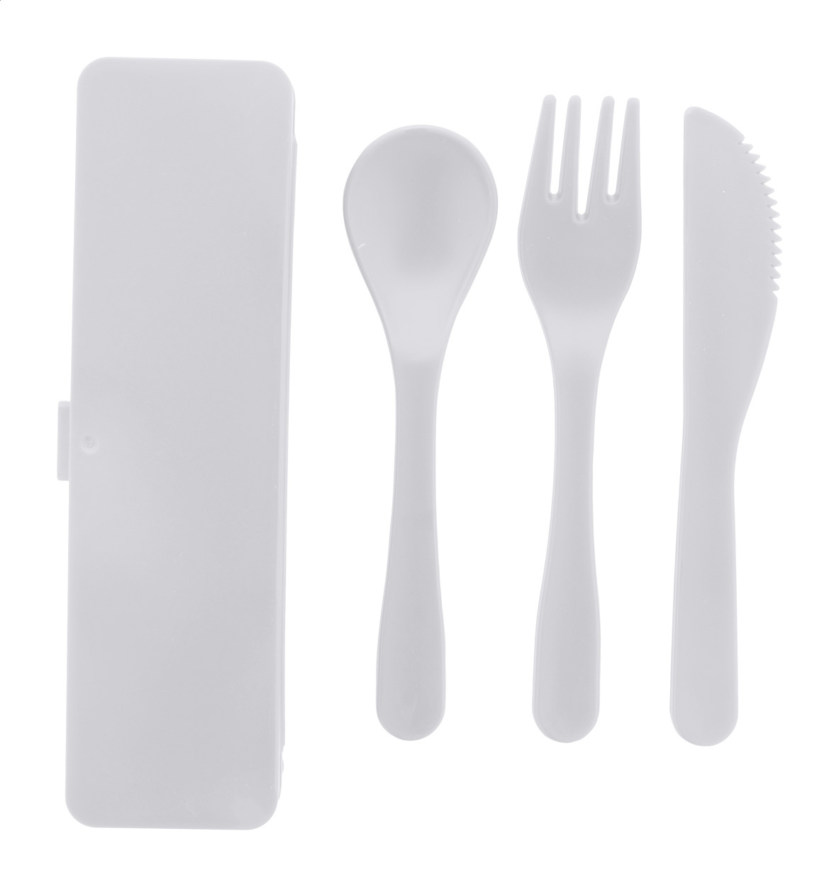 3-teiliges Besteckset aus PP-Kunststoff in einem farblich abgestimmten Etui. Beinhaltet Gabel, Messer und Löffel.