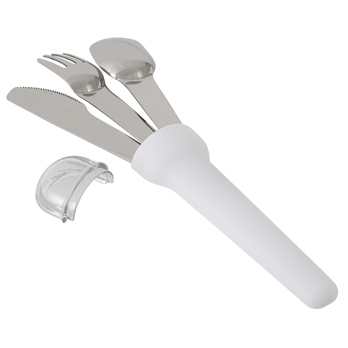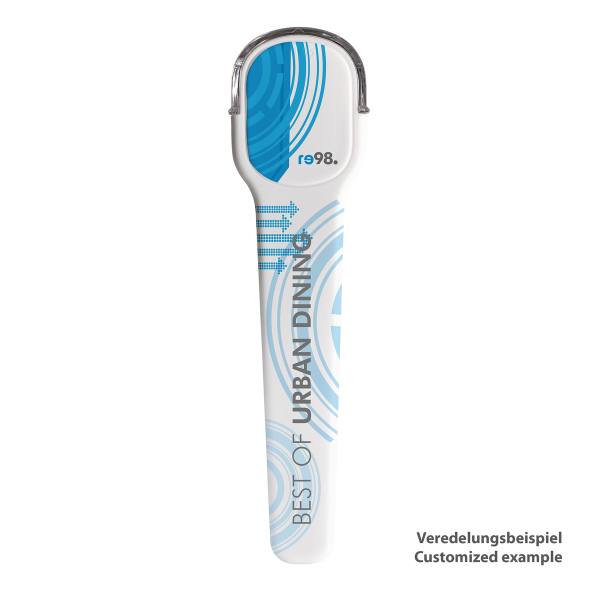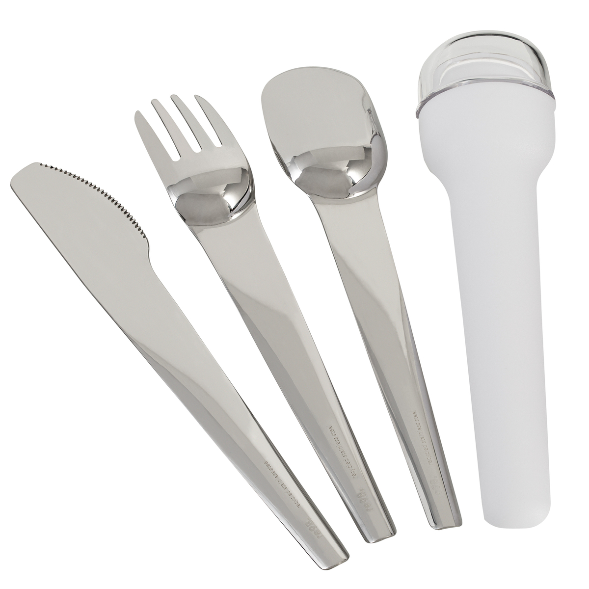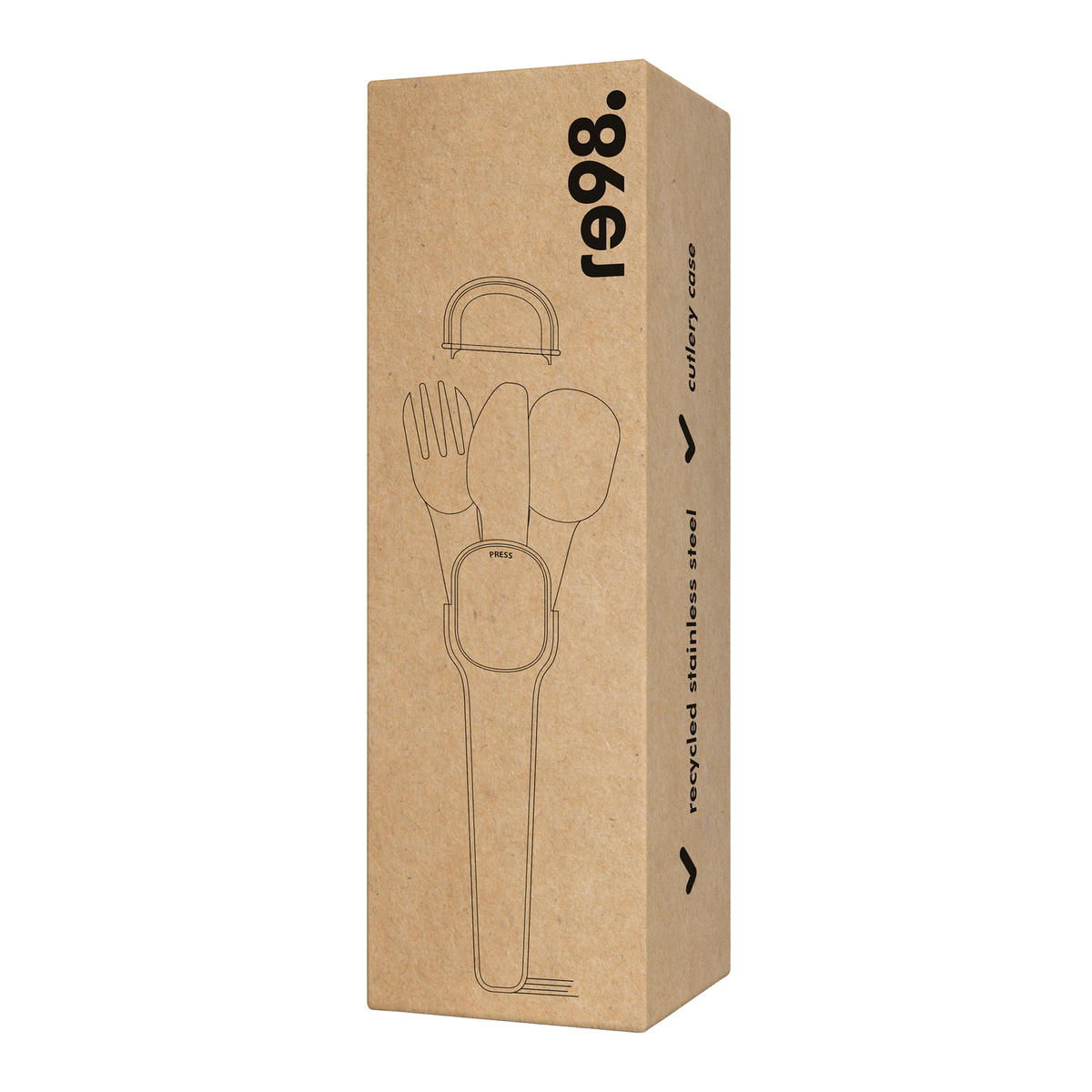 Das Besteckset RE98-CUTLA wurde mit dem renommierten RED DOT AWARD 2025 in der Kategorie Produktdesign ausgezeichnet!Essen abseits von Restaurants und Cafés bedeutet oft, das eigene Besteck mitzubringen – sei es beim Picknick, auf Trekkingtouren, im Büro oder auf der Baustelle. Mit dem Besteckset RE98-Cutla ist man für jede Mahlzeit professionell ausgestattet. Das Besteckset besteht aus hochwertigem, recyceltem Edelstahl und ist in einer hygienisch verschließbaren und trendigen Box aus recyceltem Kunststoff verpackt. Ideal zum Mitnehmen. Clever übereinander gestapelt, liegen Löffel, Gabel und Messer in einer sicher verschließbaren Kunststoffbox. Die Form des Besteckkopfs und eine minimale Wölbung in den Griffen geben die Passform vor und ermöglichen eine intuitive Stapelung. Das Besteck ist aus hochglanzpoliertem und extrem robustem Edelstahl 304 gefertigt. Ob Obst oder Fleisch, auf Schärfe muss man bei diesem Messer nicht verzichten. Das Messer hat einen Sägeschliff und ist somit ebenso scharf wie handelsübliche Besteckmesser für den Haushalt. Auch die Gabel mit vier Zinken ist zum Aufpicken und Aufnehmen von Speisen geeignet. Alle drei Besteckteile liegen angenehm in der Hand und überzeugen mit einer Größe, die genau zwischen Hauptgang-Besteck und Dessert-Besteck liegt. So eignet sich das Set für jede Speise. Nach dem Gebrauch kann das Set wieder in der handlichen Box verstaut werden. Die Box besteht aus recyceltem Polypropylen und recyceltem Polycarbonat und ist in den Farben Schwarz, Dunkelblau, Rot oder Weiß erhältlich. Verschlossen mit einer transparenten Kappe aus PC, lässt sich diese durch leichten Druck auf der flachen Rückseite öffnen und abnehmen (gekennzeichnet durch "Press"). Als Zusatzfunktion kann die Box als Messerbank verwendet werden und schützt dadurch die Besteckköpfe vor Kontakt mit dem Untergrund. So können Sie in jeder Umgebung hygienisch das Besteck nutzen. Zur Reinigung können alle Bestandteile in der Spülmaschine gereinigt werden.