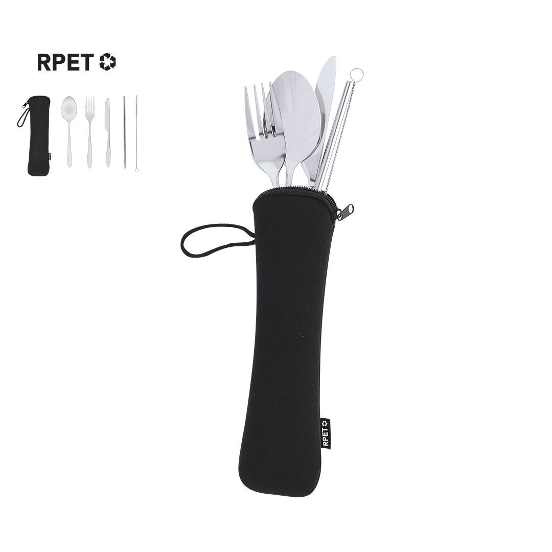 Set von 5 Besteckteilen aus Edelstahl. Enthält Löffel, Gabel, Messer, wiederverwendbaren Strohhalm und eine Reinigungsbürste für den Strohhalm. Präsentation in einer Soft Shell-Tasche aus RPET mit Reißverschluss und Transportkordel. Mit dem Markenzeichen RPET auf dem Etikett. RPET-Material wird aus recyceltem Kunststoff hergestellt, um die Wiederverwendung von Kunststoffabfällen zu fördern und zur Nachhaltigkeit des Planeten beizutragen.