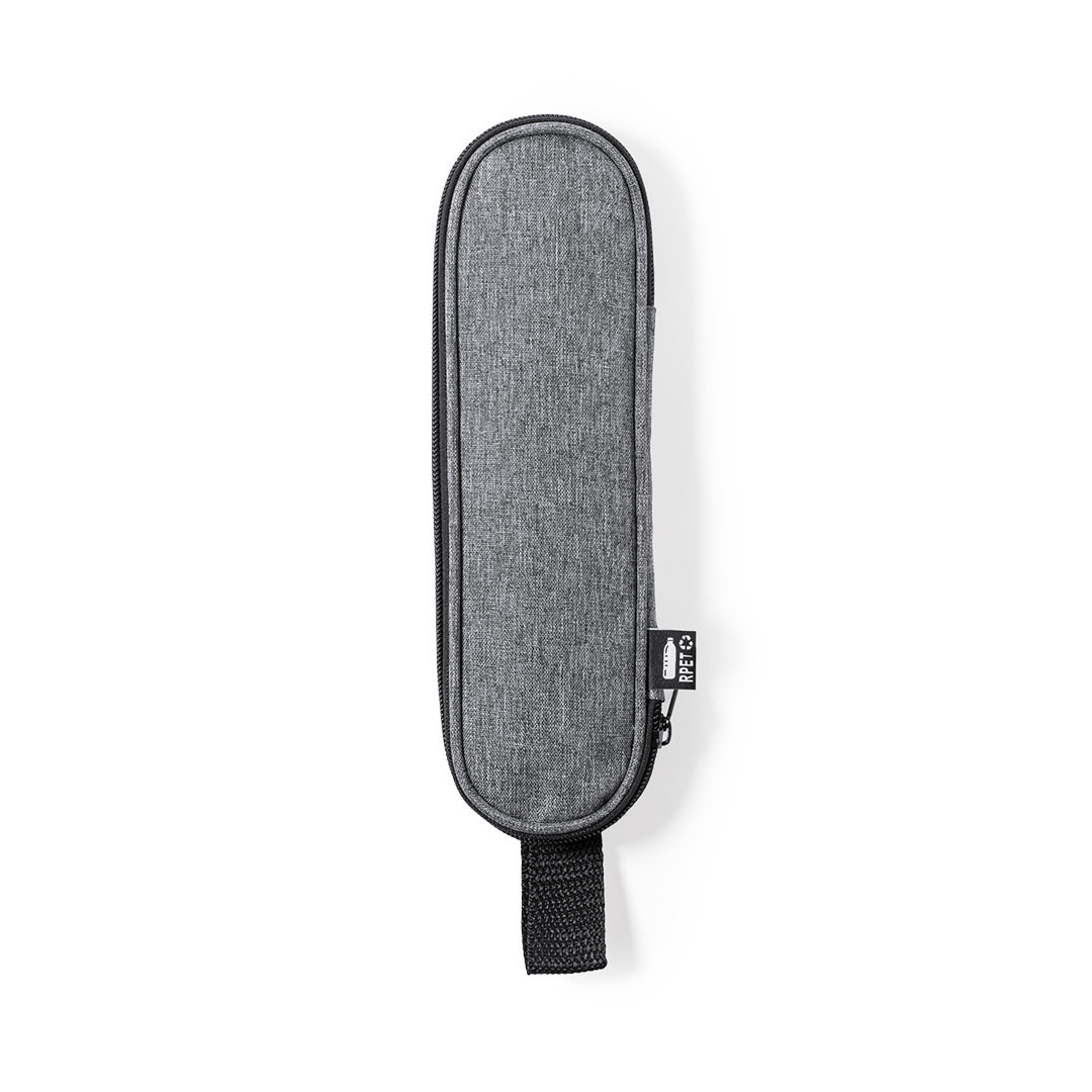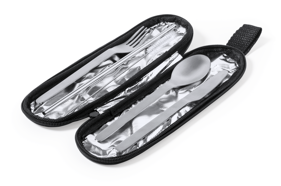 Wiederverwendbares Besteckset aus widerstandsfähigem und langlebigem Edelstahl. Inklusive Löffel, Messer, Gabel, Strohhalm und Reinigungszubehör. Präsentiert in einem eleganten 300D RPET-Polyester-Etui aus recyceltem Kunststoff, um die Wiederverwendung von Kunststoffabfällen zu fördern und die Nachhaltigkeit des Planeten zu unterstützen. Etui mit Trageriemen, Reißverschluss und RPET-Label auf dem Etikett.