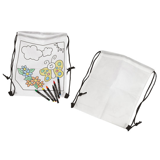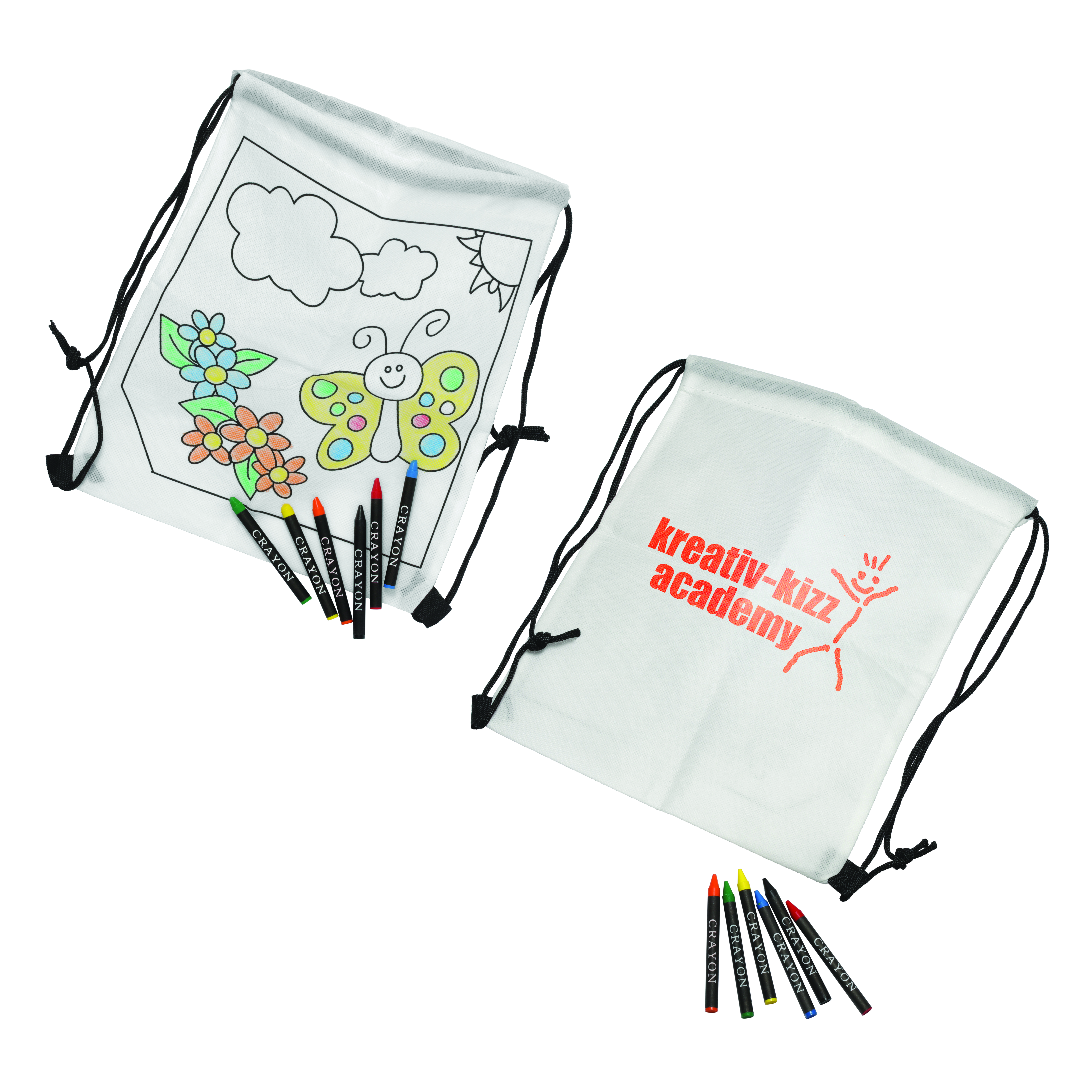 Beutel-Set zum Bemalen mit Kordelzug und verstärkten Ecken, inkl. 6 Wachsmalstiften zum Ausmalen der vorgedruckten Motive