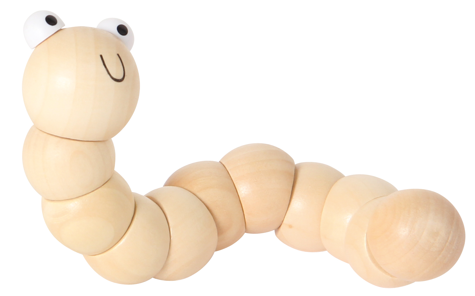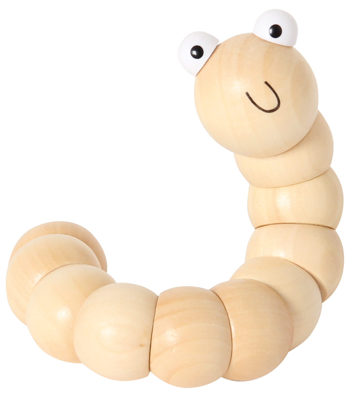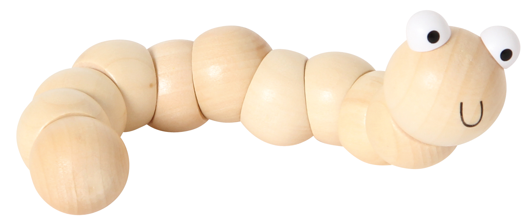 Pfiffiger Greifling aus Holz. Durch den Gummizug läßt sich der freundliche Wurm leicht verbiegen.