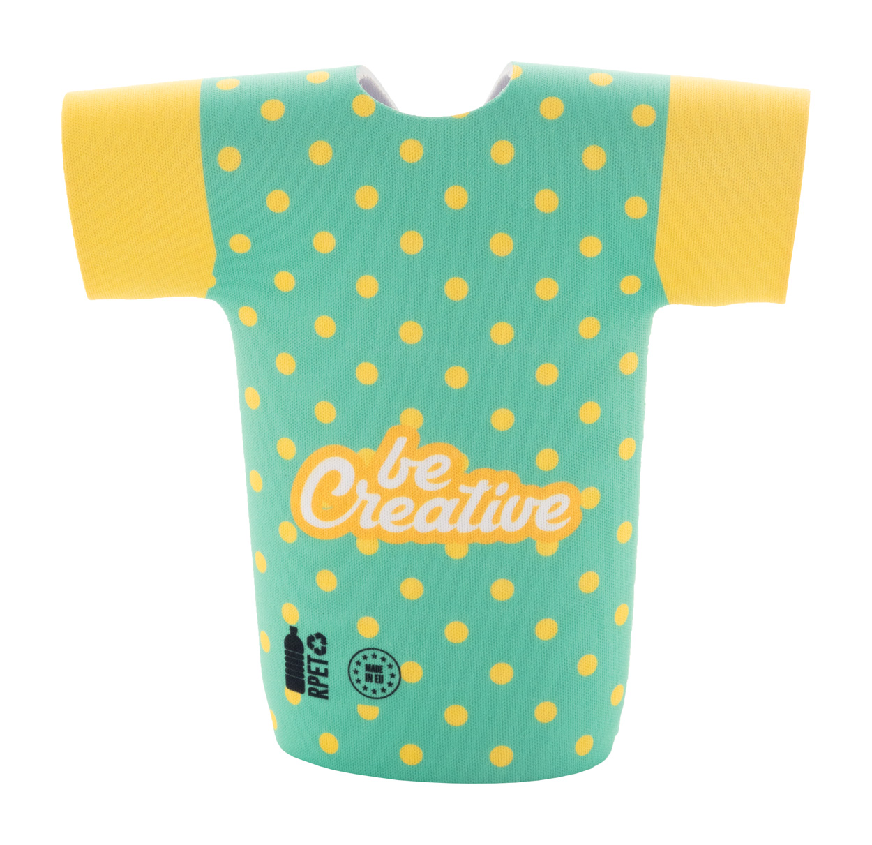 Individueller RPET-Neopren-Bierflaschenkühler in T-Shirt-Form. Mit vollflächigem Sublimationsdruck. Mindestmenge: 50 Stk.