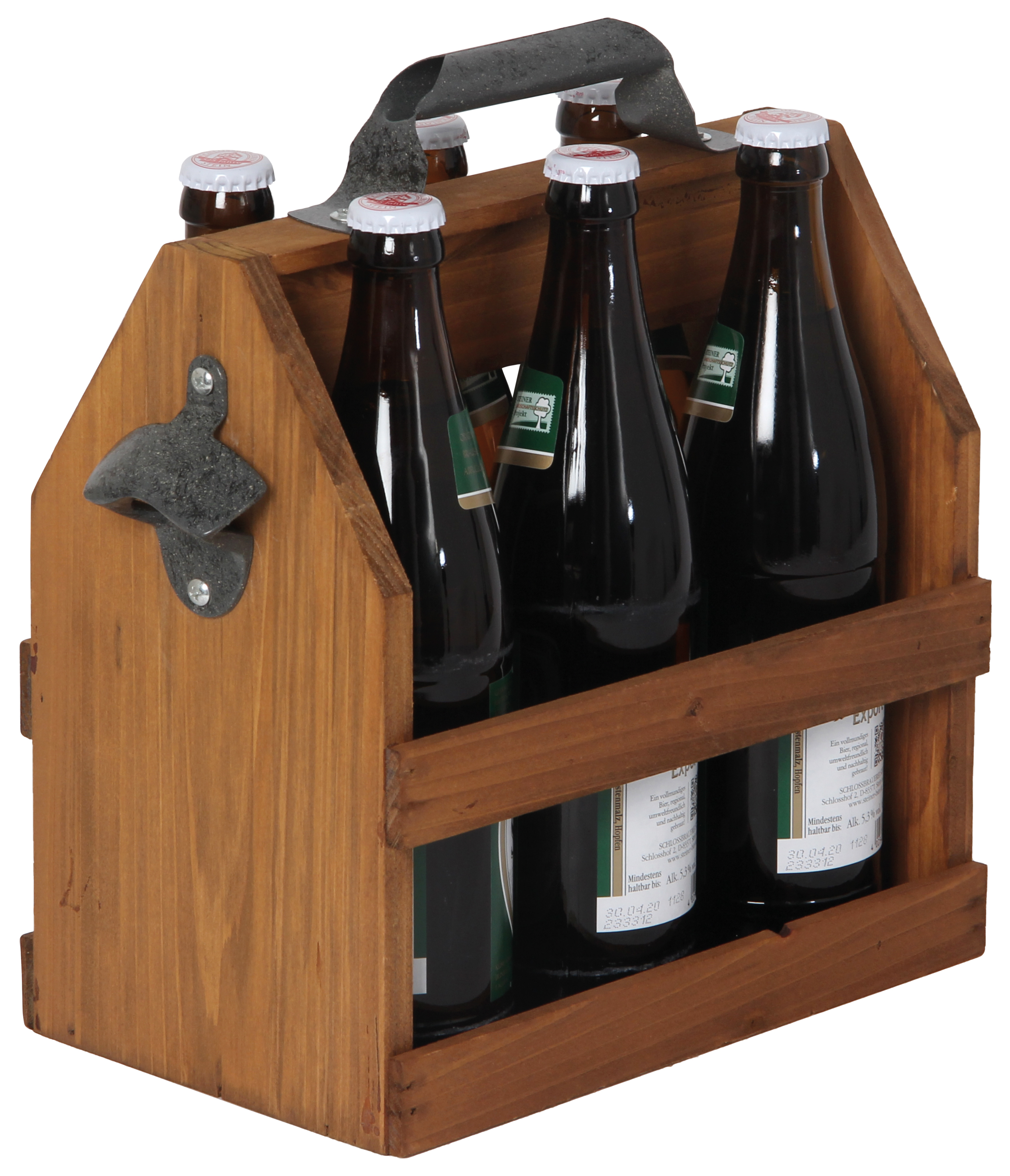 Praktischer lassen sich 6 Bier kaum tragen! Mit praktischem Flaschenöffner. Aus Holz. Für Langhalsflaschen.