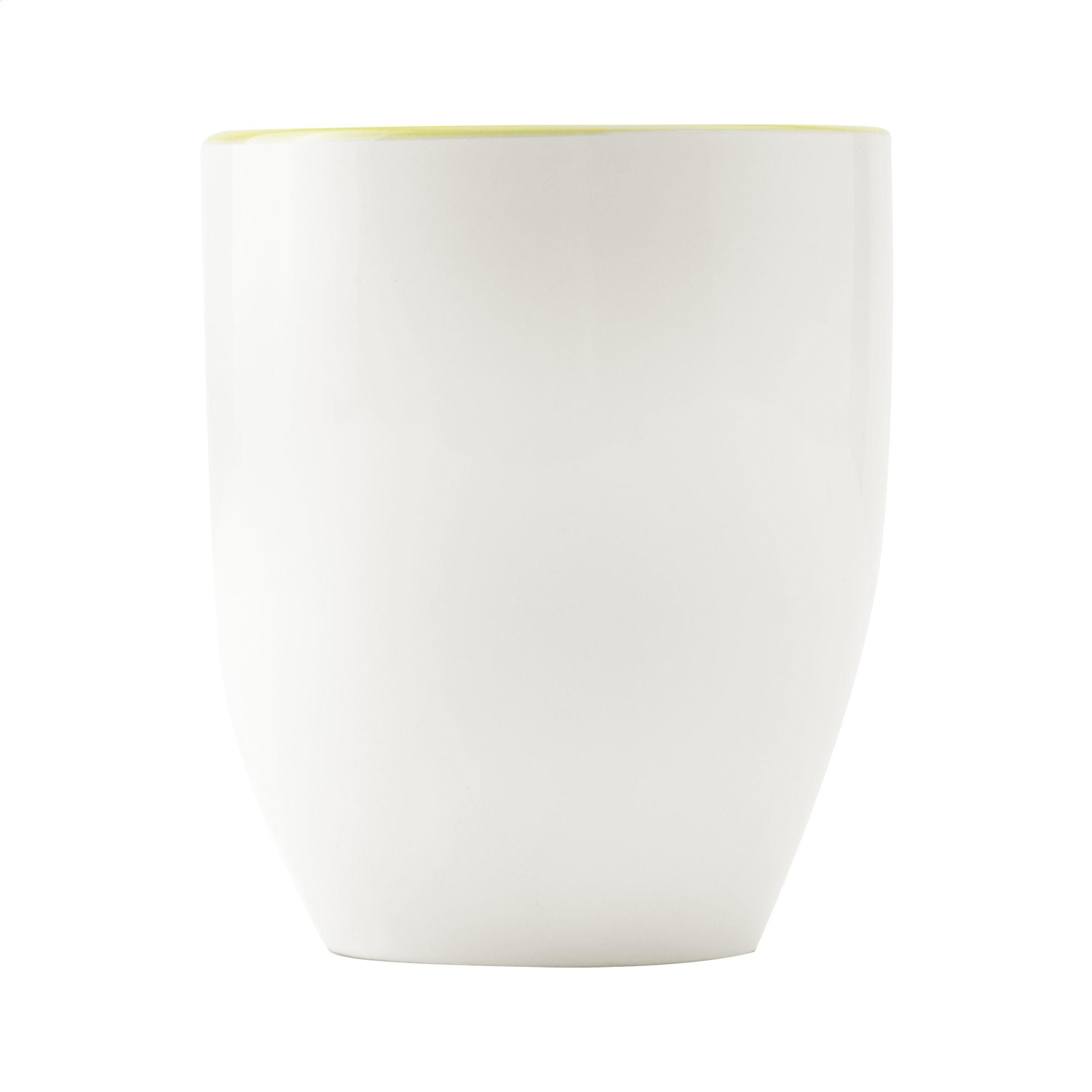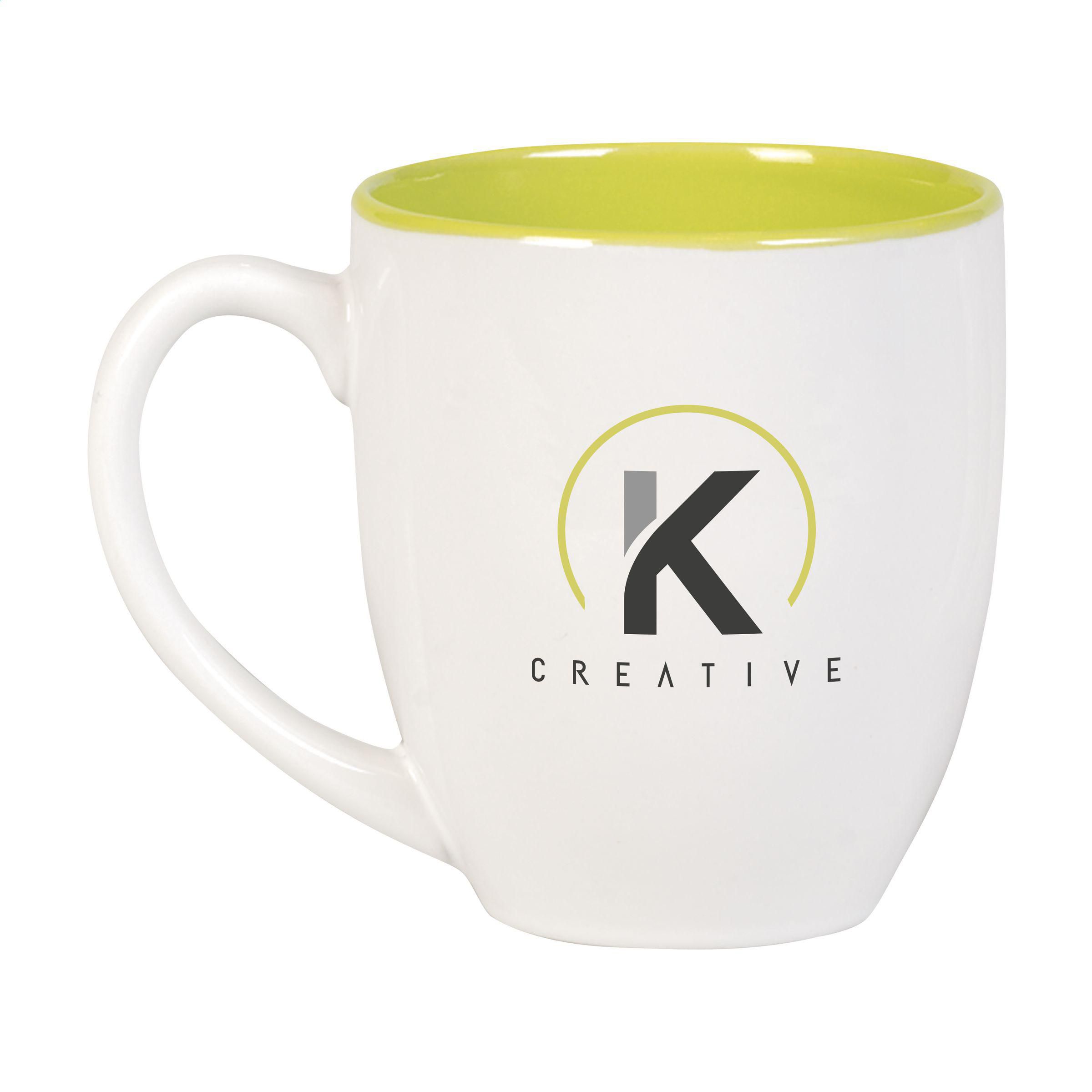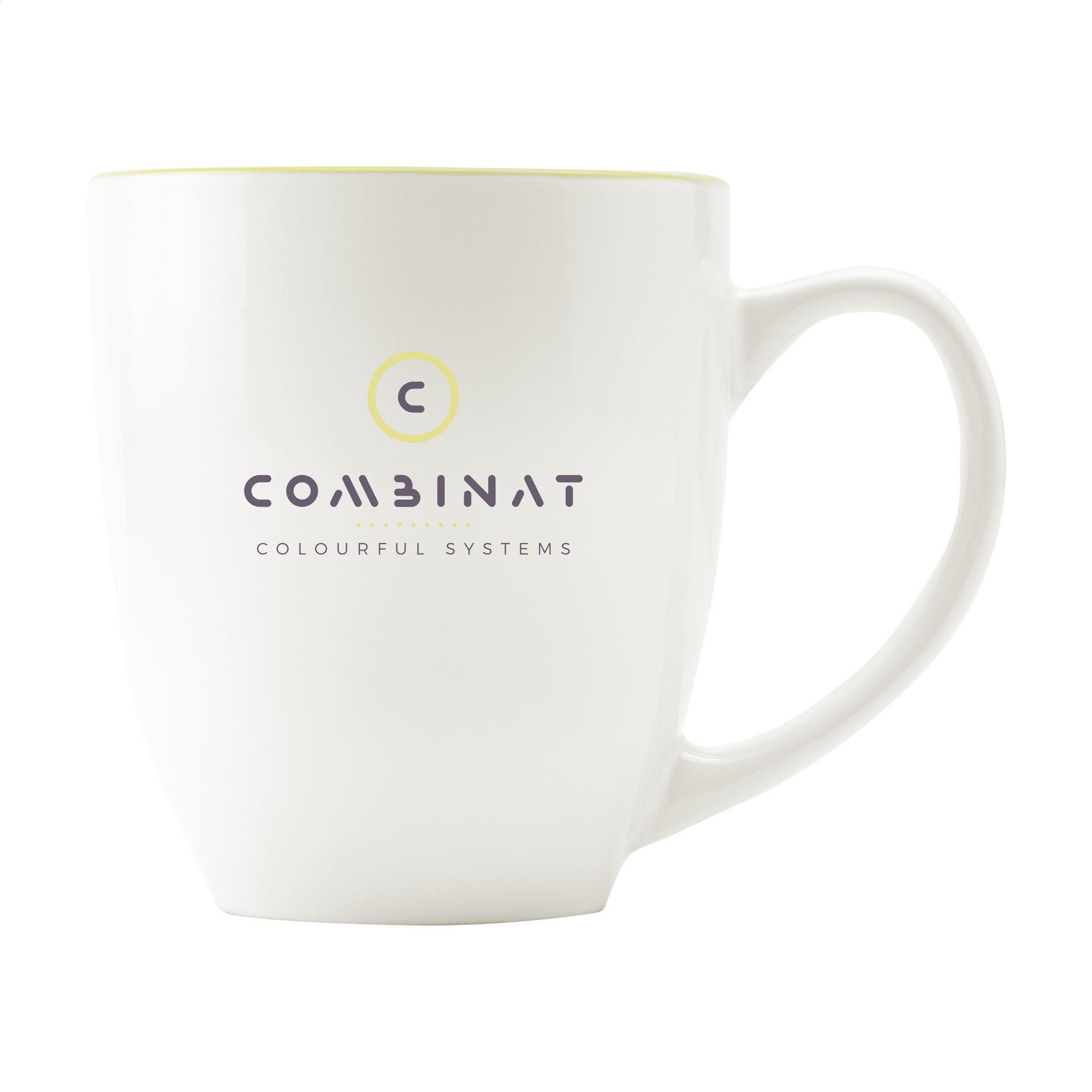 Extragroßer Becher aus hochwertiger Keramik. Komplett in weiß oder mit auffallender, farbiger Innenseite. Fassungsvermögen 450 ml. Spülmaschinengeeignet. Der Aufdruck ist spülmaschinengeprüft und nach EN 12875-2 zertifiziert.