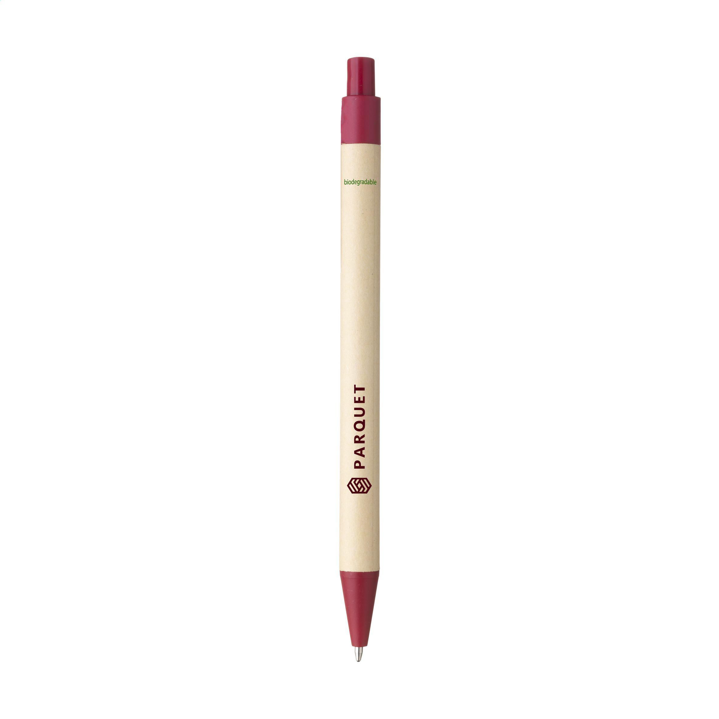 Beschreibung: Kugelschreiber mit Halter aus Recyclingpapier. Der farbige Clip, der Druckknopf und die Spitze bestehen aus biologisch abbaubarem PLA. Mit blauer Tinte.