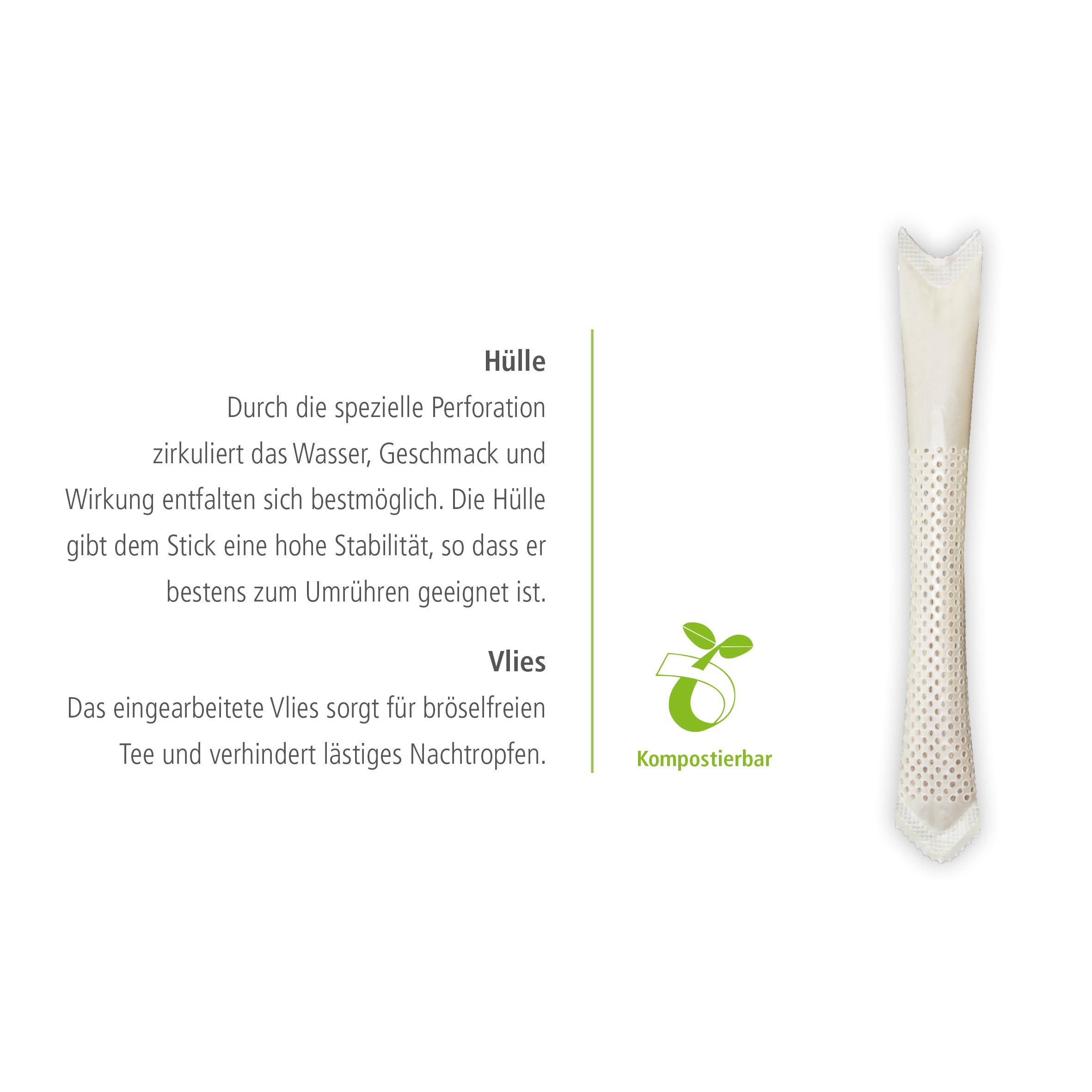 Praktischer TeeStick für eine Portion bröselfreien Tee ohne Nachbittern. Aromaversiegelt. Gebrauchsmustergeschützt. Hergestellt in Deutschland. DE-ÖKO-039.