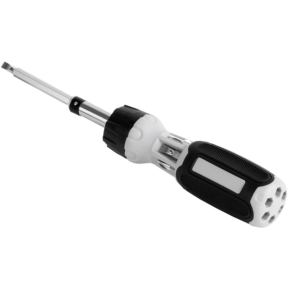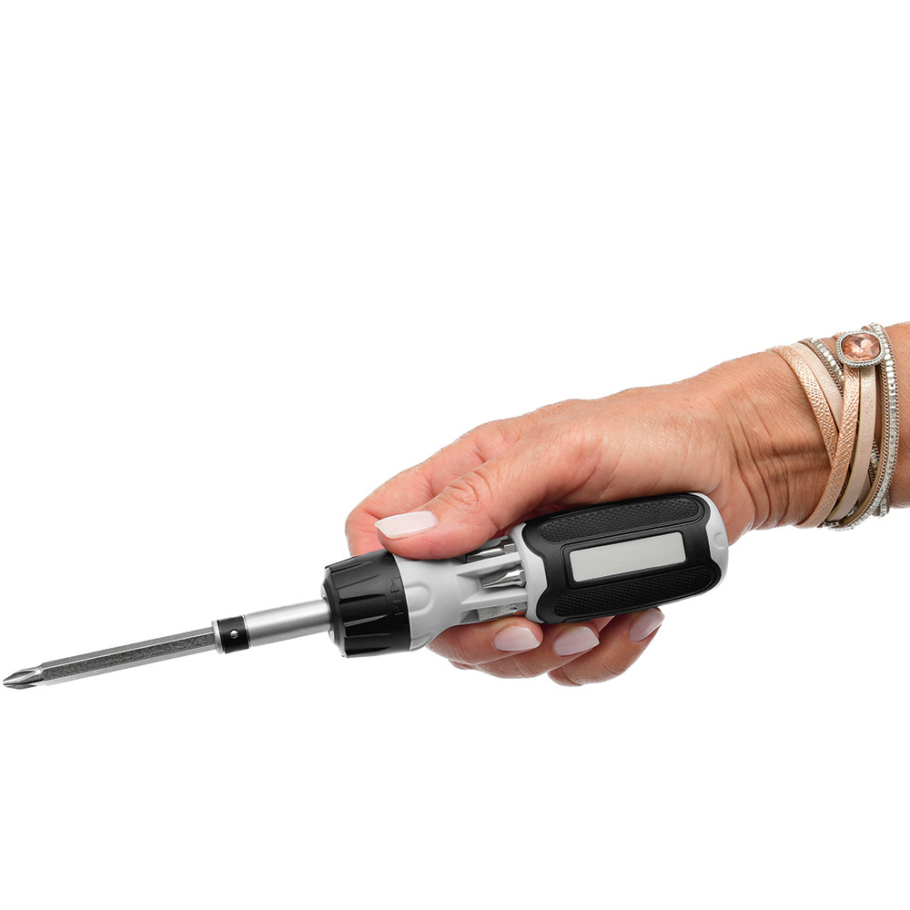 Bit-Schraubendreher mit Ratsche und 12 Bits. Material: Schraubendreher aus PP / TPR und Zinklegierung, Bits aus CrV-Stahl (Rockwell 52-55). Zubehör: Schraubendreher mit Bitaufnahme (1/4") und Ratsche mit Rechts- / Linkslauf und Arretierung, 12 Bits (1/4", 6,35mm-Sechskantschaft). Stecksatz: 2 x Phillips: PH1/ PH2; 4 x TORX®: T10/ T15/ T20/ T25; 2 x Schlitz: 5/ 6 mm; 2 x Innensechskant: H3/ H4; 2 x Innenvierkant: S1/ S2. Verpackung: schwarze Geschenkverpackung.