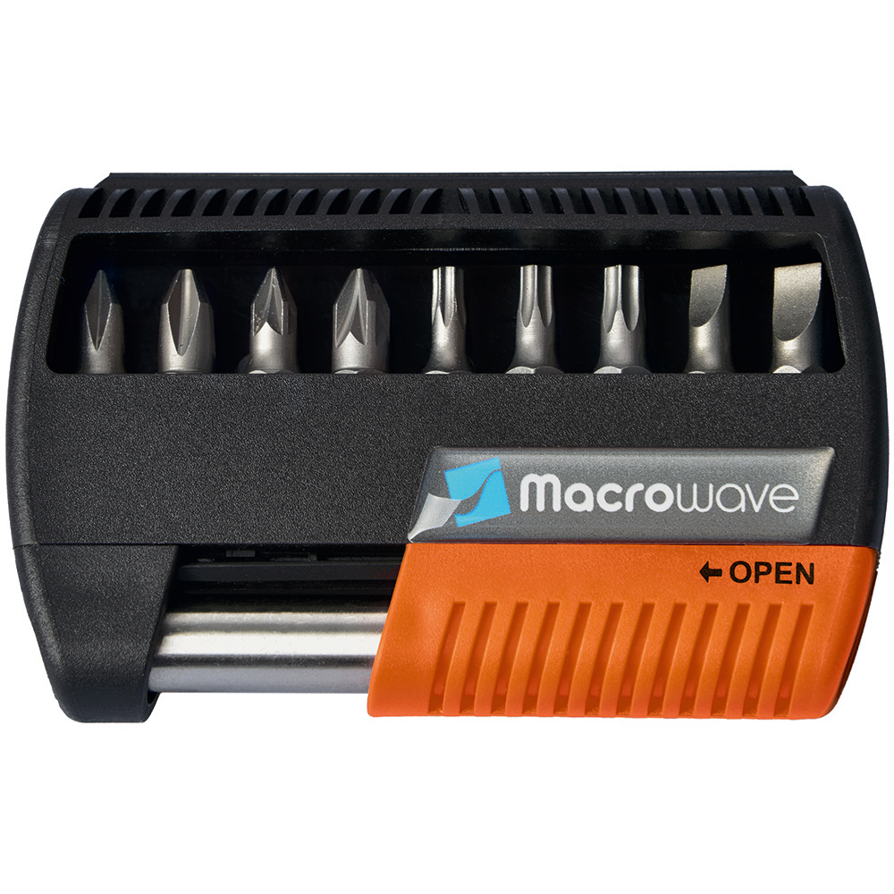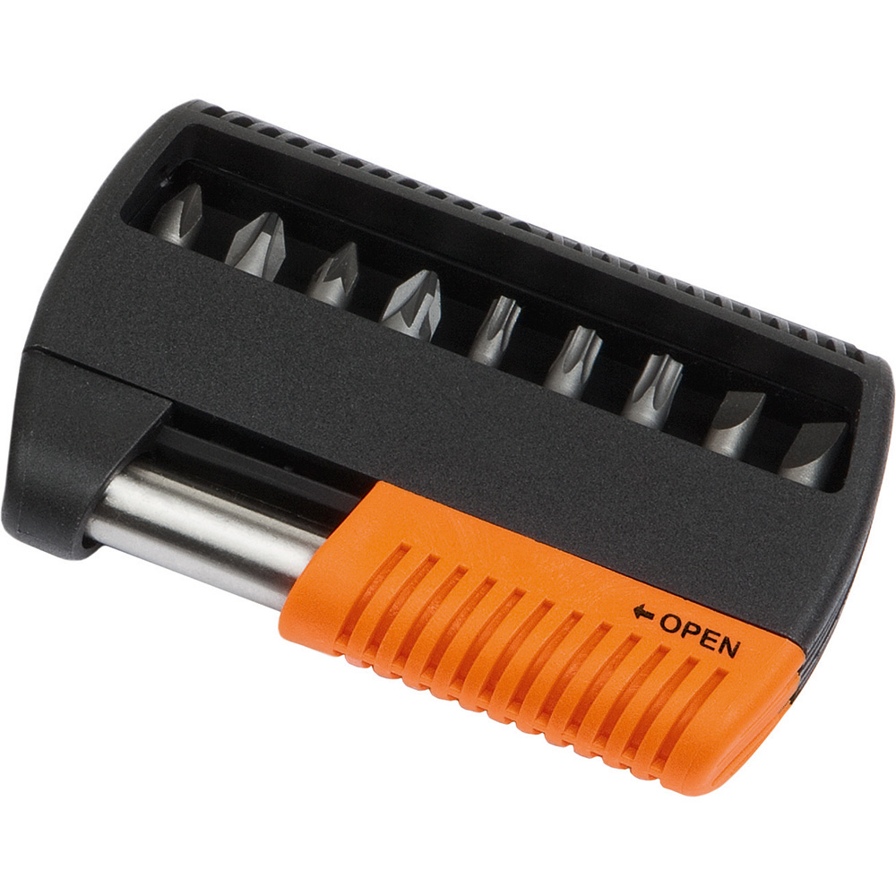Bit-Set mit 9 Bits und Bithalter-Verlängerung. Material: Sammelbox aus PP, Bithalter-Verlängerung aus Edelstahl, Bits aus S2 Stahl (Rockwell 58-60). Zubehör: Sammelbox mit Steckplätzen, Bithalter-Verlängerung mit magnetischer Bitaufnahme (1/4"), 9 Bits (1/4", 6,35mm-Sechskantschaft). Stecksatz: 2 x Phillips: PH1/ PH2; 2 x Pozidriv: PZ1/ PZ2; 3 x TORX®: T15/ T20/ T25; 2 x Schlitz: 4,5/ 5,5 mm. Verpackung: schwarze Geschenkverpackung.