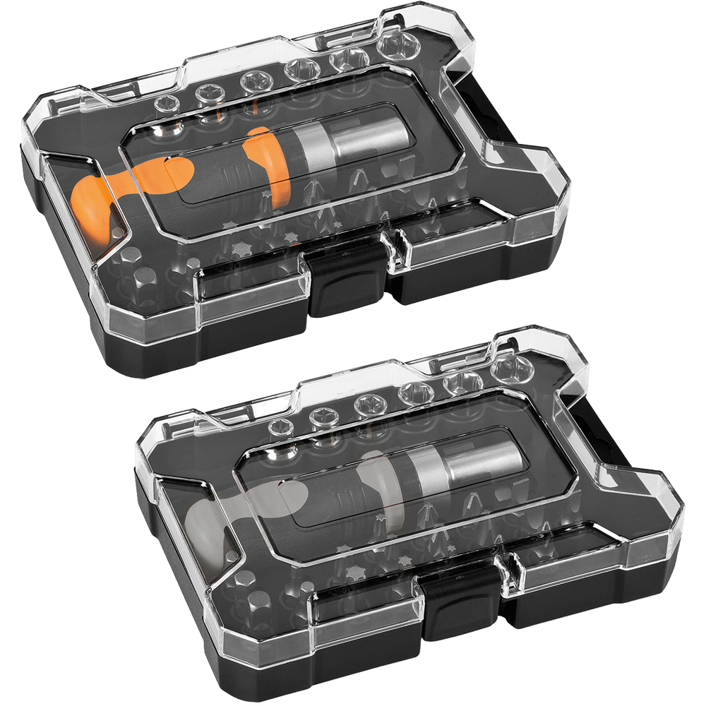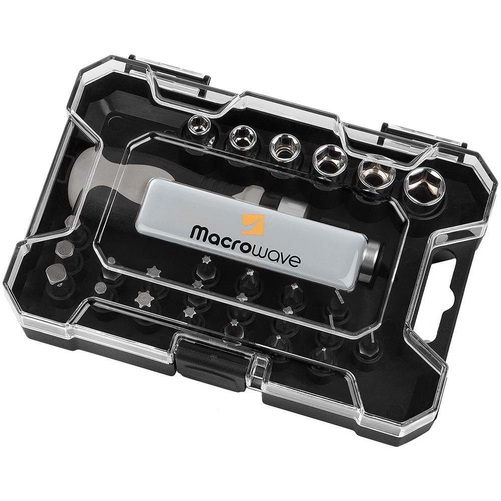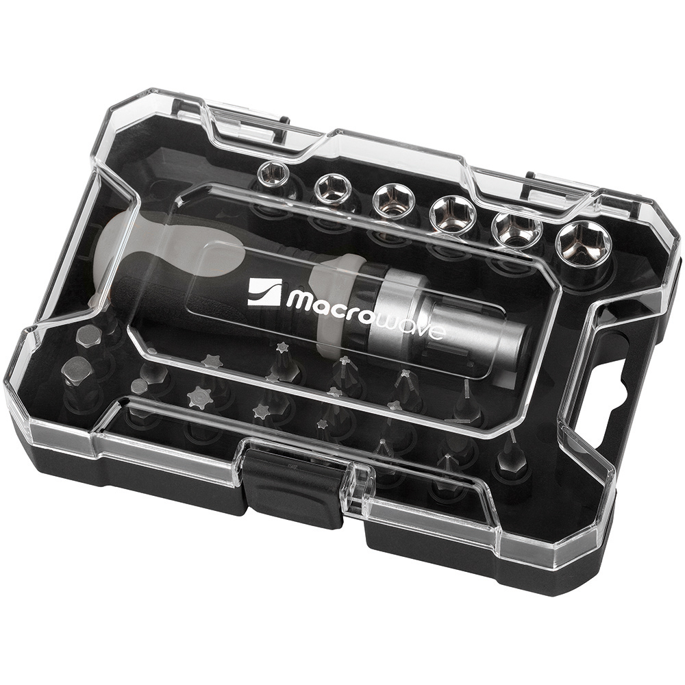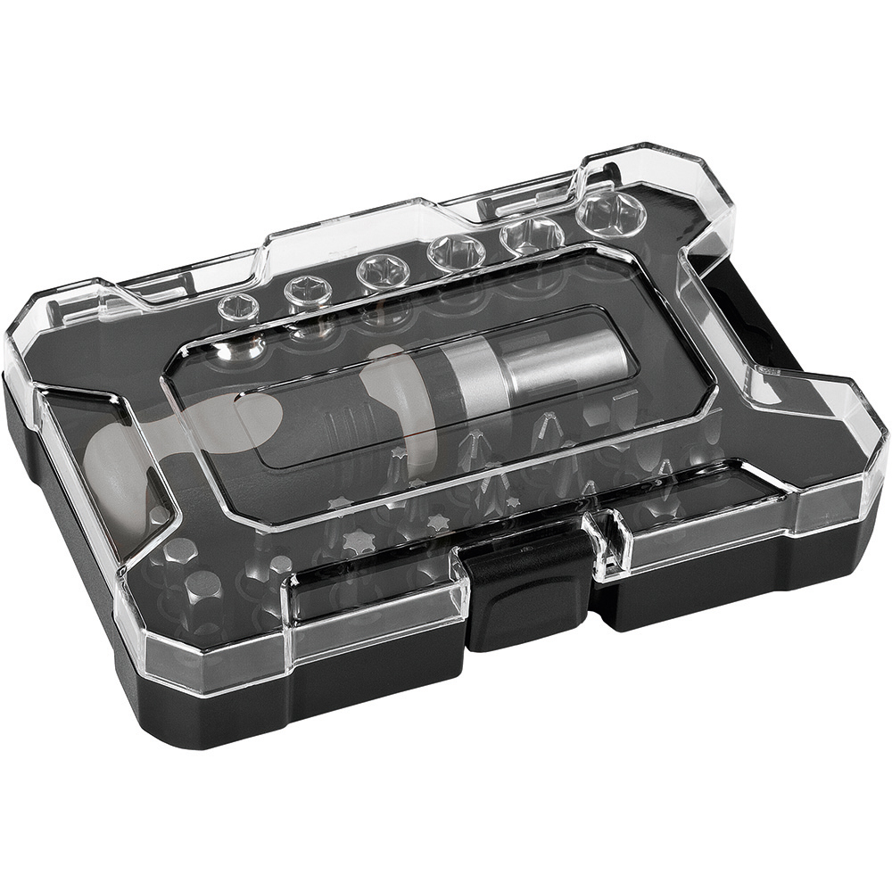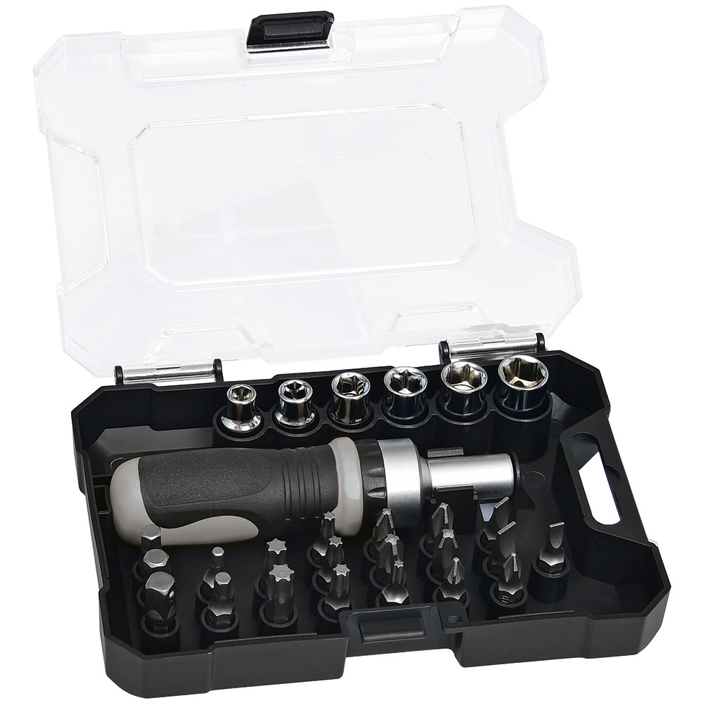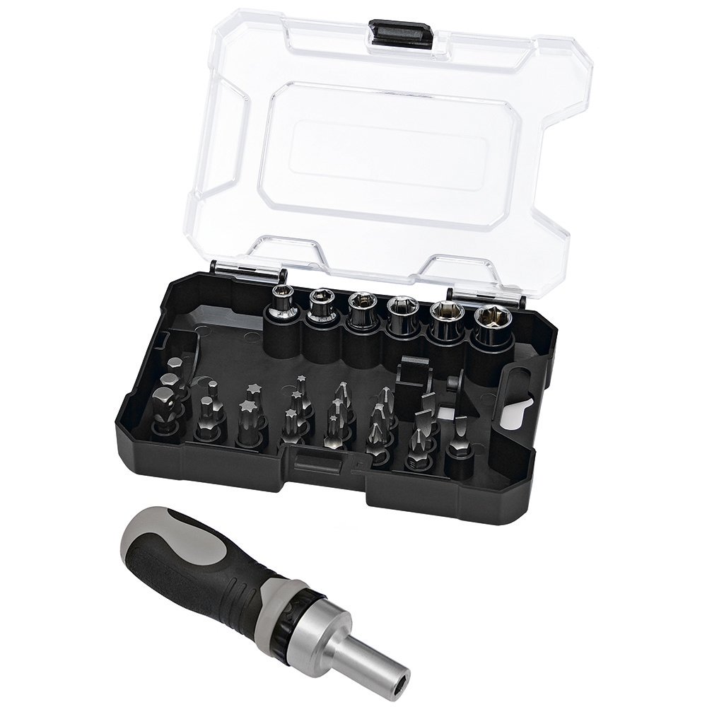 Bit-Set mit 19 Bits, 6 Stecknüssen, Bit-Schraubendreher mit Ratsche. Material: Sammelbox aus PP und PC, Schraubendreher aus TPR / PP und Carbonstahl, Bits und Adapter für Stecknüsse aus CrV-Stahl (Rockwell 50-54), Stecknüsse aus Carbonstahl (Rockwell 38). Zubehör: Sammelbox mit Steckplätzen, Schraubendreher mit magnetischer Bitaufnahme (1/4") und Ratsche mit Rechts- / Linkslauf und Arretierung, 19 Bits (1/4" 6,35 mm-Sechskantschaft, 25 mm), 6 Stecknüsse, Adapter für Stecknüsse. Stecksatz: 3 x Phillips: PH1/ PH2/ PH3; 3 x Schlitz: 4/ 5/ 6; 3 x Pozidriv: PZ1/ PZ2/ PZ3; 6 x TORX®: T10/ T15/ T20/ T25/ T30/ T40; 4 x Innensechskant: H3/ H4/ H5/ H6, 6 x Stecknüsse: 5/ 6/ 7/ 8/ 9/ 10. Verpackung: schwarze Geschenkverpackung.