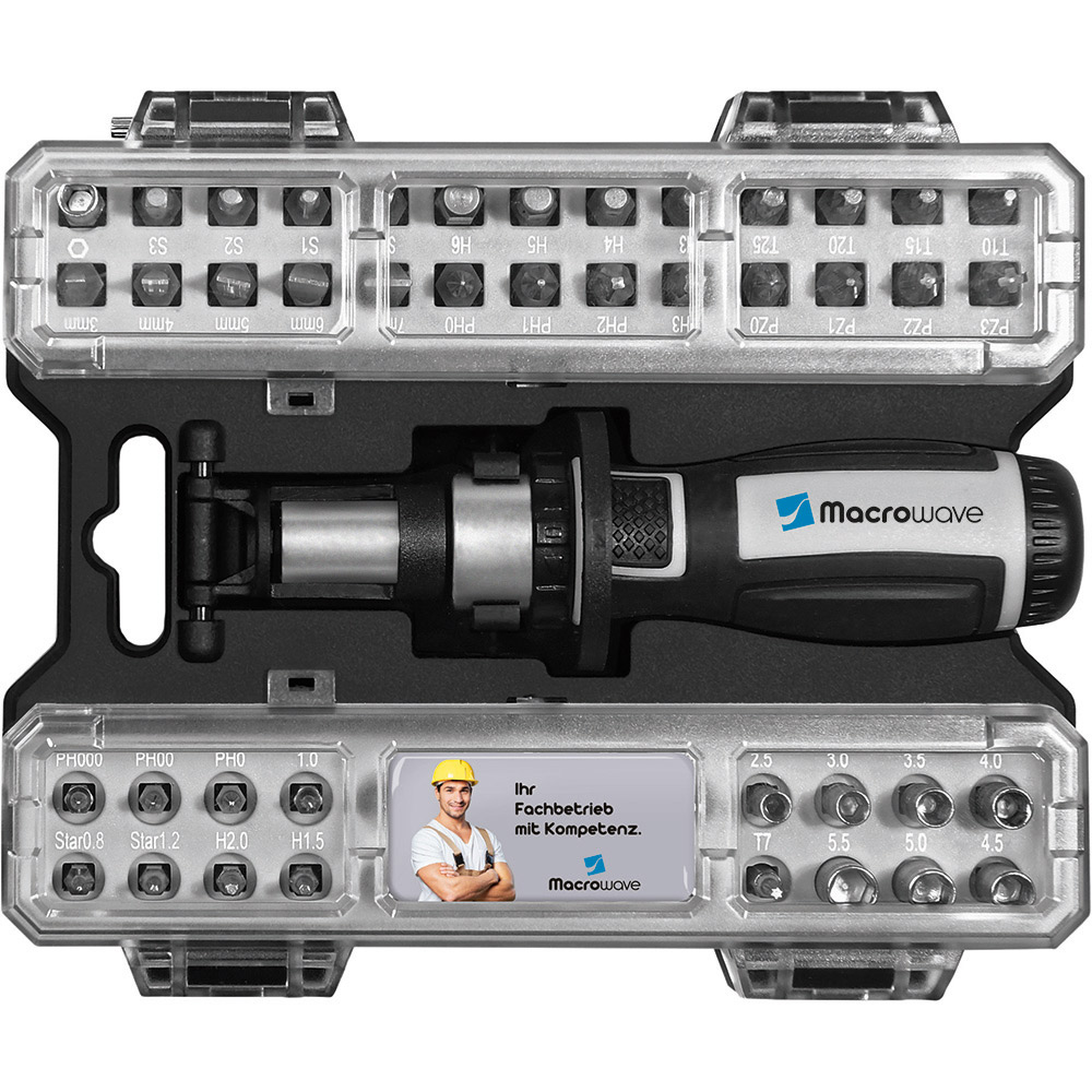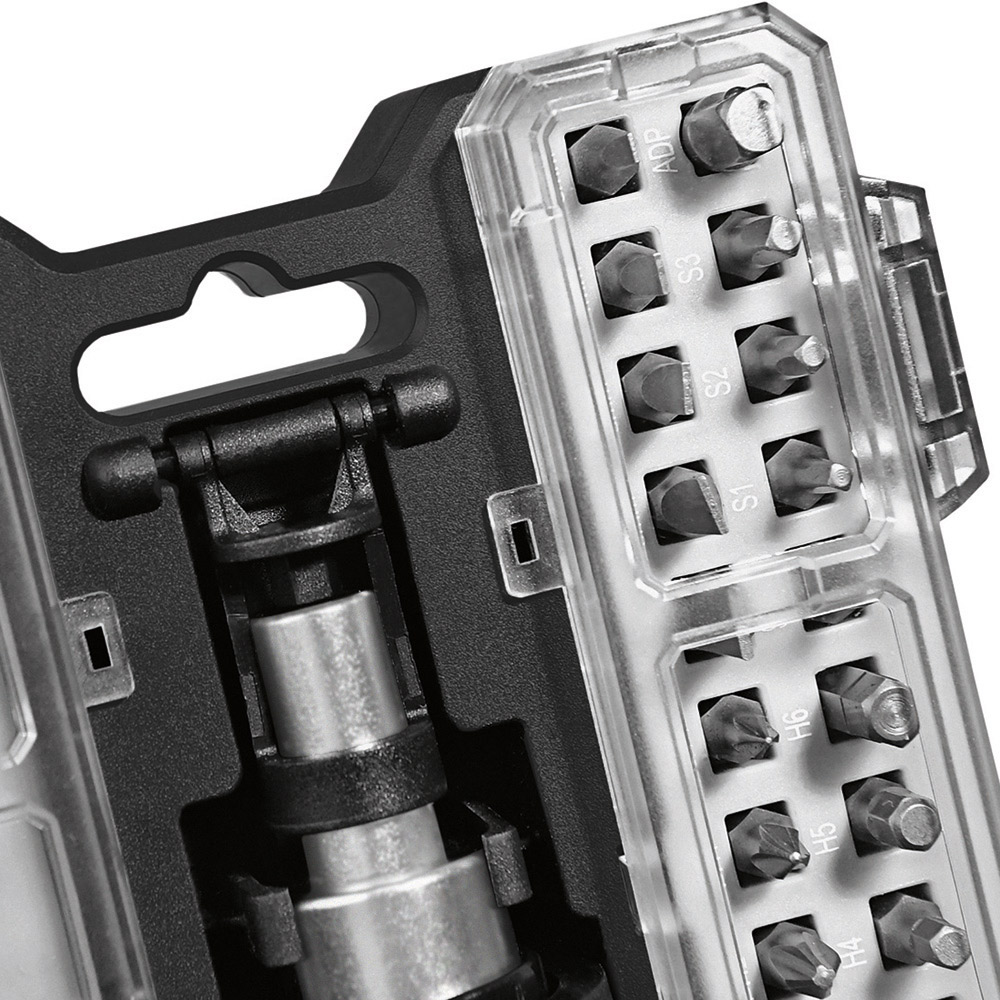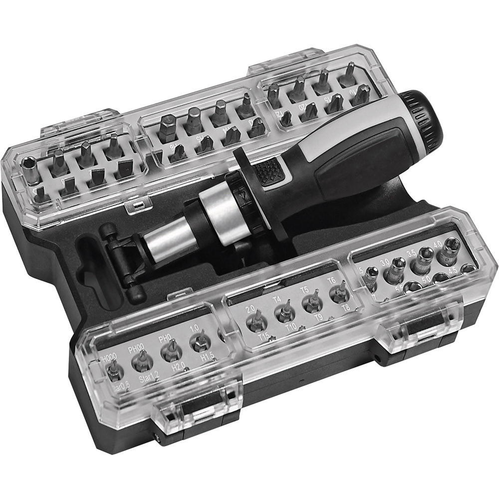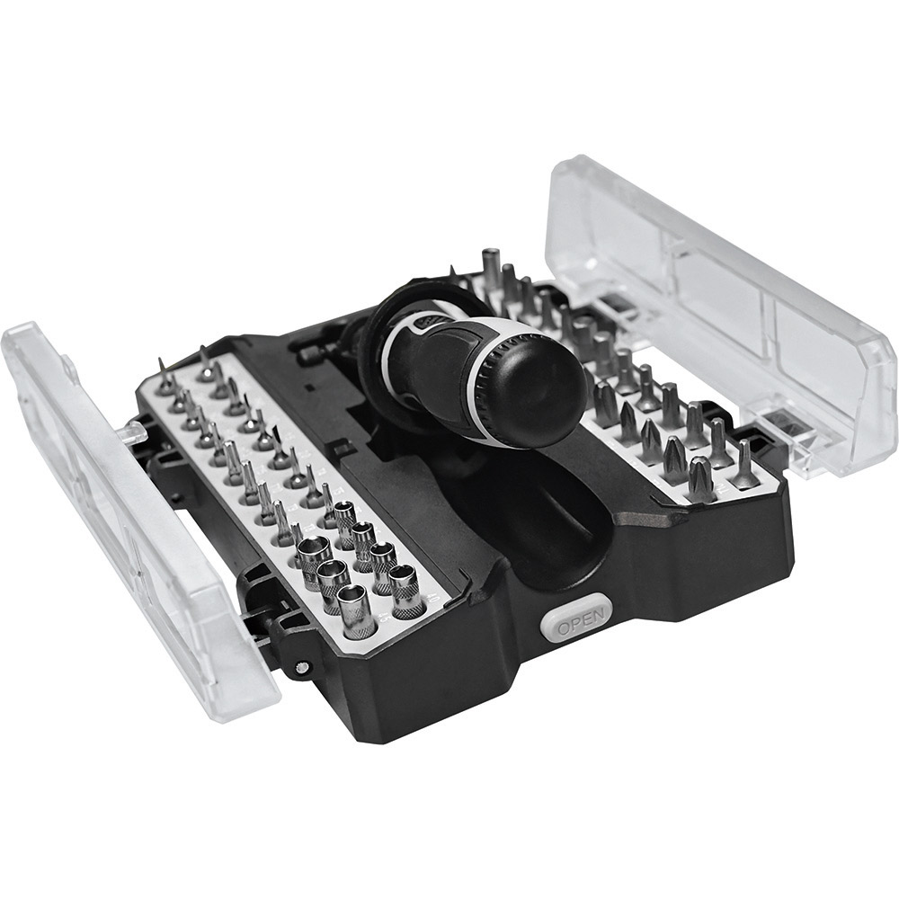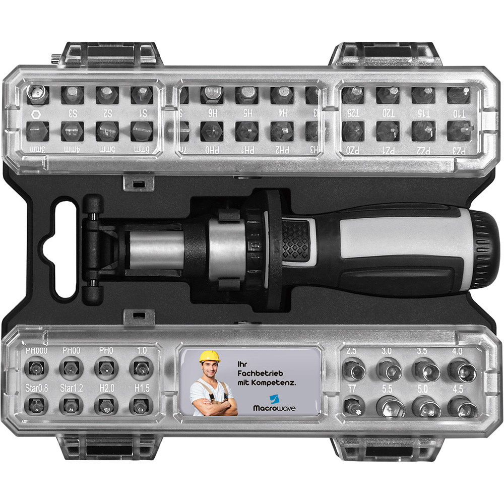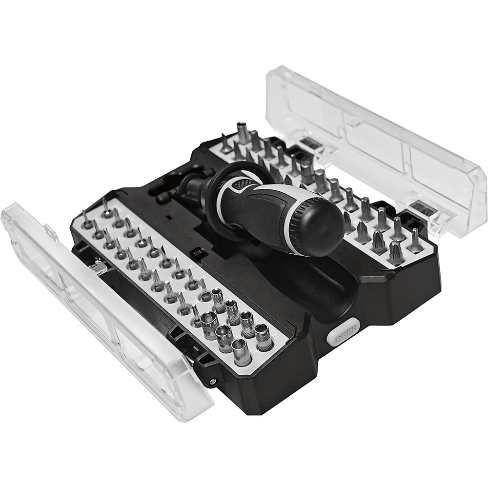 Umfangreiches Bit-Set mit praktischem Öffnungsmechanismus, Bit-Schraubendreher mit Ratsche und insgesamt 44 Bits, 7 Stecknüssen und Adapter. Material: Sammelbox aus PS und PC, Schraubendreher aus TPR / PP und Carbonstahl (Rockwell 35-48), Bits und Adapter für Stecknüsse aus CrV-Stahl (Rockwell 50-56), Stecknüsse aus Carbonstahl (Rockwell 38). Zubehör: Sammelbox mit Steckplätzen, Schraubendreher mit magnetischer Bitaufnahme (1/4") und Ratsche mit Rechts- / Linkslauf und Arretierung, 25 Bits (1/4" 6,35 mm-Sechskantschaft, 25 mm), 19 Feinbits (4 mm-Sechskantschaft, 28 mm), 7 Stecknüsse (4 mm-Sechskantschaft), Adapter für Stecknüsse, integrierte Halterungen für Box und Schraubendreher. Stecksatz: Bits (1/4" 6,35 mm-Sechskantschaft): 4 x Pozidriv: PZ0/ PZ1/ PZ2/ PZ3; 4 x Phillips: PH0/ PH1/ PH2/ PH3; 5 x Schlitz: 3/ 4/ 5/ 6/ 7 mm; 4 x TORX®: T10/ T15/ T20/ T25; 4 x Innensechskant: H3/ H4/ H5/ H6; 4 x Innenvierkant: S0/ S1/ S2/ S3; Feinbits (4 mm-Sechskantschaft): 3 x Phillips: PH000/ PH00/ PH0; 3 x Schlitz: 1,0/ 1,5/ 2,0; 8 x TORX®: T4/ T5/ T6/ T7/ T8/ T9/ T10/ T15; 3 x Innensechskant: H1,3/ H1,5/ H2,0; 2 x Stern: 0,8/ 1,2; Stecknüsse (4 mm-Sechskantschaft): 2,5/ 3/ 3,5/ 4/ 4,5/ 5/ 5,5. Verpackung: schwarze Geschenkverpackung