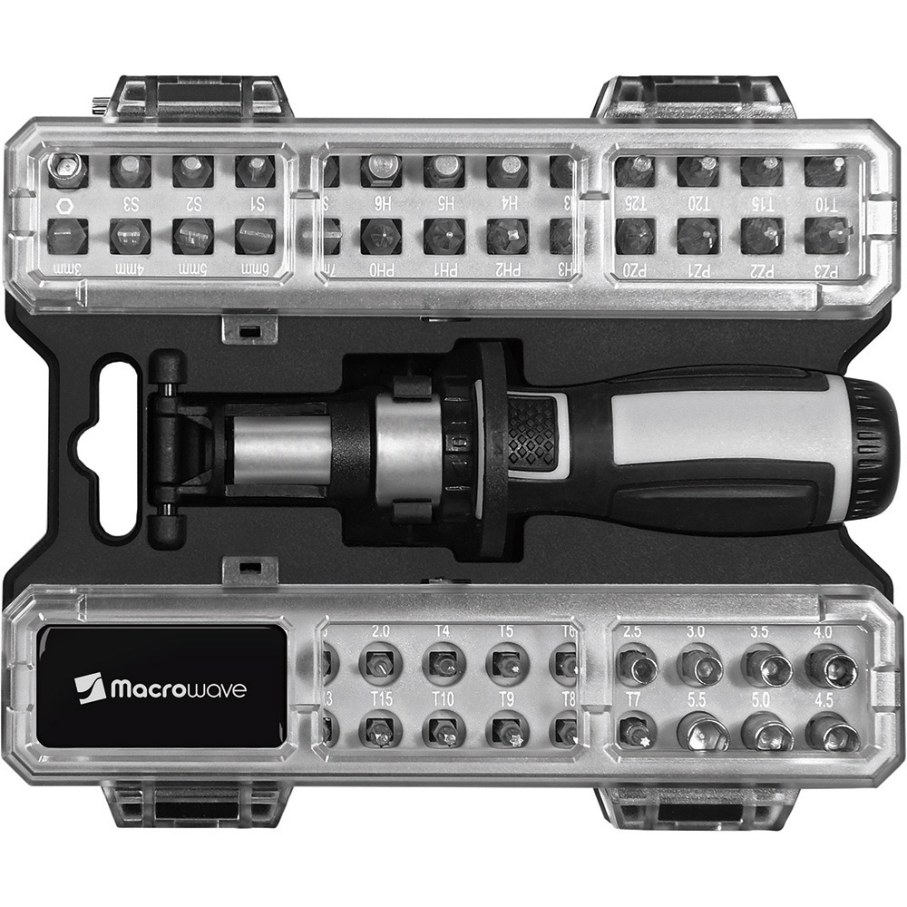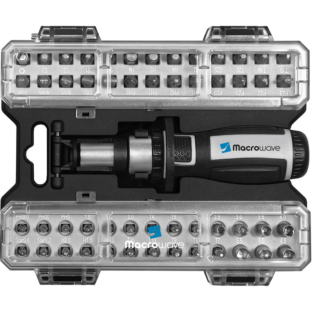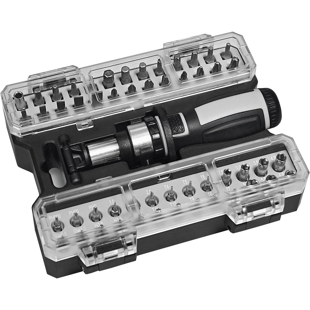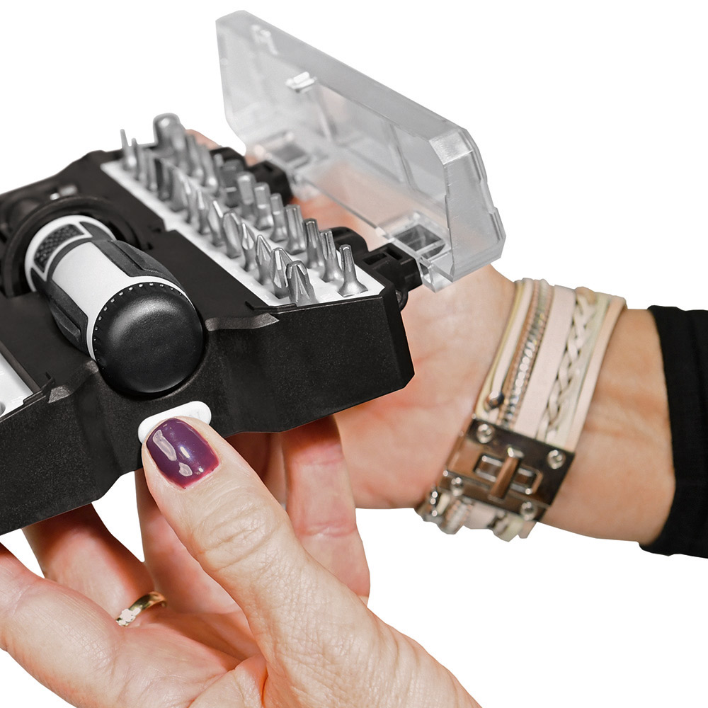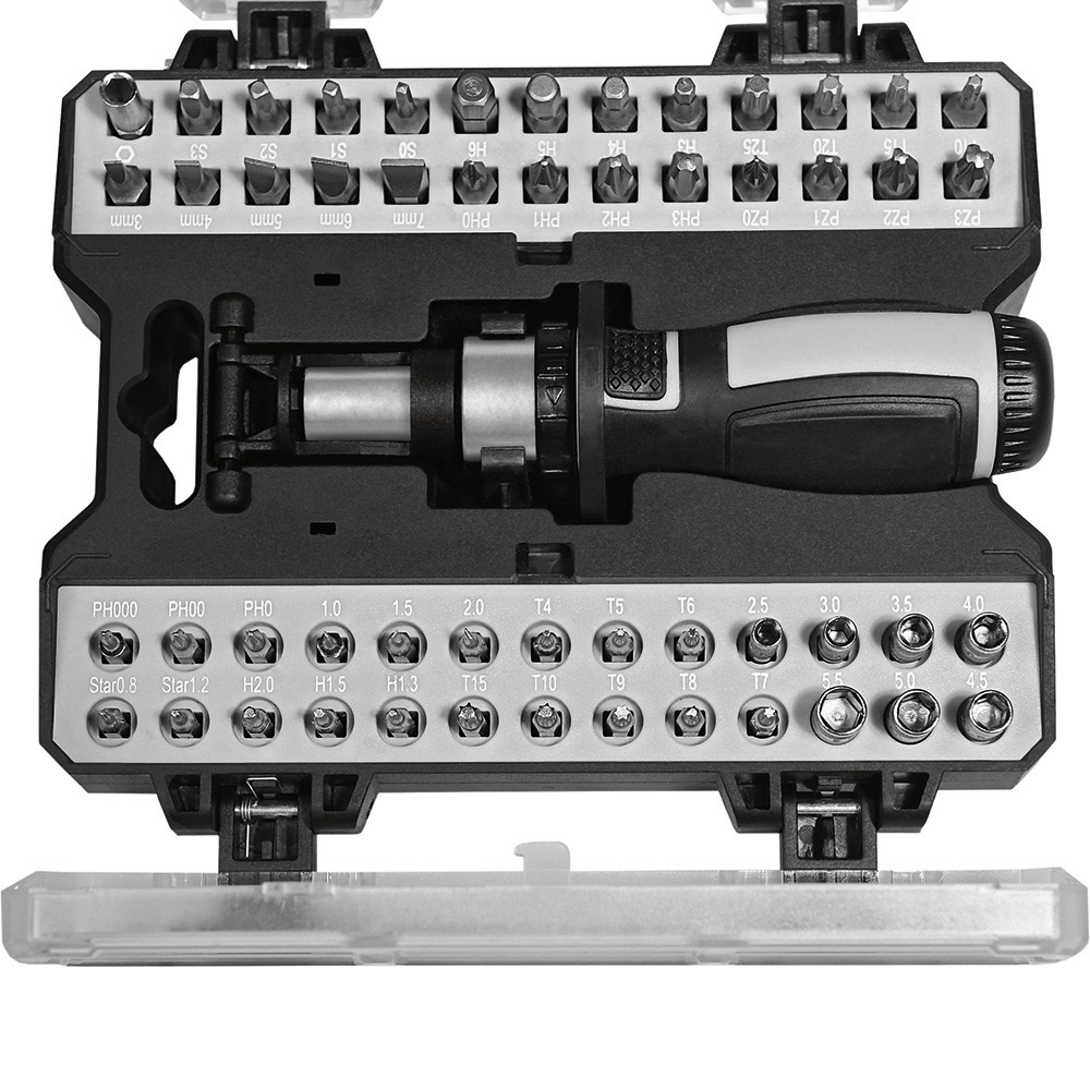 Umfangreiches Bit-Set mit praktischem Öffnungsmechanismus, Bit-Schraubendreher mit Ratsche und insgesamt 44 Bits, 7 Stecknüssen und Adapter. Material: Sammelbox aus PS und PC, Schraubendreher aus TPR / PP und Carbonstahl (Rockwell 35-48), Bits und Adapter für Stecknüsse aus CrV-Stahl (Rockwell 50-56), Stecknüsse aus Carbonstahl (Rockwell 38). Zubehör: Sammelbox mit Steckplätzen, Schraubendreher mit magnetischer Bitaufnahme (1/4") und Ratsche mit Rechts- / Linkslauf und Arretierung, 25 Bits (1/4" 6,35 mm-Sechskantschaft, 25 mm), 19 Feinbits (4 mm-Sechskantschaft, 28 mm), 7 Stecknüsse (4 mm-Sechskantschaft), Adapter für Stecknüsse, integrierte Halterungen für Box und Schraubendreher. Stecksatz: Bits (1/4" 6,35 mm-Sechskantschaft): 4 x Pozidriv: PZ0/ PZ1/ PZ2/ PZ3; 4 x Phillips: PH0/ PH1/ PH2/ PH3; 5 x Schlitz: 3/ 4/ 5/ 6/ 7 mm; 4 x TORX®: T10/ T15/ T20/ T25; 4 x Innensechskant: H3/ H4/ H5/ H6; 4 x Innenvierkant: S0/ S1/ S2/ S3; Feinbits (4 mm-Sechskantschaft): 3 x Phillips: PH000/ PH00/ PH0; 3 x Schlitz: 1,0/ 1,5/ 2,0; 8 x TORX®: T4/ T5/ T6/ T7/ T8/ T9/ T10/ T15; 3 x Innensechskant: H1,3/ H1,5/ H2,0; 2 x Stern: 0,8/ 1,2; Stecknüsse (4 mm-Sechskantschaft): 2,5/ 3/ 3,5/ 4/ 4,5/ 5/ 5,5. Verpackung: schwarze Geschenkverpackung