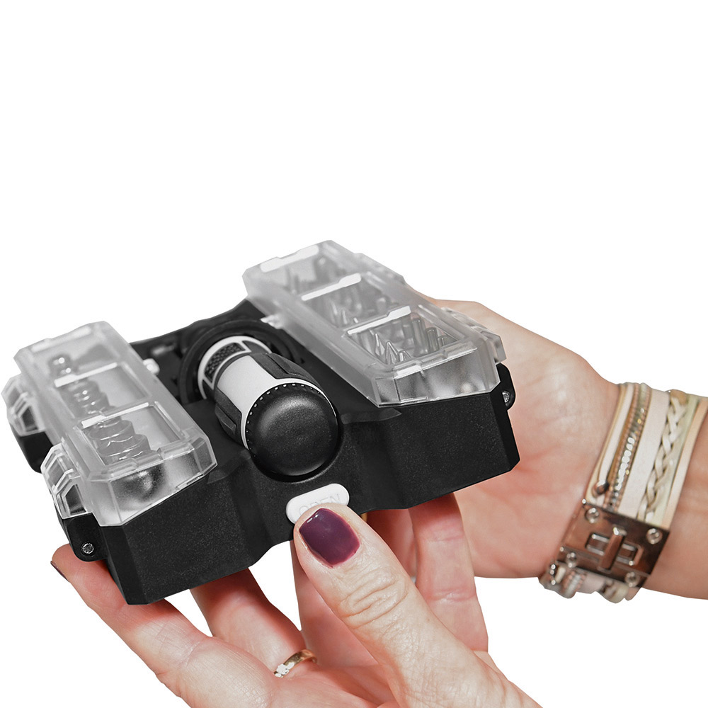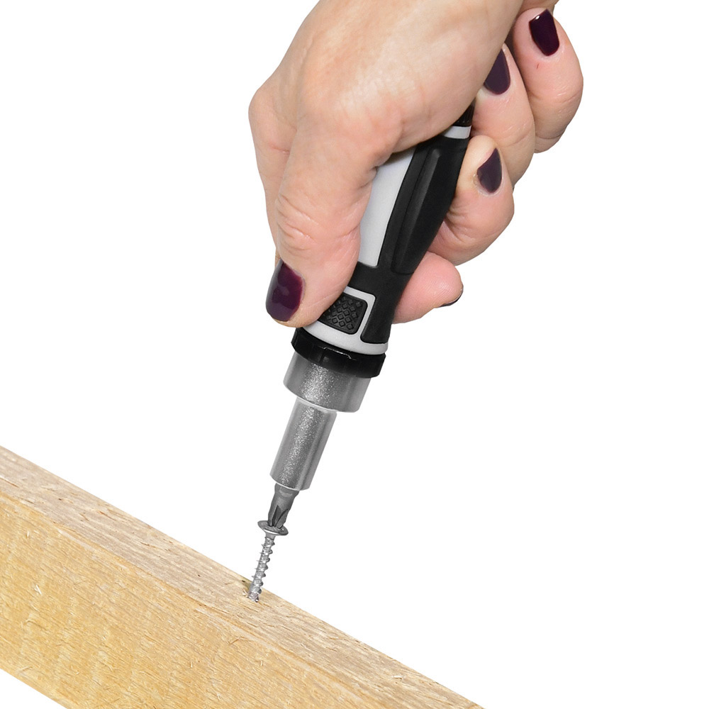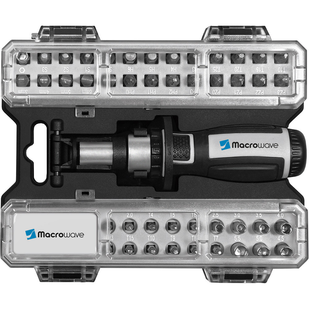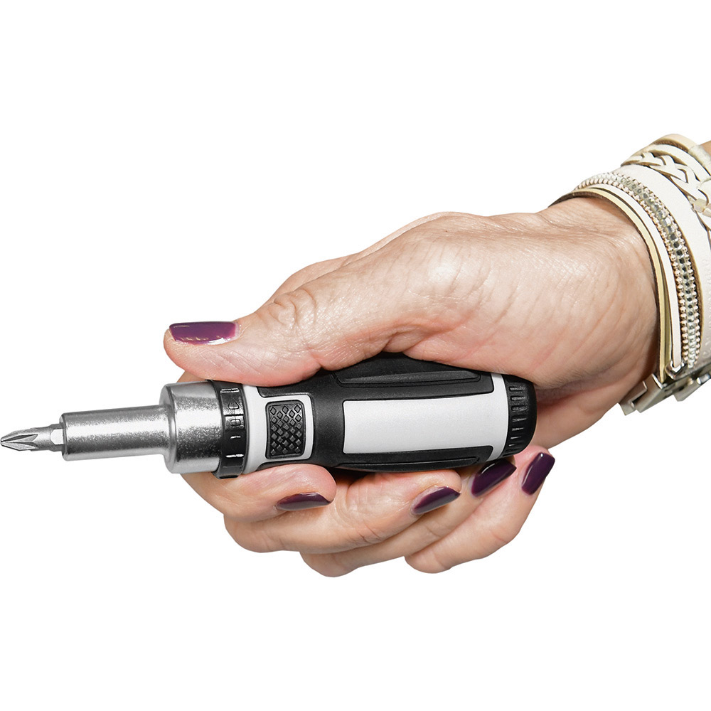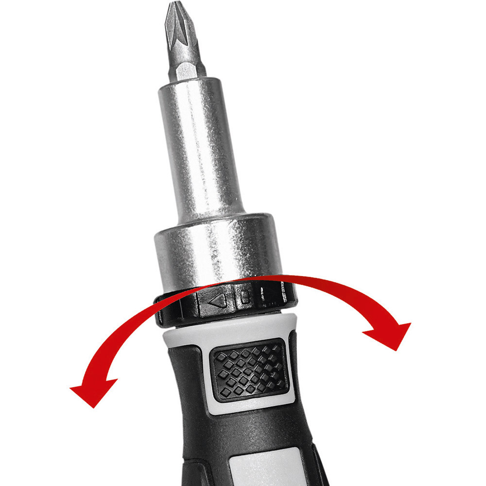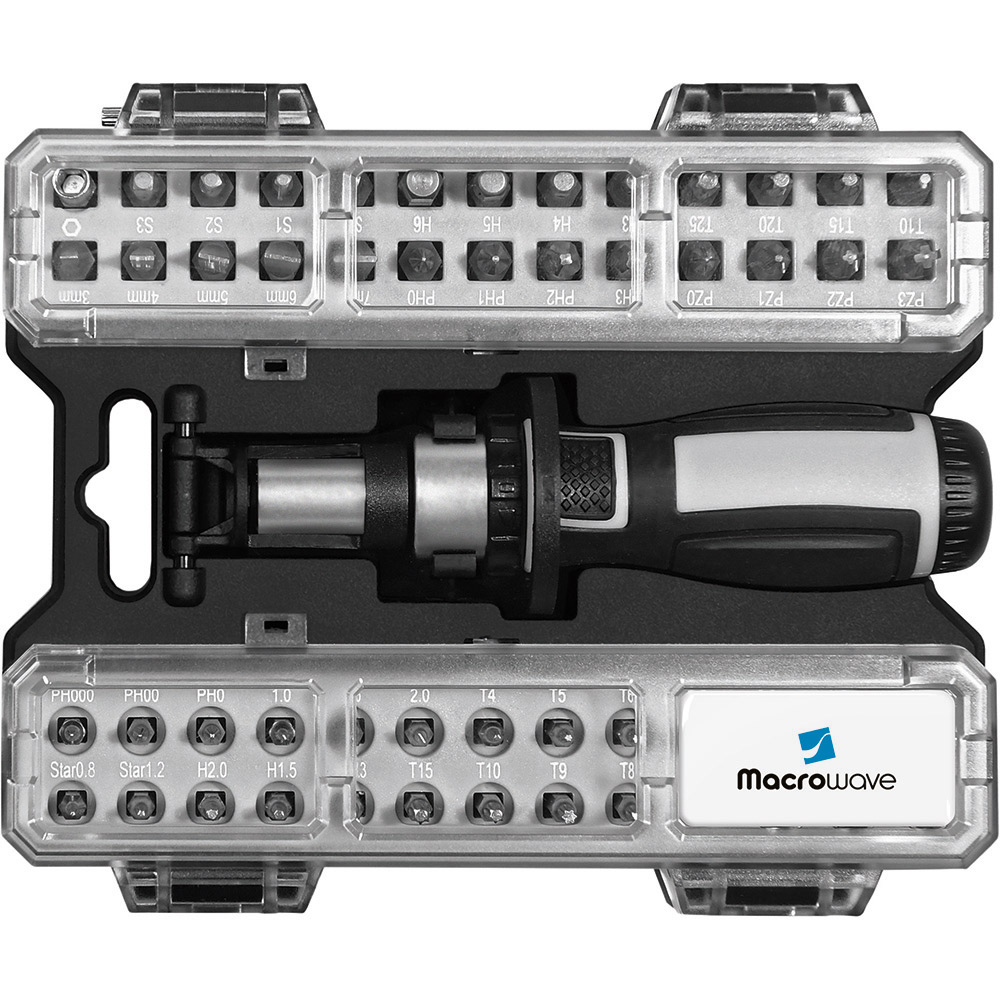 Umfangreiches Bit-Set mit praktischem Öffnungsmechanismus, Bit-Schraubendreher mit Ratsche und insgesamt 44 Bits, 7 Stecknüssen und Adapter. Material: Sammelbox aus PS und PC, Schraubendreher aus TPR / PP und Carbonstahl (Rockwell 35-48), Bits und Adapter für Stecknüsse aus CrV-Stahl (Rockwell 50-56), Stecknüsse aus Carbonstahl (Rockwell 38). Zubehör: Sammelbox mit Steckplätzen, Schraubendreher mit magnetischer Bitaufnahme (1/4") und Ratsche mit Rechts- / Linkslauf und Arretierung, 25 Bits (1/4" 6,35 mm-Sechskantschaft, 25 mm), 19 Feinbits (4 mm-Sechskantschaft, 28 mm), 7 Stecknüsse (4 mm-Sechskantschaft), Adapter für Stecknüsse, integrierte Halterungen für Box und Schraubendreher. Stecksatz: Bits (1/4" 6,35 mm-Sechskantschaft): 4 x Pozidriv: PZ0/ PZ1/ PZ2/ PZ3; 4 x Phillips: PH0/ PH1/ PH2/ PH3; 5 x Schlitz: 3/ 4/ 5/ 6/ 7 mm; 4 x TORX®: T10/ T15/ T20/ T25; 4 x Innensechskant: H3/ H4/ H5/ H6; 4 x Innenvierkant: S0/ S1/ S2/ S3; Feinbits (4 mm-Sechskantschaft): 3 x Phillips: PH000/ PH00/ PH0; 3 x Schlitz: 1,0/ 1,5/ 2,0; 8 x TORX®: T4/ T5/ T6/ T7/ T8/ T9/ T10/ T15; 3 x Innensechskant: H1,3/ H1,5/ H2,0; 2 x Stern: 0,8/ 1,2; Stecknüsse (4 mm-Sechskantschaft): 2,5/ 3/ 3,5/ 4/ 4,5/ 5/ 5,5. Verpackung: schwarze Geschenkverpackung