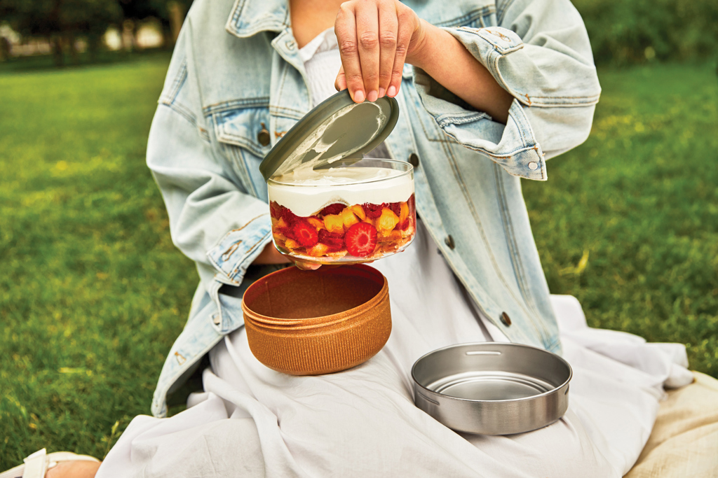 Der Silikondeckel verhindert Spritzer beim Mikrowellenkochen, und der Bodenbehälter besteht aus haltbarem Polypropylen in Kombination mit nachhaltig gewonnenen Holzfasern, die die Glasschale schützen und dafür sorgen, dass sie nach dem Mikrowellenkochen leicht zu halten ist. Der Deckel aus rostfreiem Stahl wird auf den Boden geschraubt, um ihn dicht zu verschließen. Spülmaschinenfest, wobei ein eventeller Logodruck einer Spülmaschinenwäsche jedoch nicht standhalten wird.
