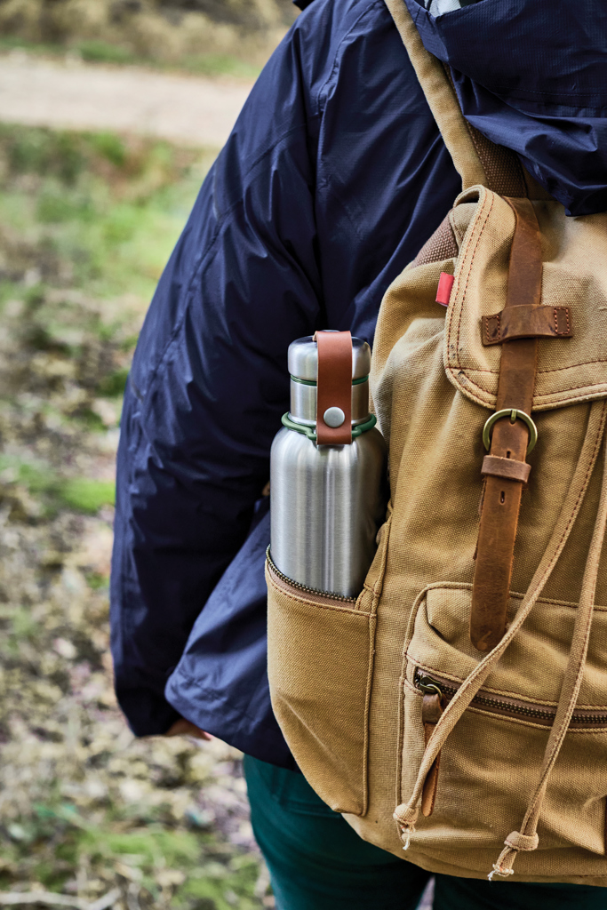 Die isolierte Wasserflasche aus Edelstahl ist eine elegante, vakuumisolierte Flasche, die Getränke bis zu 24 Stunden lang kalt oder bis zu 12 Stunden lang heiß hält. Auch der Deckel ist komplett aus Edelstahl, so dass das Wasser nicht mit Plastik in Berührung kommt. Das Kunstleder dient als Trageschlaufe und ist gleichzeitig ein hübsches Designdetail. Nur Handwäsche
