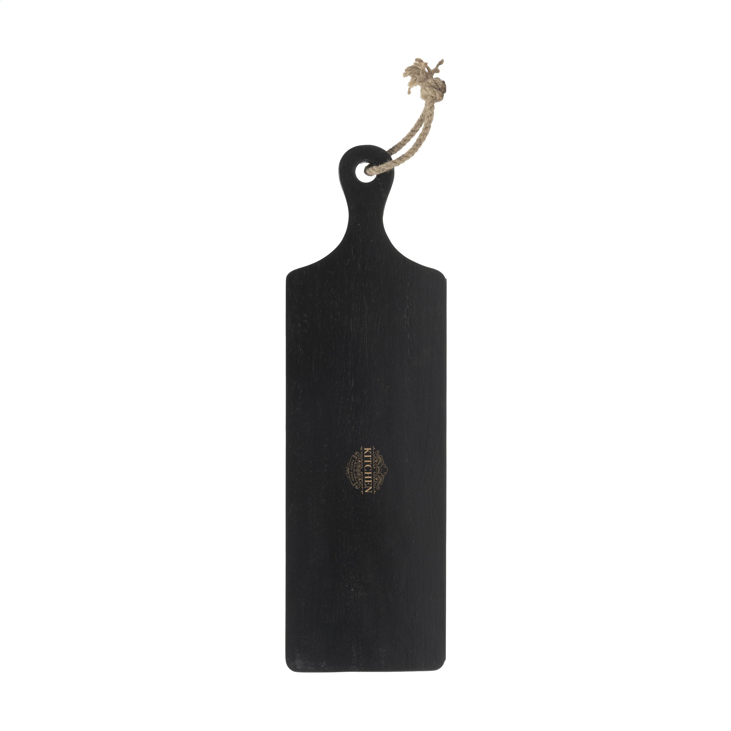 Servierbrett mit Zierkordel. Das Brett ist aus starkem Gummibaumholz gefertigt und mit einer schicken schwarzen Lackierung versehen. Ideal für die Verwendung als Tapas-Brett, wobei die Appetithäppchen einen schönen Kontrast zum schwarzen Hintergrund bilden, aber auch als Schneidebrett geeignet.