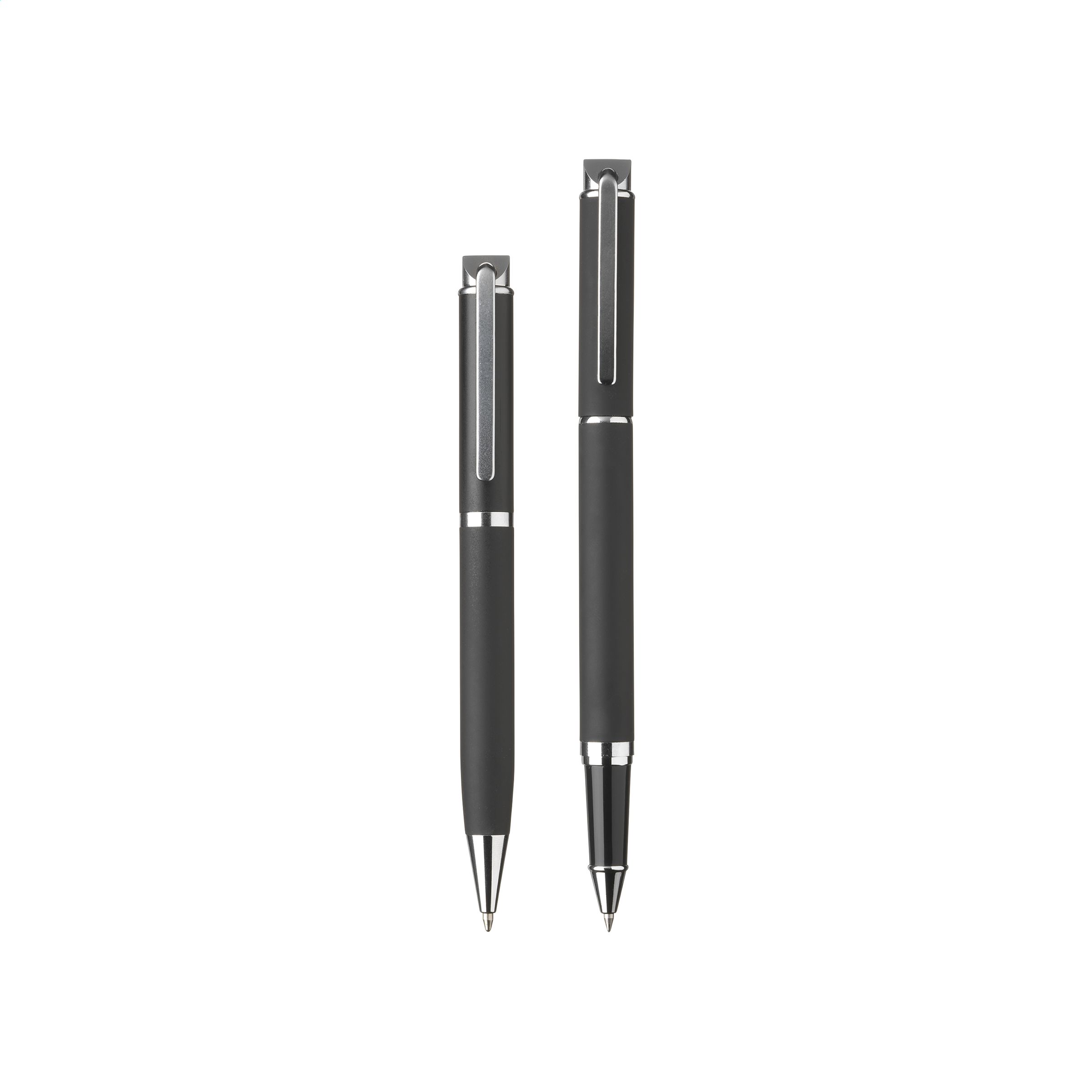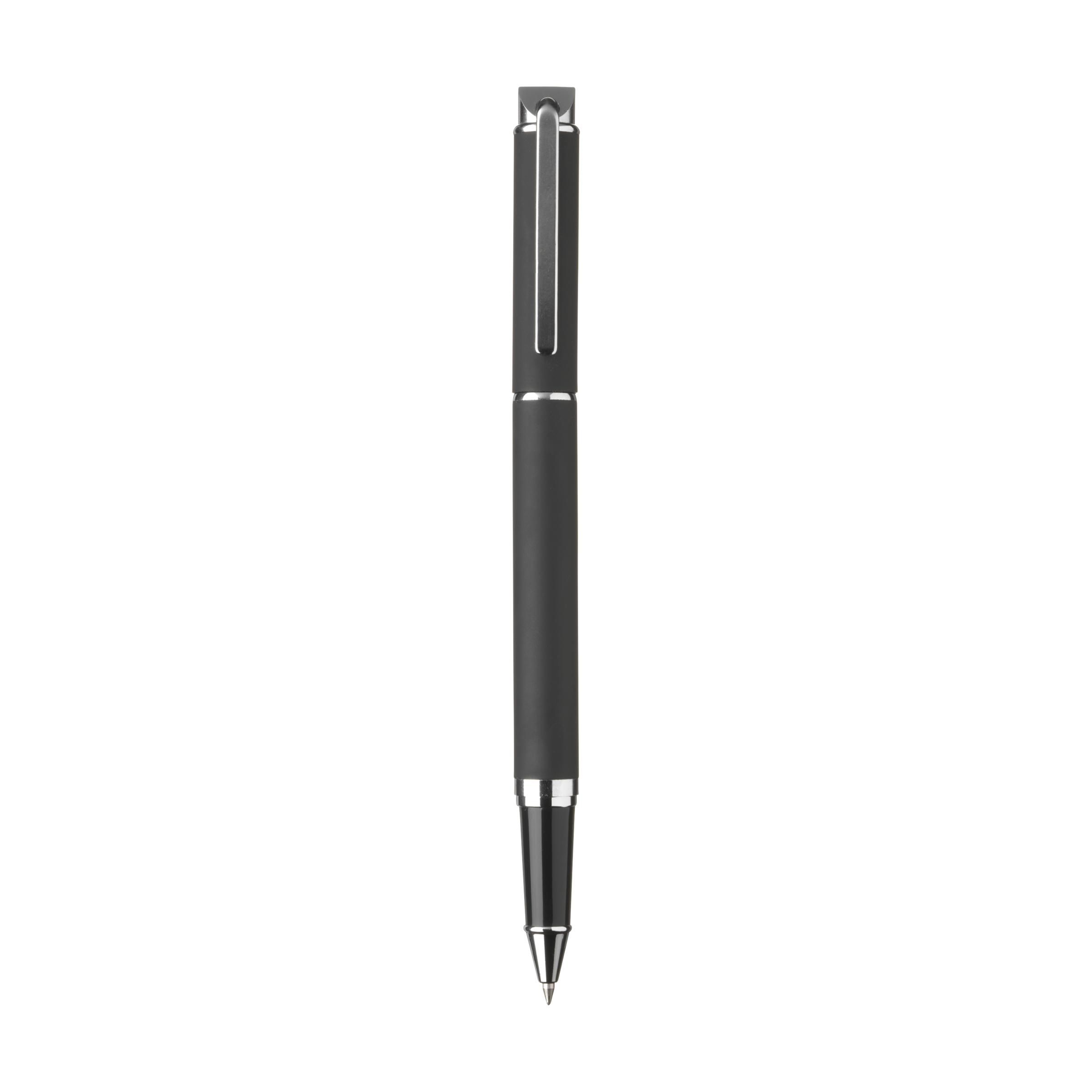 Schickes, metallenes Schreibset: Blauschreibender Kugelschreiber und Fineliner mit schnelltrocknender blauer Tinte. Beides mit stylischem gummierten Abschluss, Clip und hochglänzenden Akzenten. Pro Set in einer Verpackung.