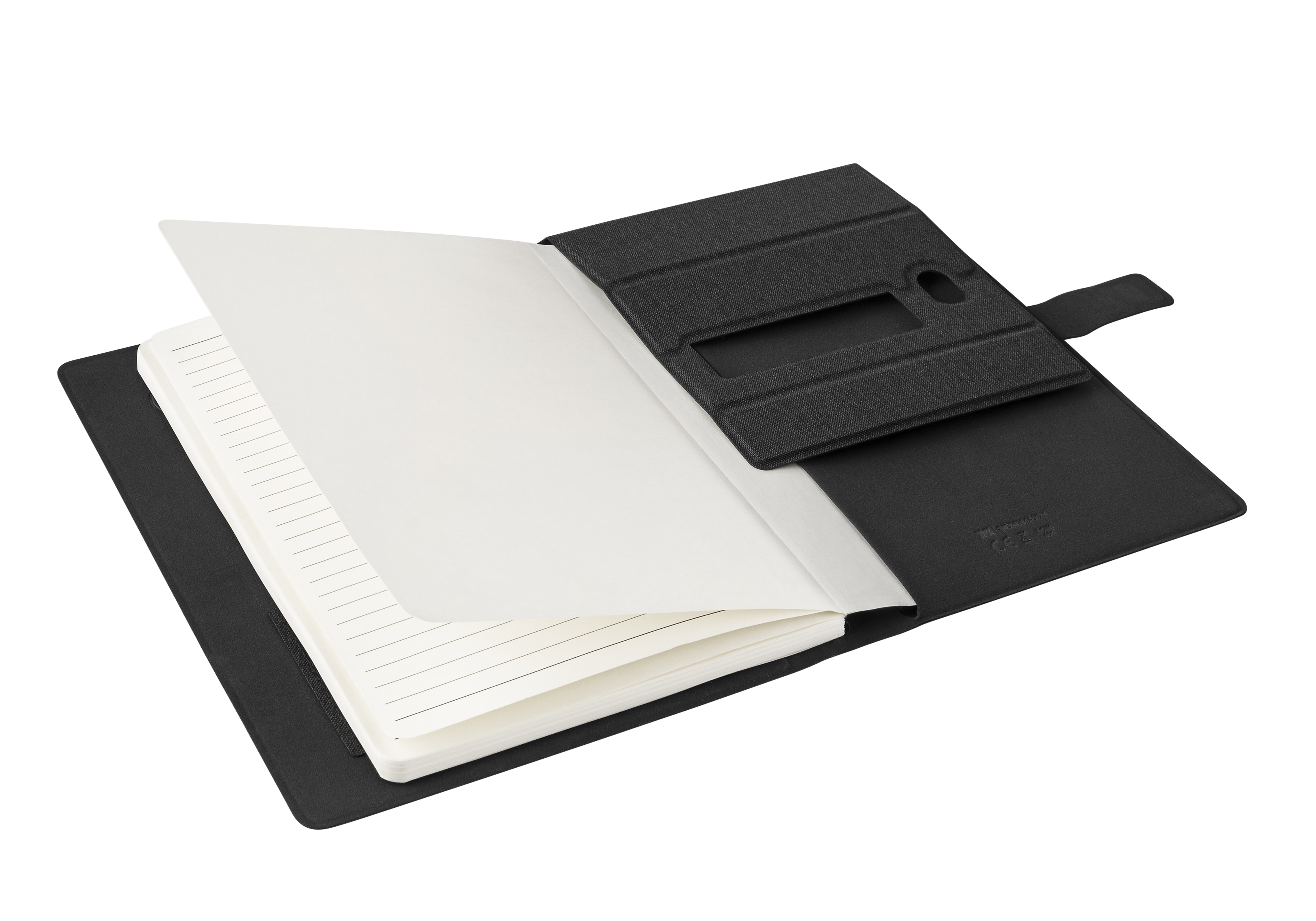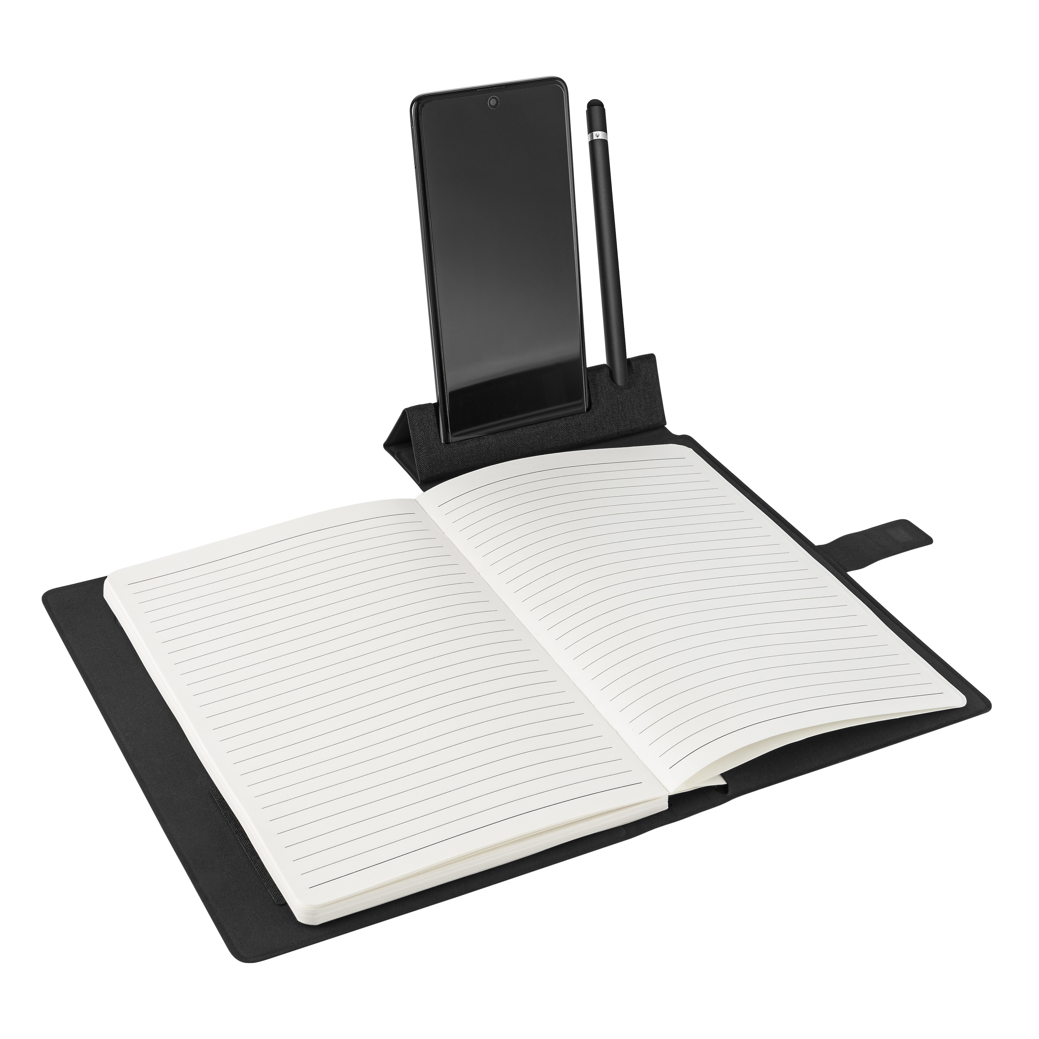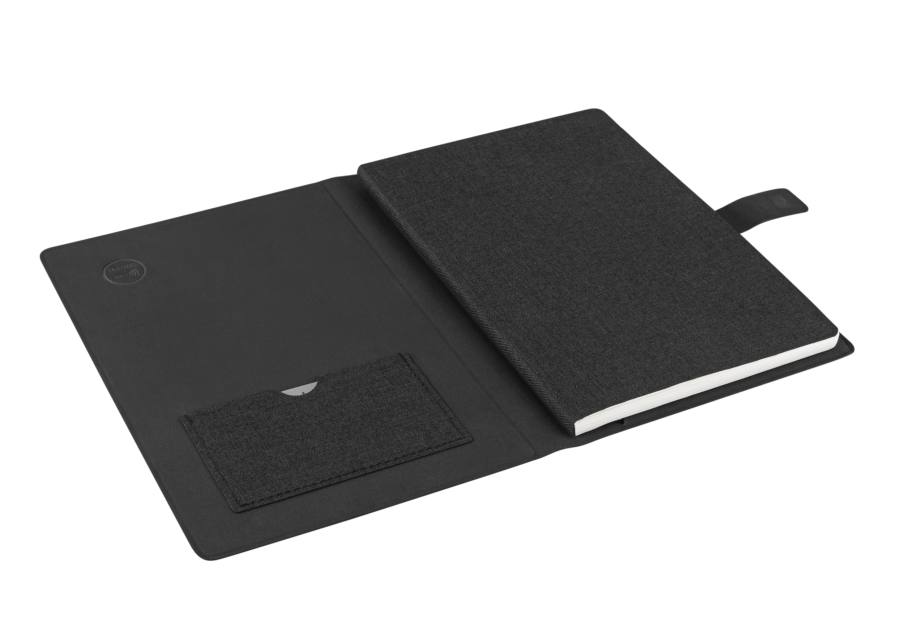 Digital meets Classic – NFC-Business & Travel Mobile Office Notebook (Safe the planet: Metropolitan Material aus recycelten PET-Flaschen), ( Recycling Anteil 5% ) mit praktischem aufstellbarem Handy / Touchpenorganizer, A5 Schreibblock (50 Seiten, austauschbar), digital: auf dem integrierten NFC-Chip kann Ihre individuelle Webseite sofort aufrufbar für den Kunden hinterlegt werden, mit edler Magnetschließe. Recycling PET Oberfläche Notebook und Block, 50 S. linierter Block (austauschbar), Visitenkartenfach, NFC-Chip, VPE 40. NonWoven Tasche