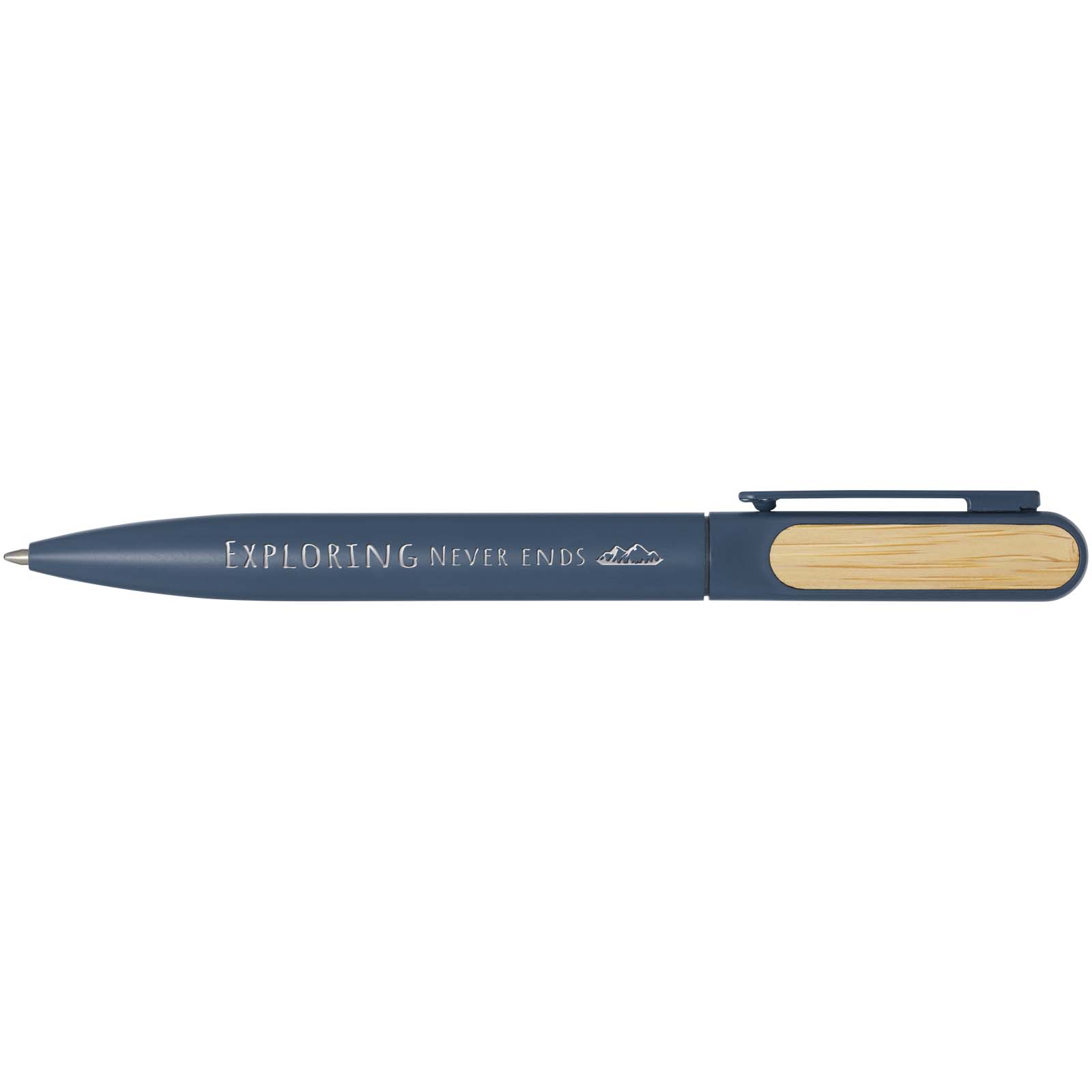 Der Blanca Kugelschreiber hat einen oberen Schaft aus recyceltem Kunststoff mit einer farbigen Sprühbeschichtung und Bambusaccessoires auf beiden Seiten. Der untere Teil des Schafts besteht aus recyceltem Aluminium mit einer farbigen Pulverbeschichtung. Tintenfarbe: Schwarz. Schreiblänge: 400 Meter. Strichstärke: 1,0 mm.