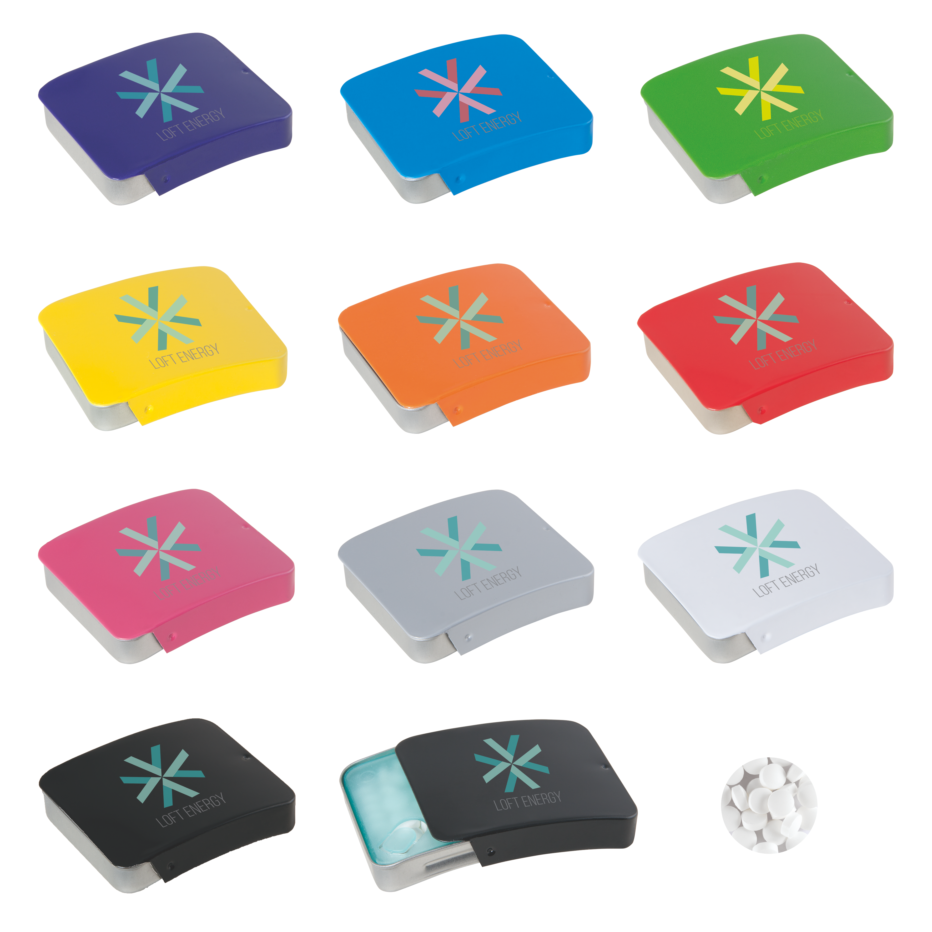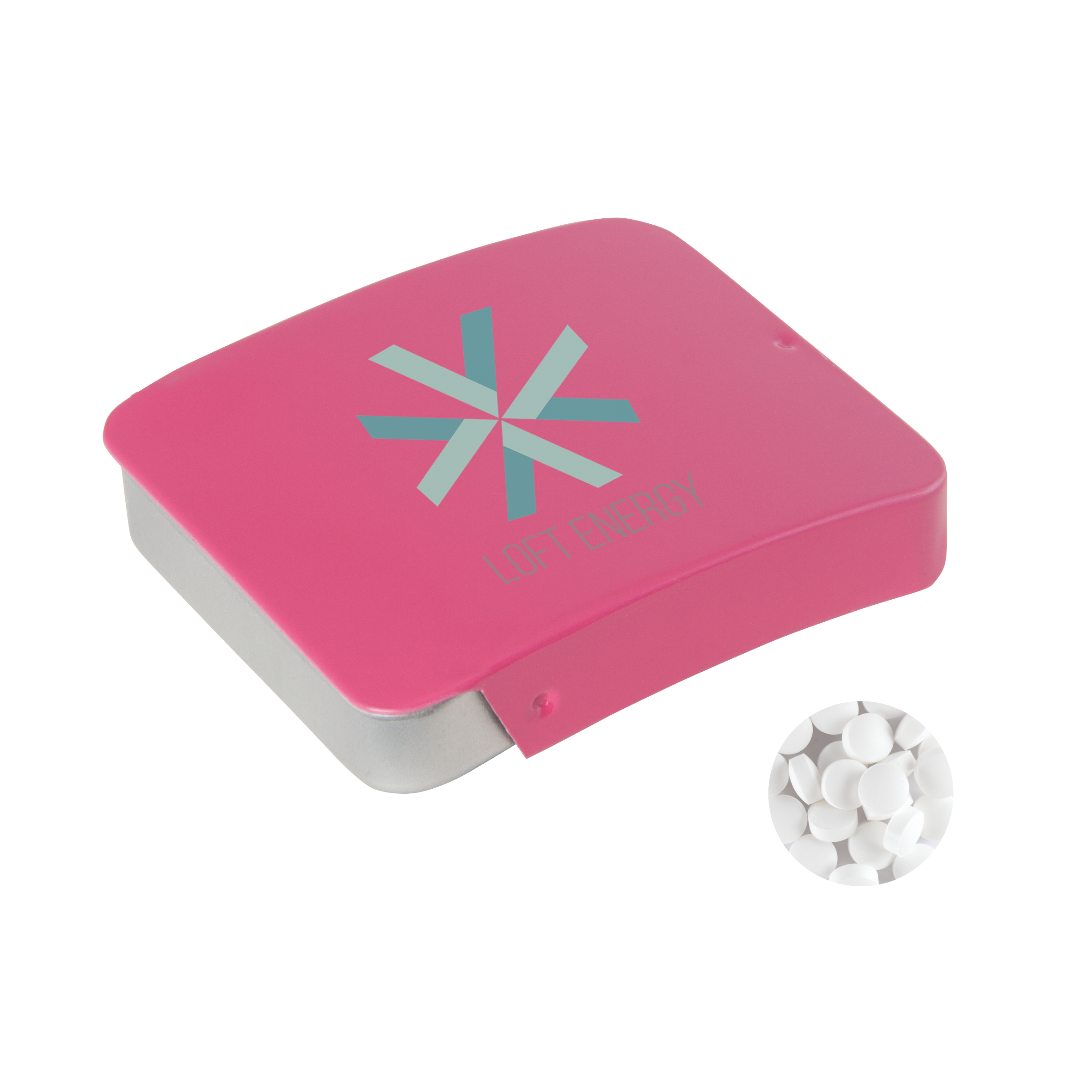 Blechdose mit Schiebedeckel 54 x 45 x 11 mm mit ca. 10 gr. extra strong Minties `Triangle`, verfügbar in mehreren Farben.