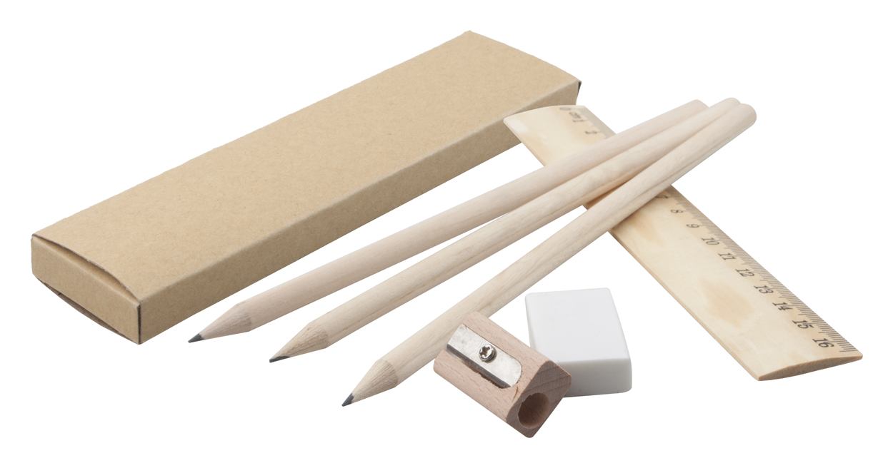3 Bleistifte mit Lineal, Spitzer und Radiergummi in einer Pappschachtel.