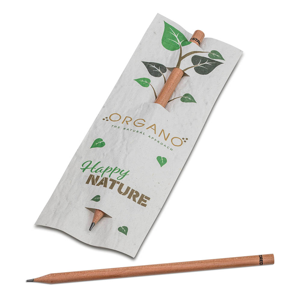Schreiben, werben und wachsen in einem: Ein Bleistift, dessen Etui eingepflanzt werden kann. Der Bleistift, im individuell bedruckbaren Stecketui aus Samenpapier, ist eine echte Besonderheit. Dieses einzigartige Werbemittel vereint Umweltbewusstsein und Kreativität mit einem hochwertigen Stift des renommierten Markenherstellers Staedtler. Der Bleistift wird nach höchsten Qualitätsstandards in Deutschland produziert und besteht aus zertifiziertem, naturbelassenem Holz. Im Samenpapier des Etuis befinden sich verschiedene Samensorten. Zur Auswahl stehen Blumenmischung, Mohn, Margerite, Kräutermischung, Kopfsalat, Karotte, Basilikum und Kresse. Nach Gebrauch kann das Etui einfach eingepflanzt werden.