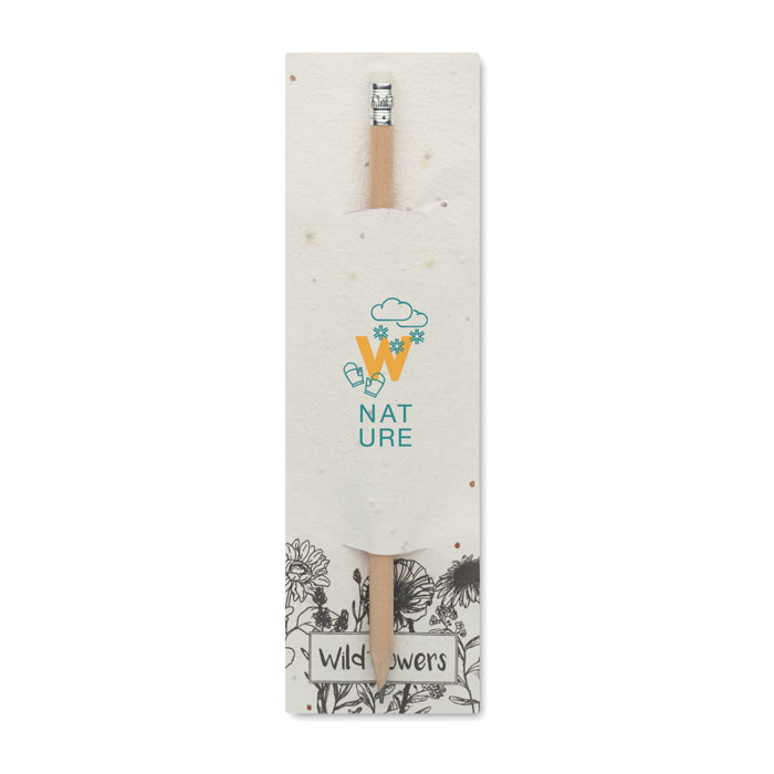 Naturbelassener Bleistift mit Radiergummi. Lieferung in Einsteckhülle aus Samenpapier (Wildblumen). Hergestellt in der EU.