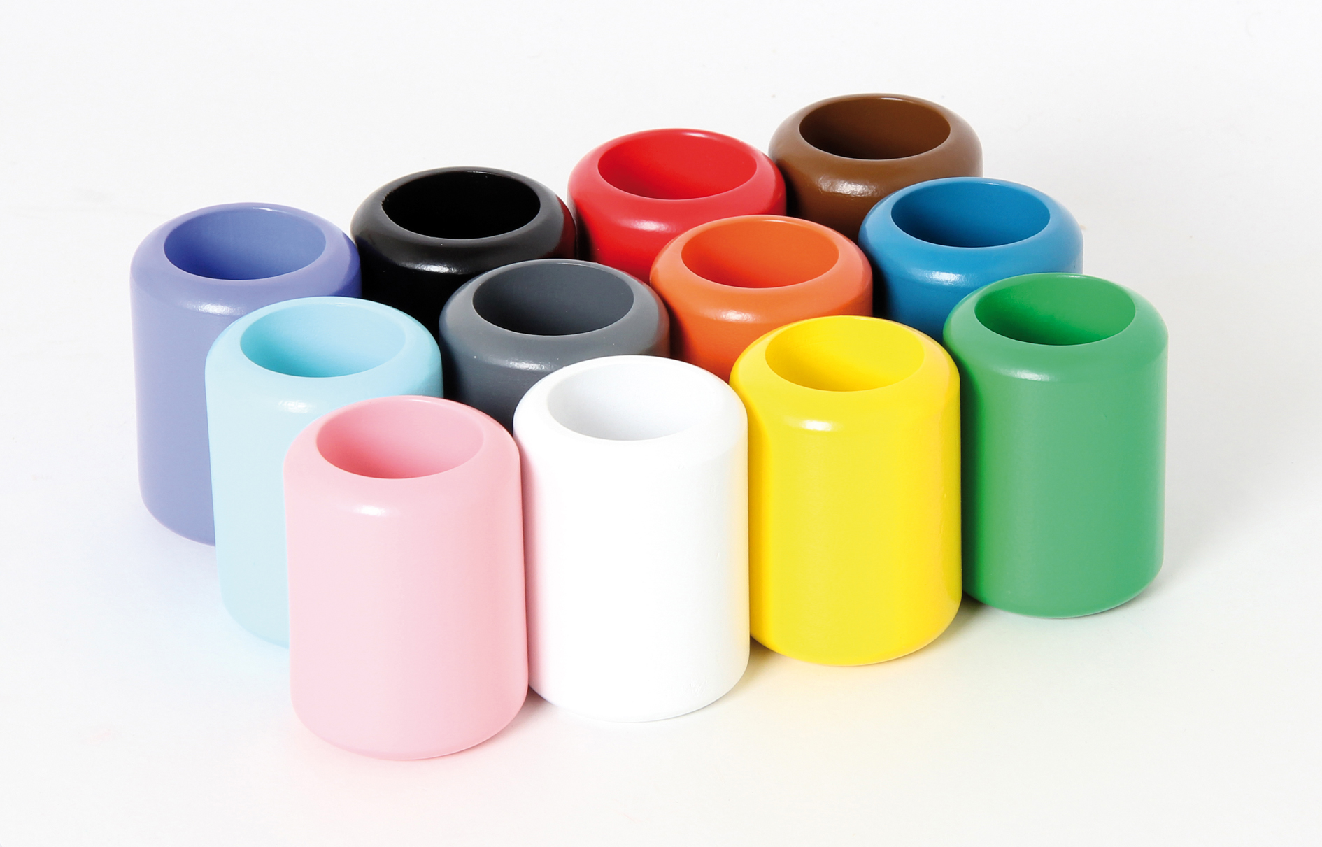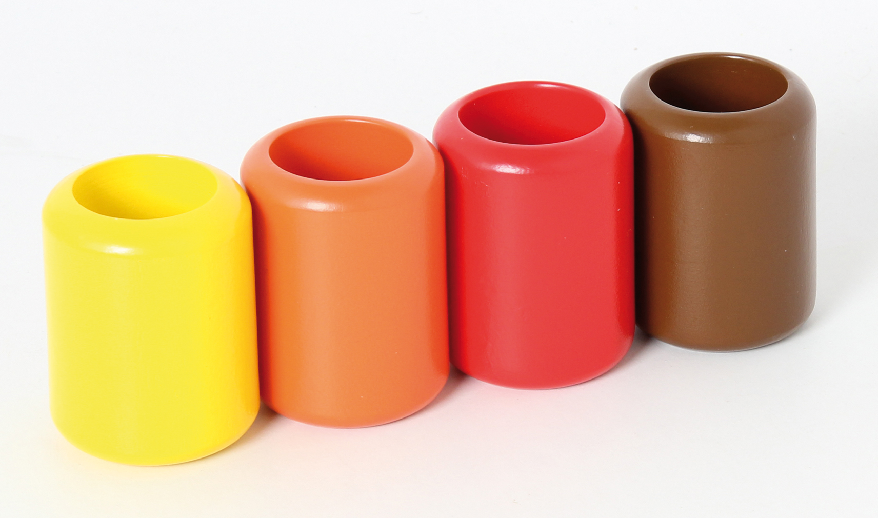 Zwölf farbige Bleistiftständer aus Holz für die Arbeit mit den Metallenen Einsatzfiguren, Art.-Nr. 109633, und anderen Schreib- und Malaktivitäten. Ohne Buntstifte! Größe eines Bleistiftständers: 6,5 x 5 x 5 cm.