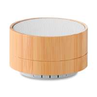 Kabelloser Lautsprecher in einem Gehäuse aus Bambus und ABS-Kunststoff mit Freisprechfunktion und eingebautem Akku. Inklusive USB-Ladekabel.