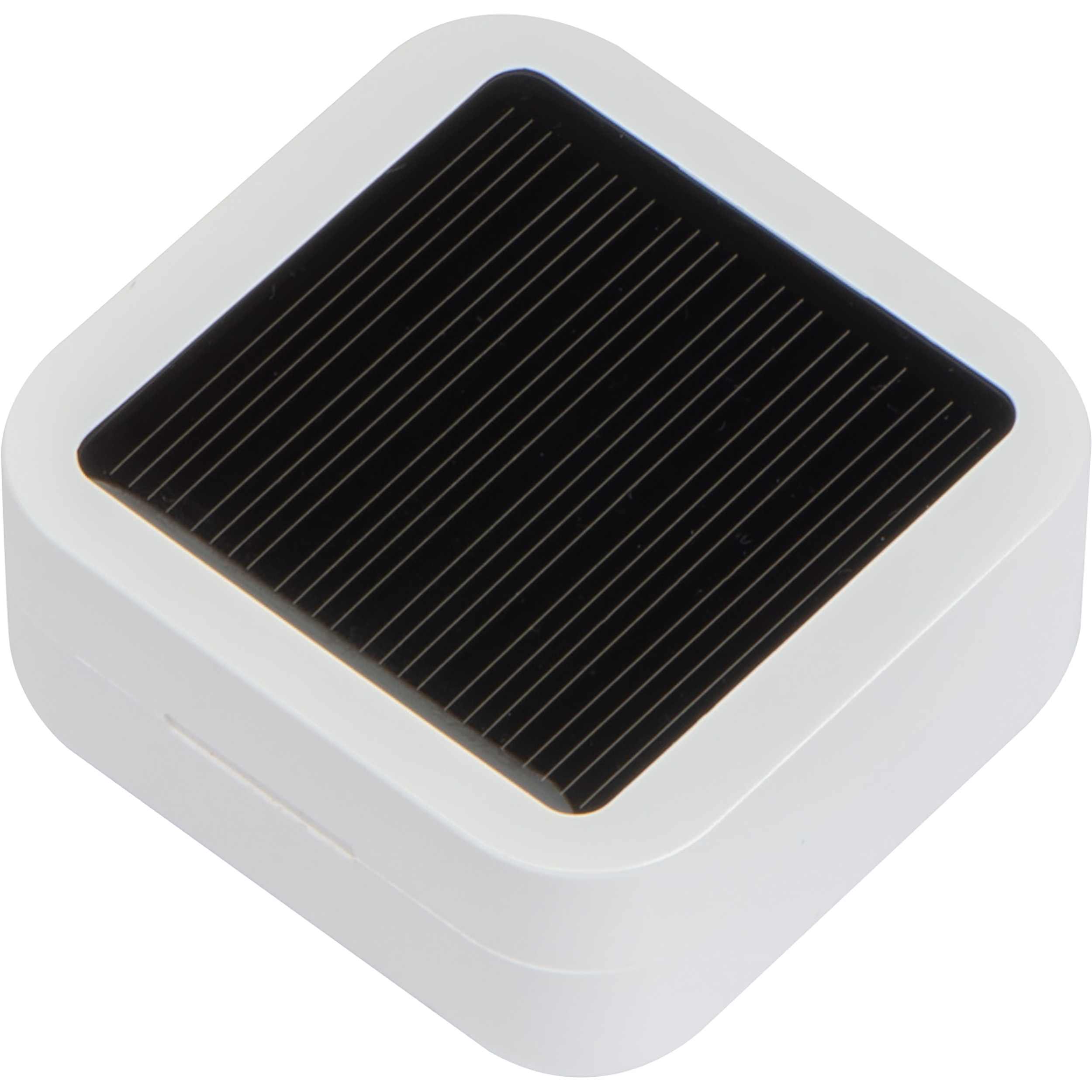 In-Ear Bluetooth Kopfhörer mit Ladestandsanzeige und Ladestation. Diese kann entweder über das Solarfeld im Deckel oder über das Ladekabel (im Lieferumfang enthalten) geladen werden. Akku: 35mAh, Laufzeit: 2-3 Stunden, Ladezeit mit Kabel: ca. 1 Stunde, Ladzeit mit Solarfeld: ca. 4 Stunden. Ihre Werbung wird auf der Unterseite der Box angebracht.