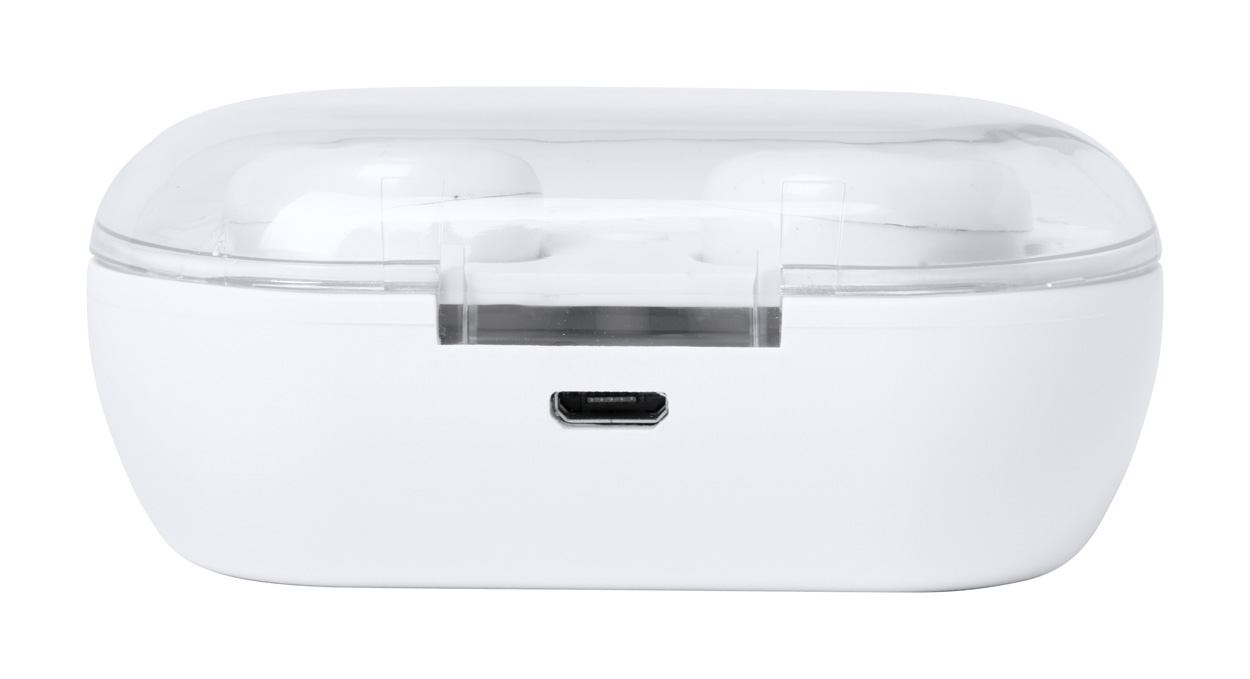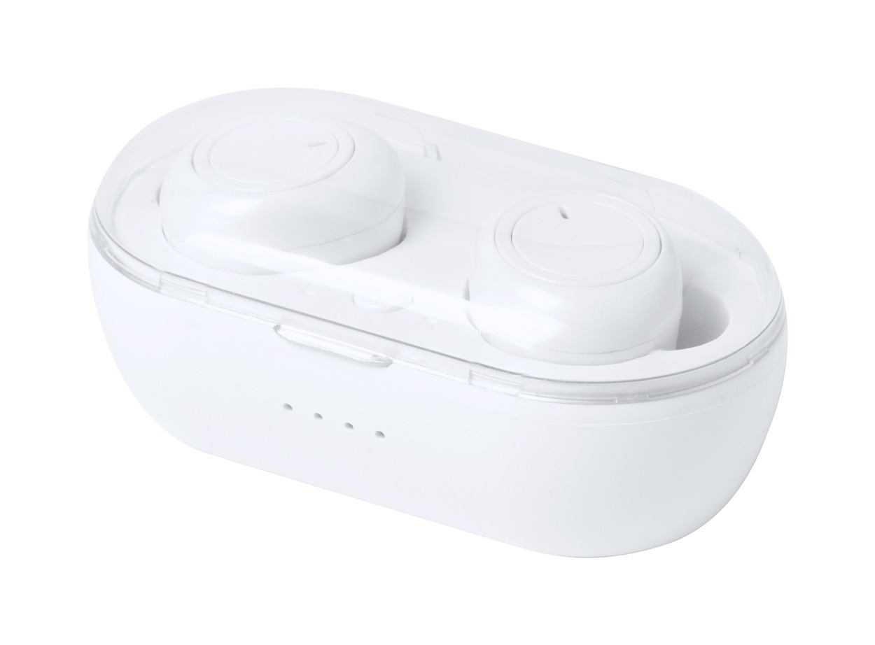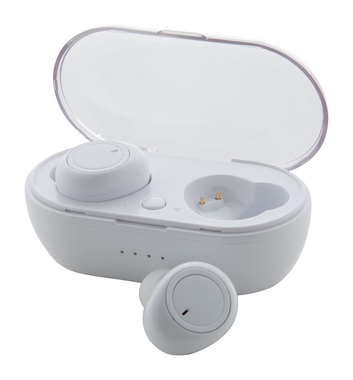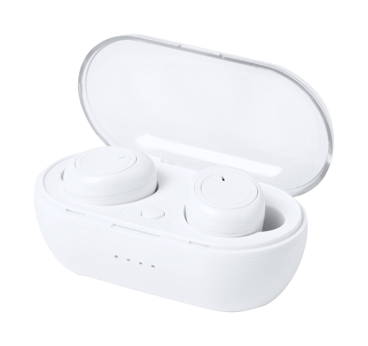 Echte kabellose Stereo-Ohrhörer (TWS) mit Freisprechfunktion im Kunststoff-Ladeetui. Inklusive USB-Ladekabel.
