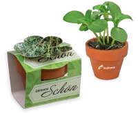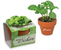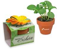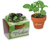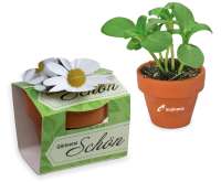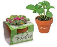 Kleine Pflanzengefäße, Saatgut-Sets oder Mini-Sträuße mit begleitender Werbebotschaft auf Banderolen, Etiketten oder Karten. Im Fokus stehen hier Wachstum, Pflege und sichtbare Entwicklung.