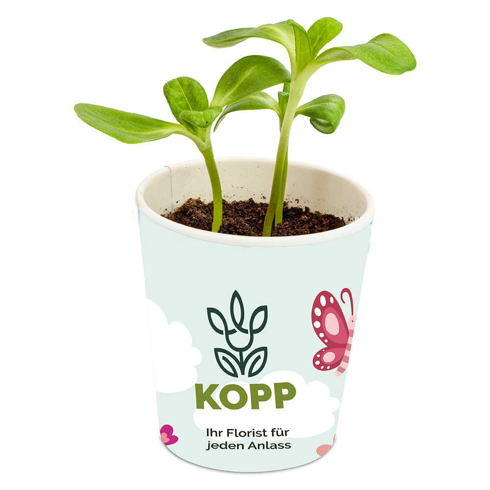 Unser frühlingshaft gestalteter Pflanzbecher ist ein nachhaltiges Giveaway mit besonderem Charme. Der wasserdichte Pappbecher ohne Kunststoff ist liebevoll bedruckt und enthält alles, was man für eine farbenfrohe Blumenwiese benötigt: eine Substrattablette als Erde sowie eine Sommerblumenmischung oder einen Samen nach Wahl. Die rundumlaufende Banderole im frischen Design bietet eine leicht verständliche Pflanzanleitung. Lassen Sie Ihre Werbebotschaft aufblühen – mit einer Blumenwiese, die Freude schenkt. Die Varianten: • Standardausführung: Ab Lager lieferbar, optional mit zusätzlichem Logoeindruck. • Individuelle Gestaltung: Ab 2.500 Stück mit personalisierten Außenseiten für ein einzigartiges Design.